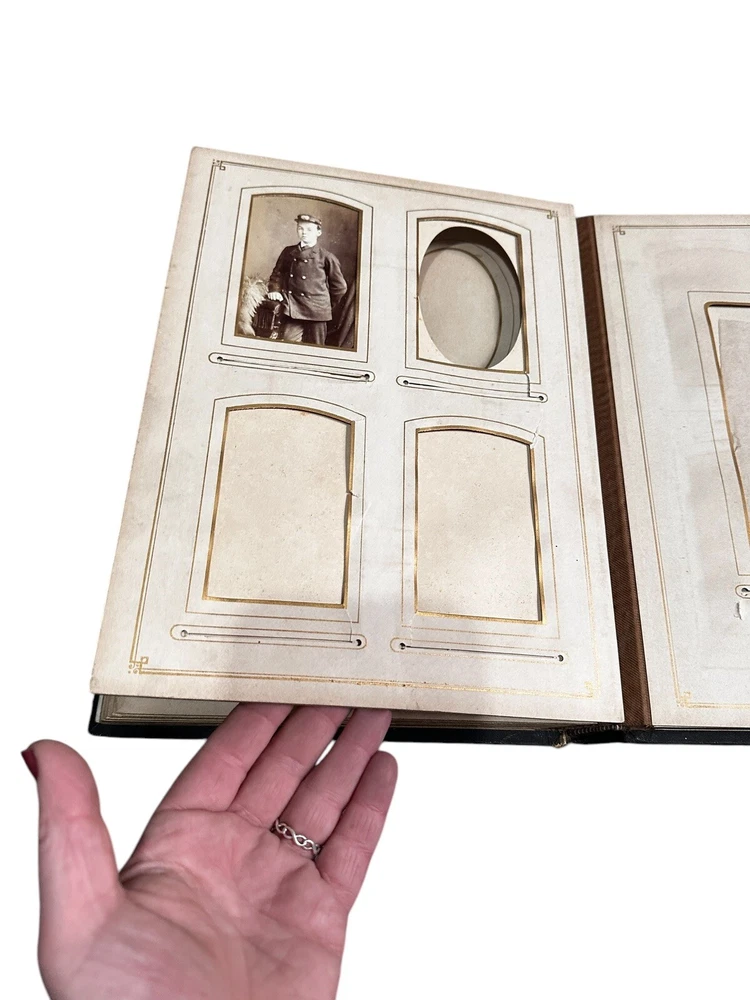 Please do view pictures for condition you will see there is some minor damage to the leather bounding and overall age related wear but still a very beautiful album that measures 29 cm x 22 cm and a th...