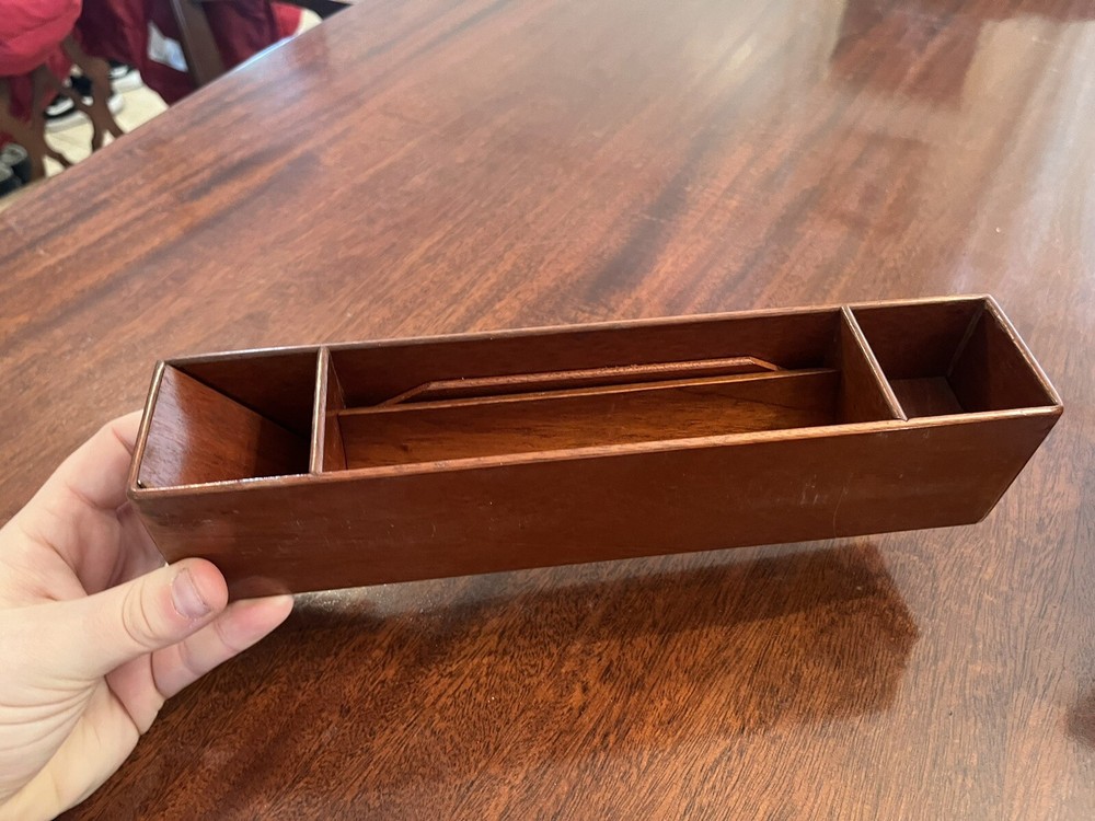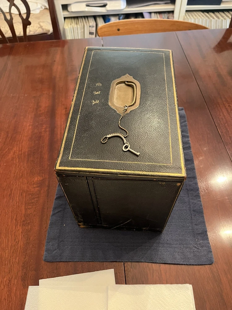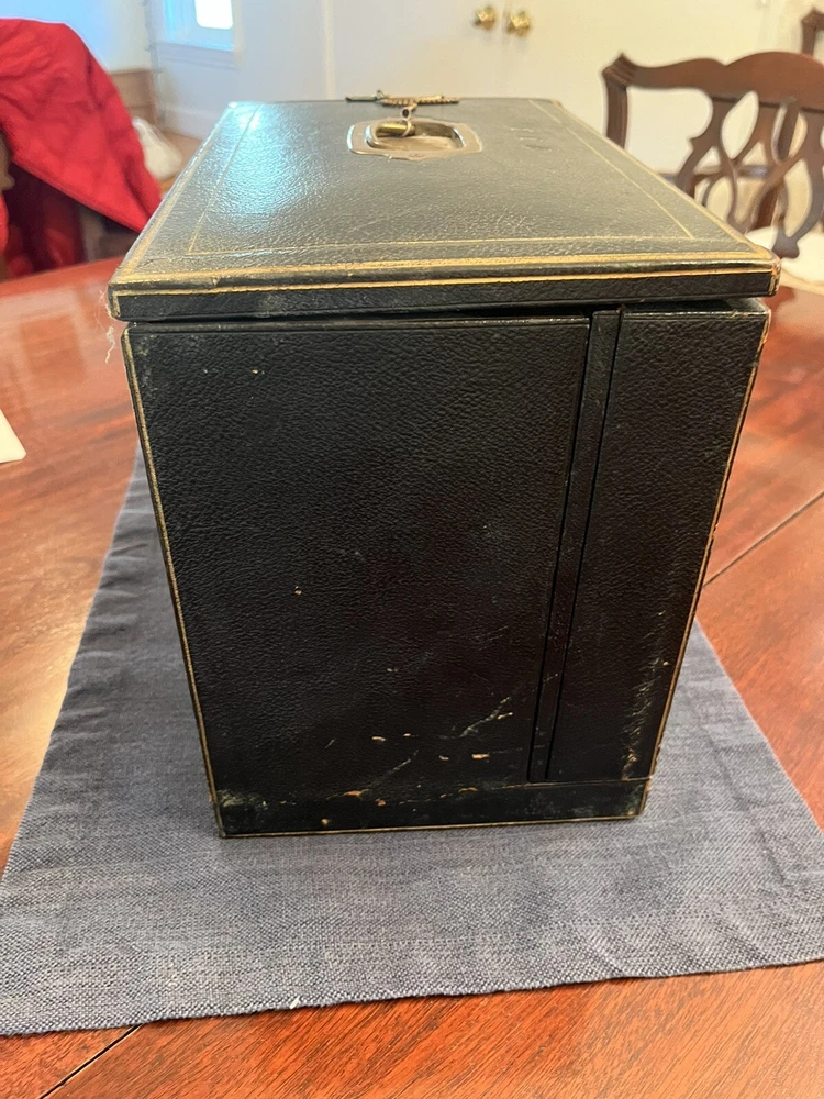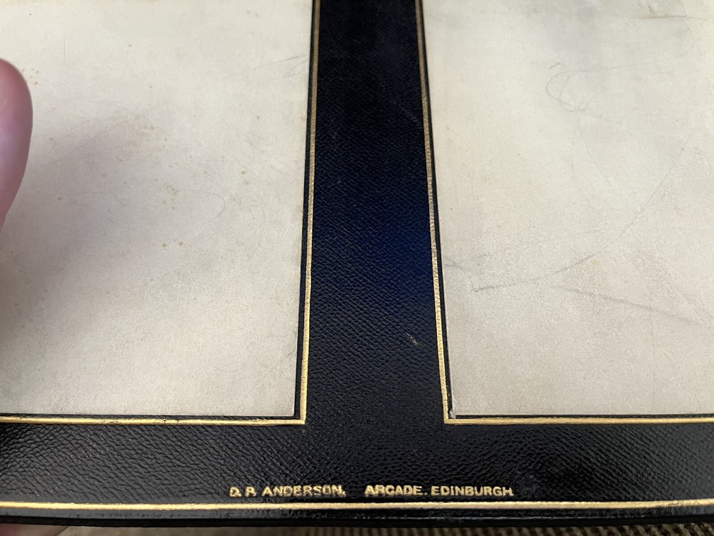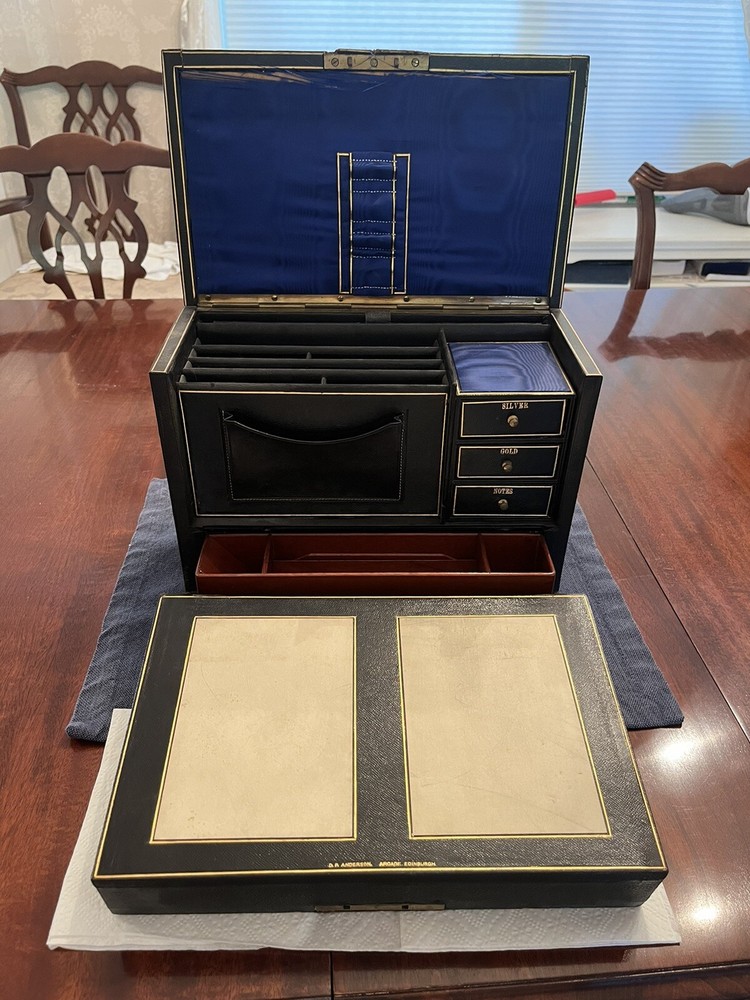 Circa 1890. Purchased in London in 1968 A fantastic 19th century ladies stationary chest. Of a superior quality build with an updated lock and key installed, which is delicate but functional! Has initials embossed onto top, we think it’s G.J.A. and the maker of the box is embossed on base “D.A. Anderson, Arcade Edinburgh” Depth: 7.25” Height: 9.5” Width: 12.25” The box looks pretty much unused and has been very well looked after. The fitted interior has: Fold down writing slope with underside storage. Hard writing boxes for minimal damage to box during writing. Automatic opening wooden drawer when the writing slope is folded down for glass inkwell. The original leather bound matching notebook that fits in the back compartment. Three small storage drawers embossed with - Notes, Gold, Silver. A great desktop item for anyone wanting that antique look.