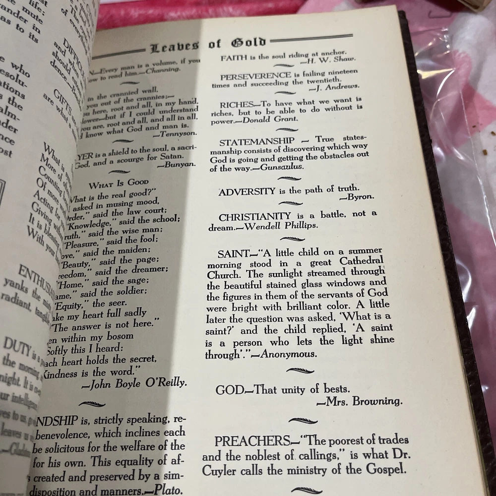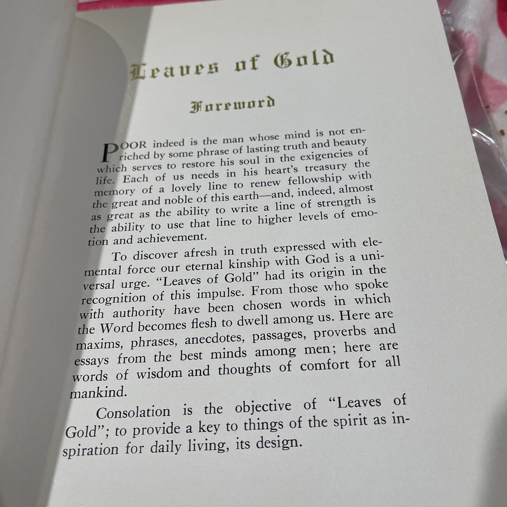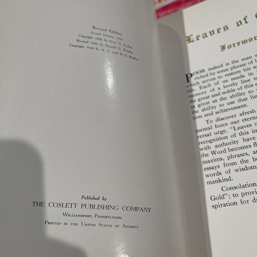 Delve into the spiritual treasury of "Leaves Of Gold," a vintage compilation that harmoniously blends prayers, phrases of inspiration, and prose. Reverently curated by The Coslett Publishing Company, this 1948 edition is a testament to the enduring power of faith and wisdom. Crafted with a luxurious leather binding, it’s a tactile treasure that invites readers to immerse themselves in an anthology of religious inspiration. Immerse yourself in the rich tapestry of devotion and reflection that is as relevant today as it was at the time of its publication. This original piece, printed in 1945 and hailing from Pennsylvania, speaks to the core of spirituality and is a collector's gem for enthusiasts of both religion and literature.