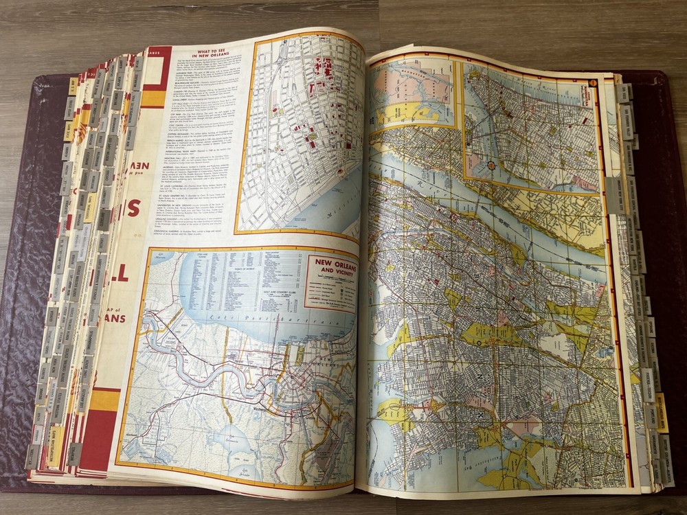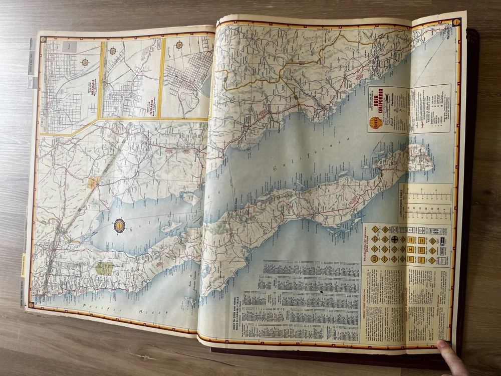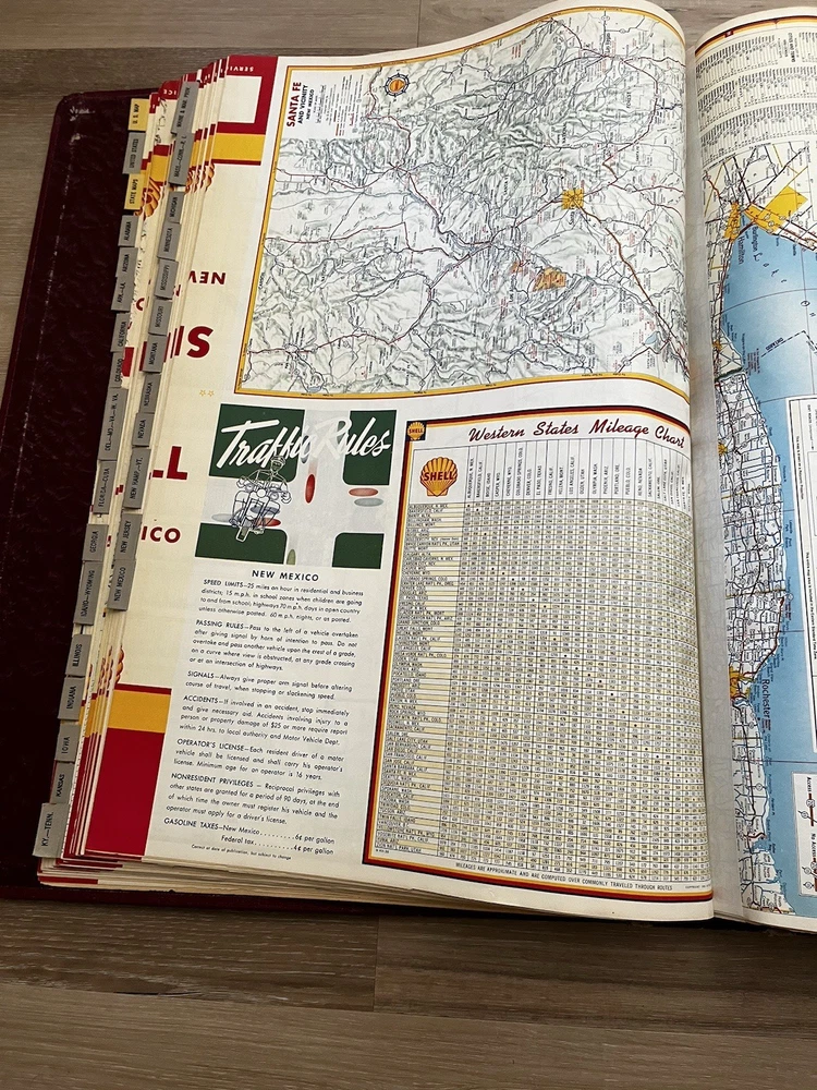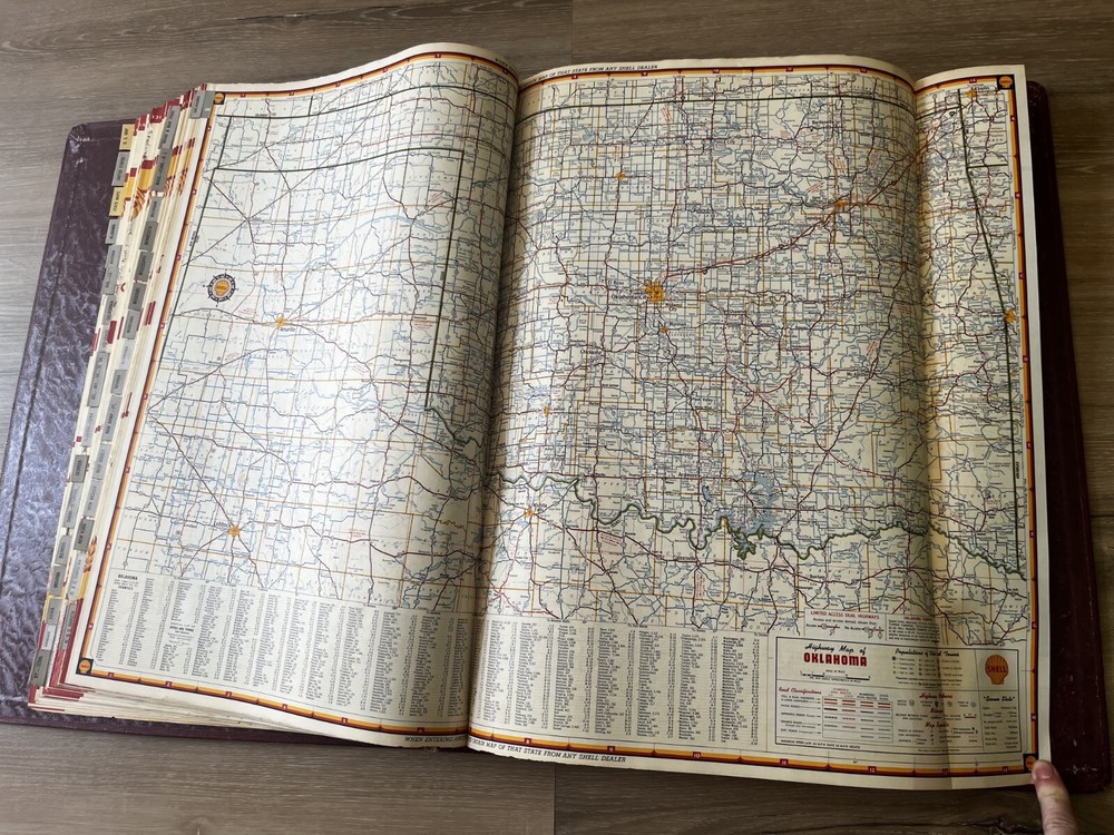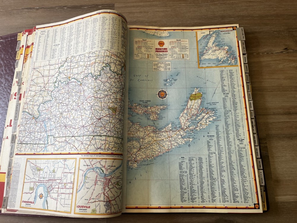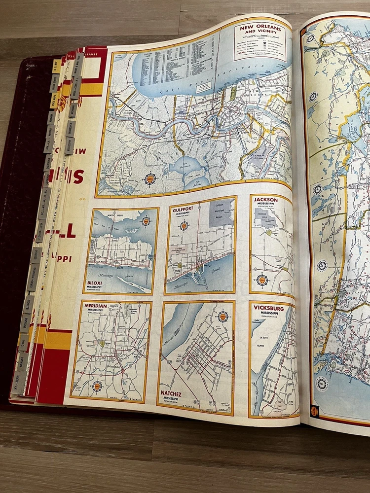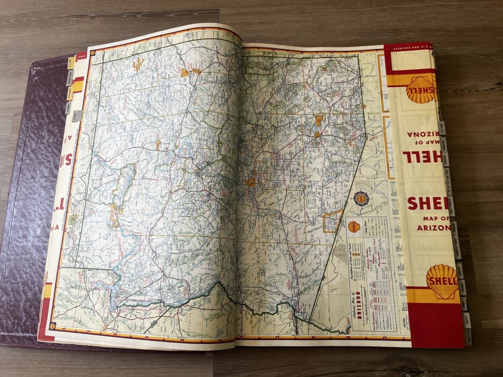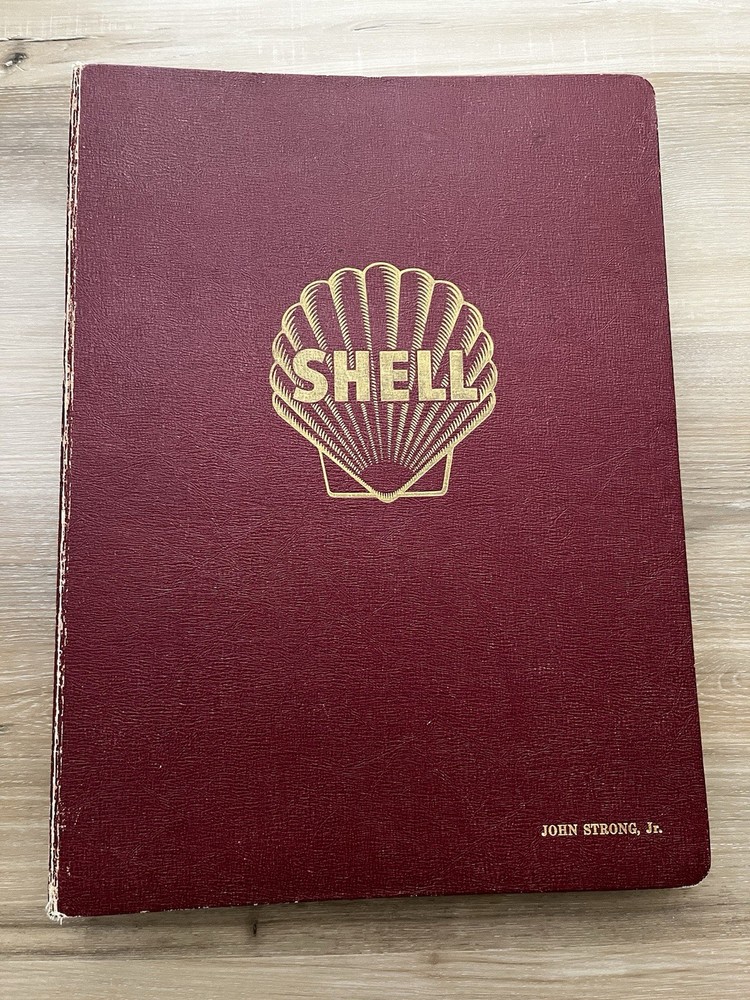 Vintage Shell Oil Company large book of maps. It has state maps, territorial maps, and metropolitan maps. It has maps of all the states and a few of Mexico and Canada. Several of the maps fold out. It is in good shape but there is some wear due to age like on the edge of the pages. Is is inscribed to John Strong Jr on the front bottom corner. The book is 18 1/2 inches long, by 13 3/4 inches wide and 2 1/4 inches tall.