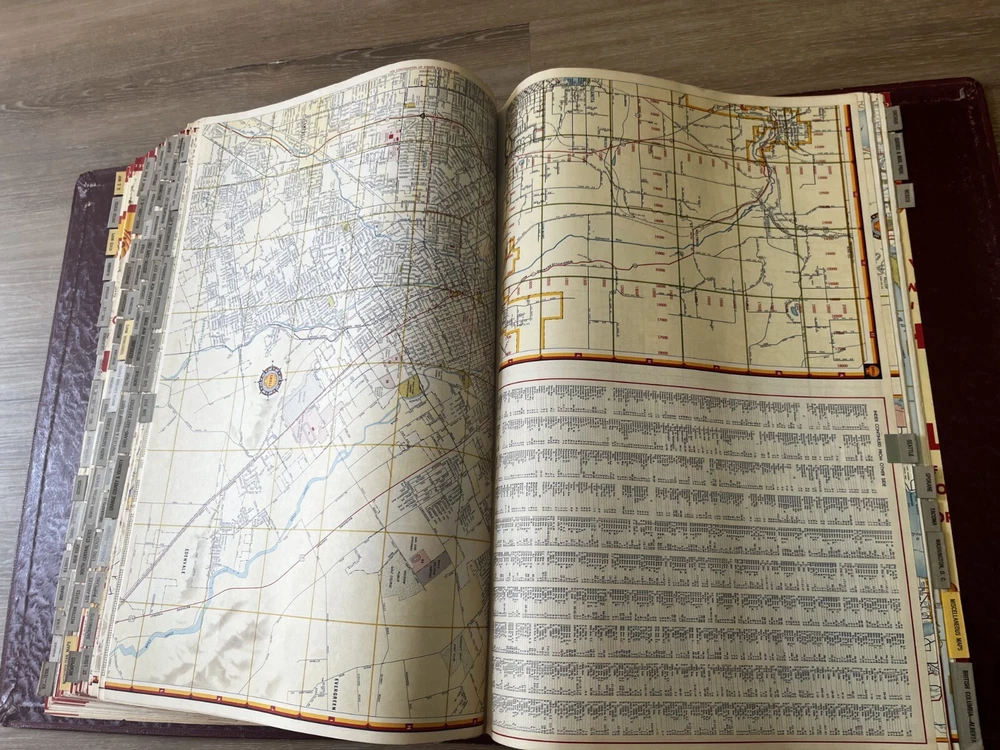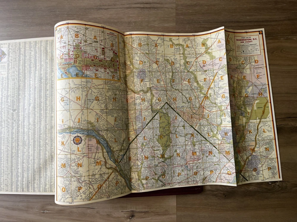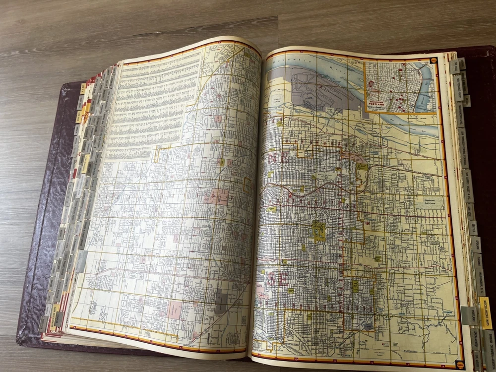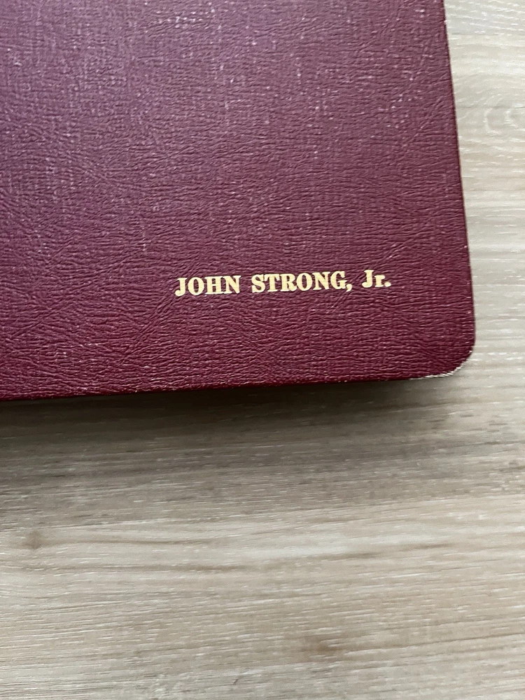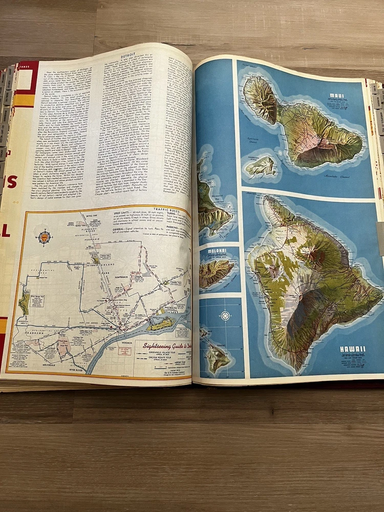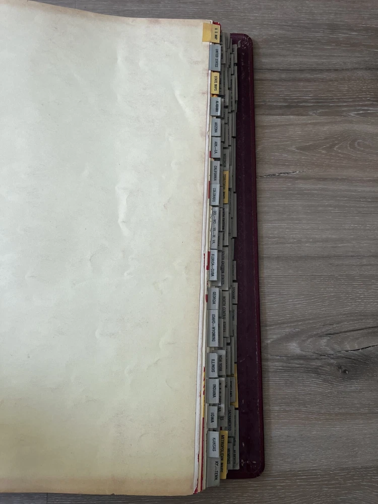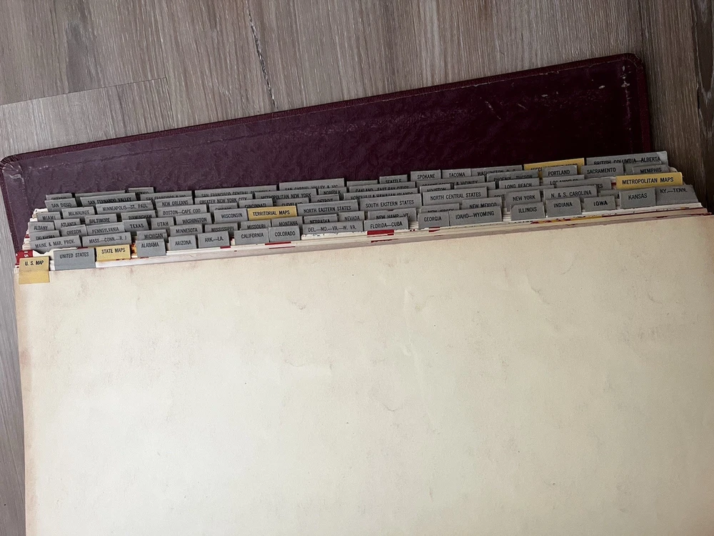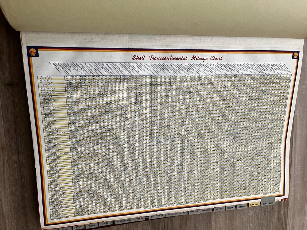 Vintage Shell Oil Company large book of maps. It has state maps, territorial maps, and metropolitan maps. It has maps of all the states and a few of Mexico and Canada. Several of the maps fold out. It is in good shape but there is some wear due to age like on the edge of the pages. Is is inscribed to John Strong Jr on the front bottom corner. The book is 18 1/2 inches long, by 13 3/4 inches wide and 2 1/4 inches tall.