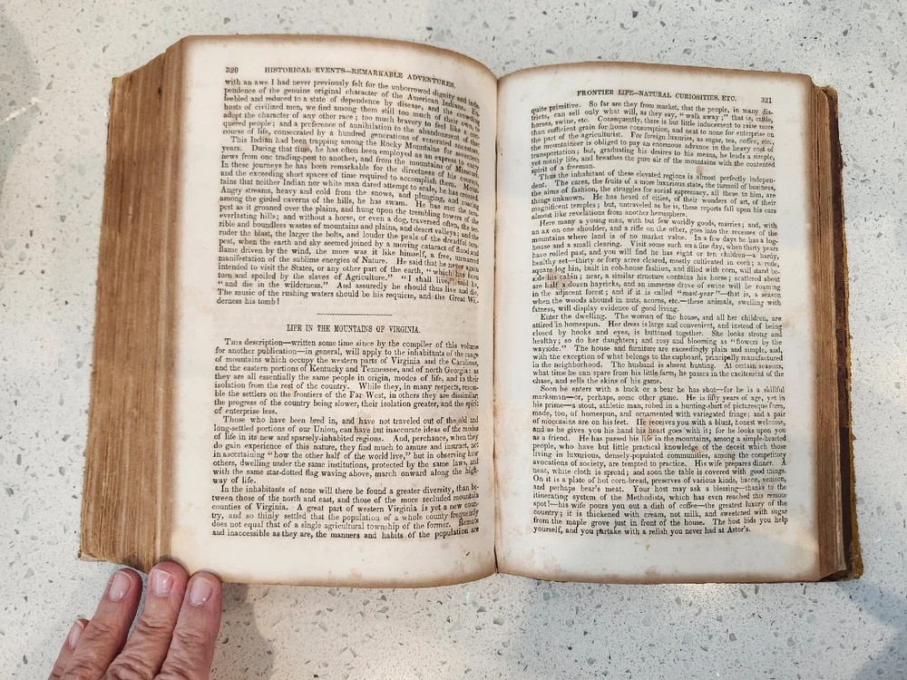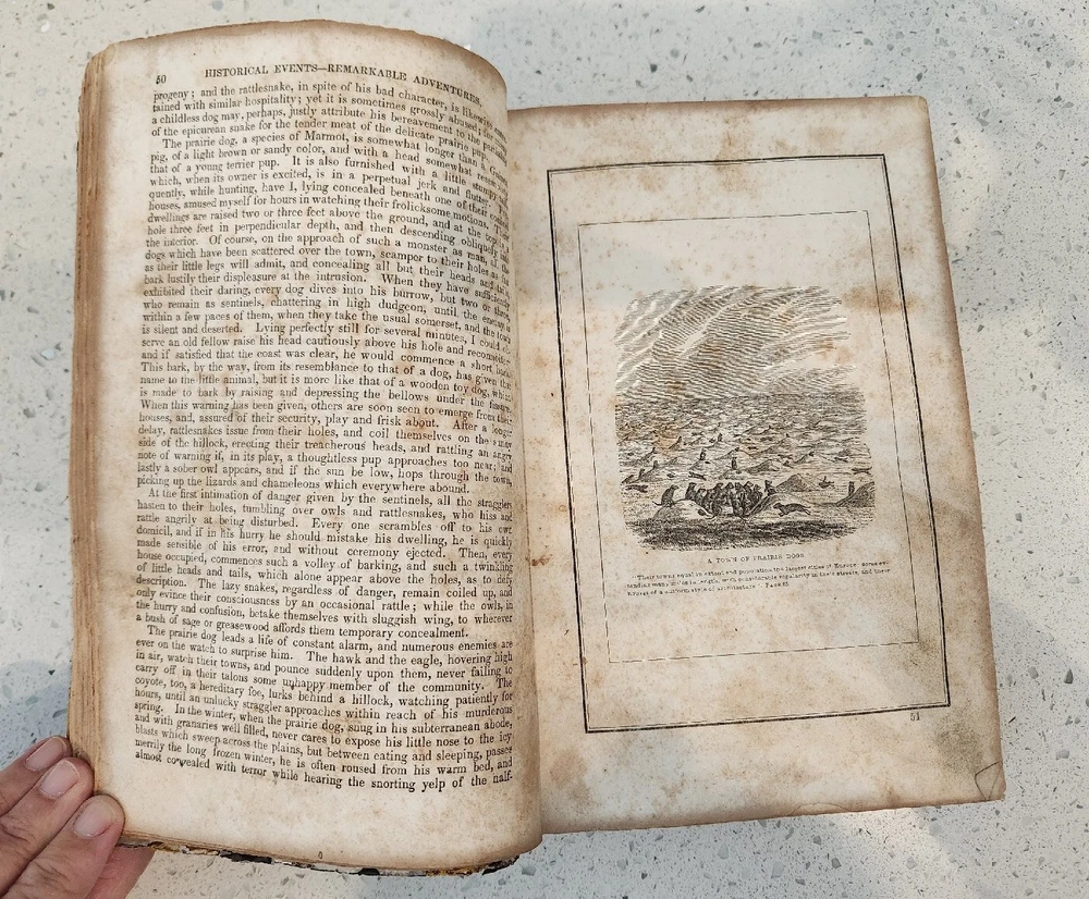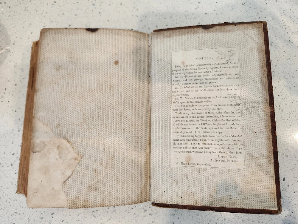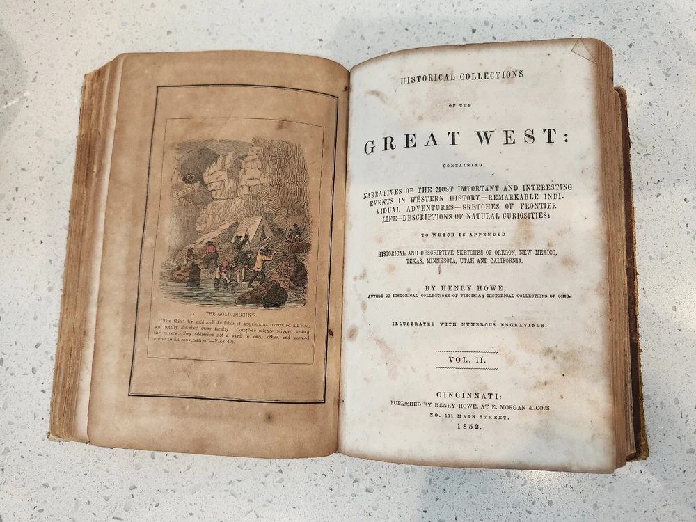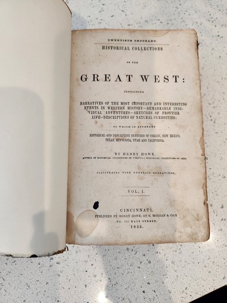 Vintage Book HISTORICAL COLLECTIONS OF THE GREAT WEST by Henry Howe, copyright 1852, Vols 1 and 2 in single binding. This book is Hardcover but only the back of leather cover is still attached so long ago the book was rebound in a dark brown vinyl like cover. Please see all photos for yourself. Very readable and enjoyable collectors item. Pages have brown spots and some edges are frayed. Lots of illustrations. Shipped Media Mail. Check out my other items too!