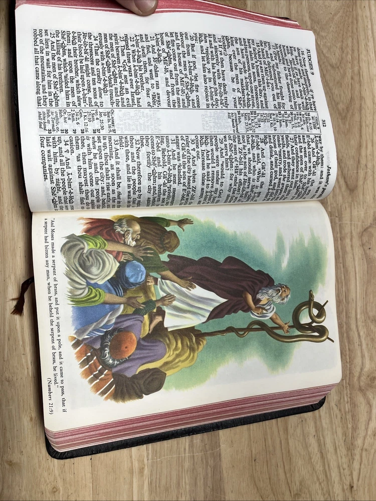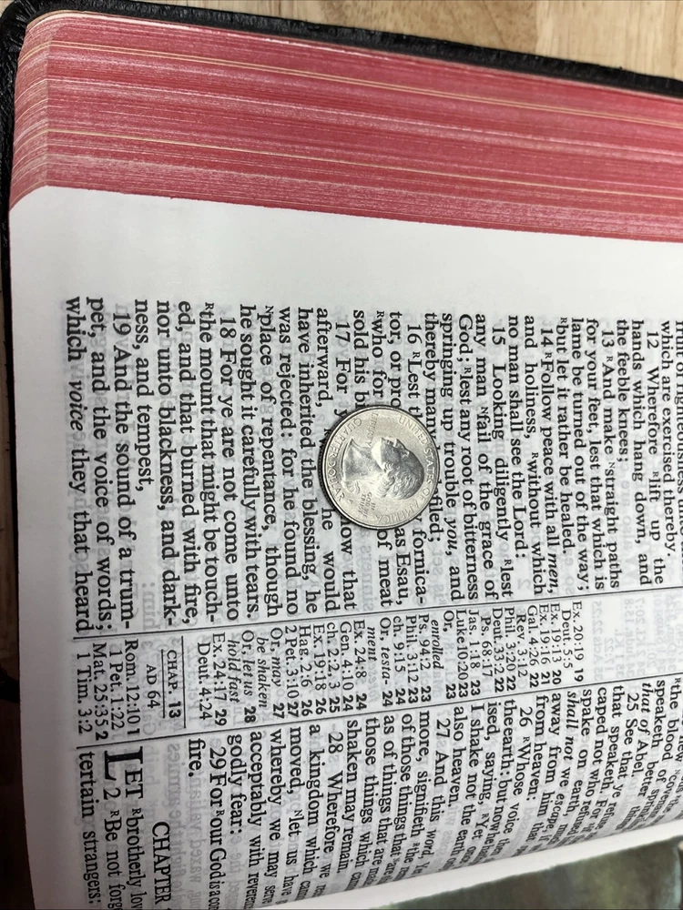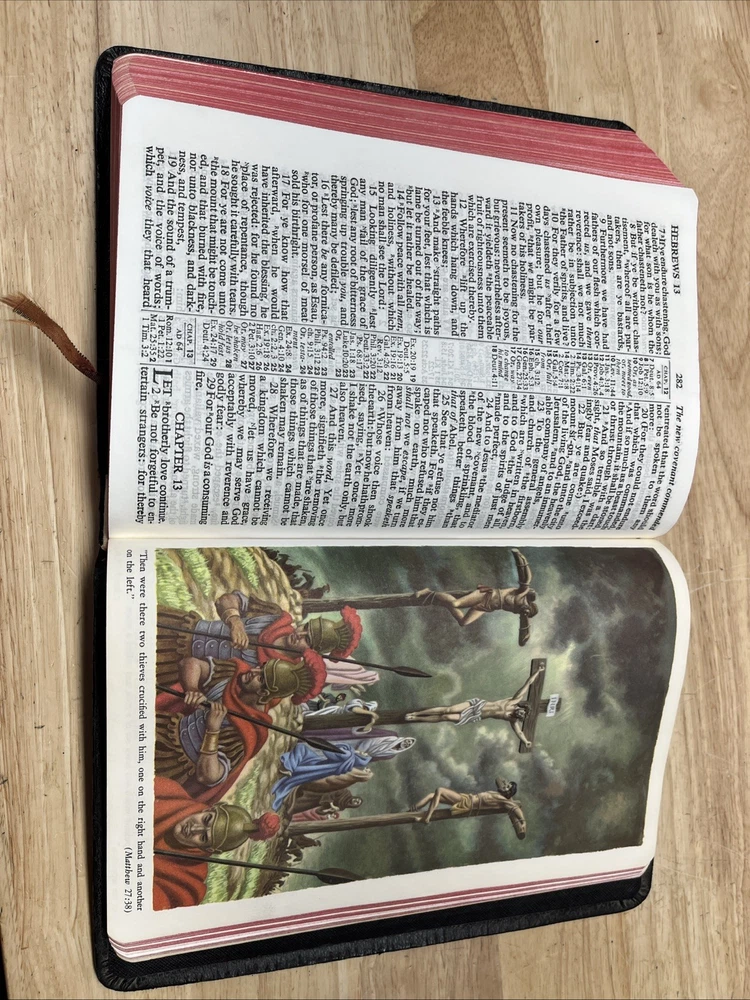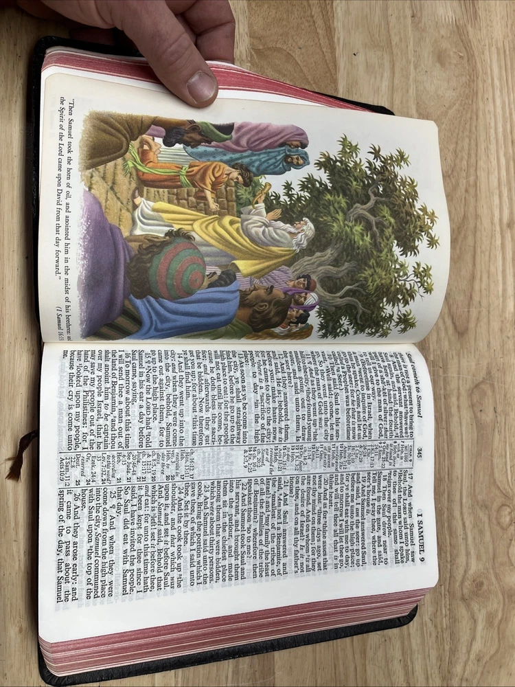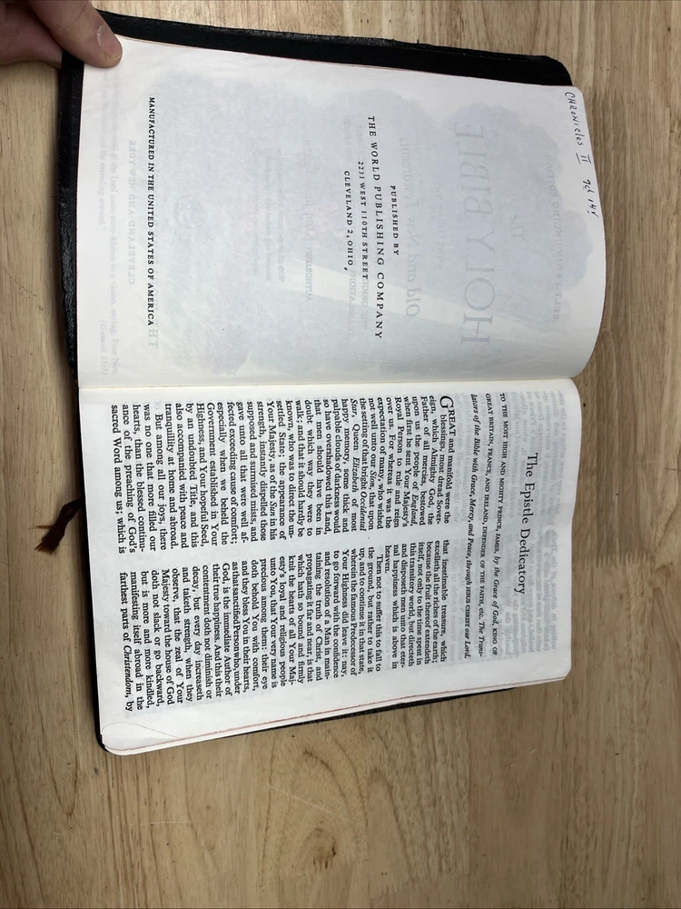 Bible is in used condition. It does have a name in the front and a small amount of writing on one of the front pages on top. A looked through the book. It appears to be in good condition. I did not see any other writing other than in the front. I may have missed something. I did not check every page individually. It does have a small crease on the front cover.