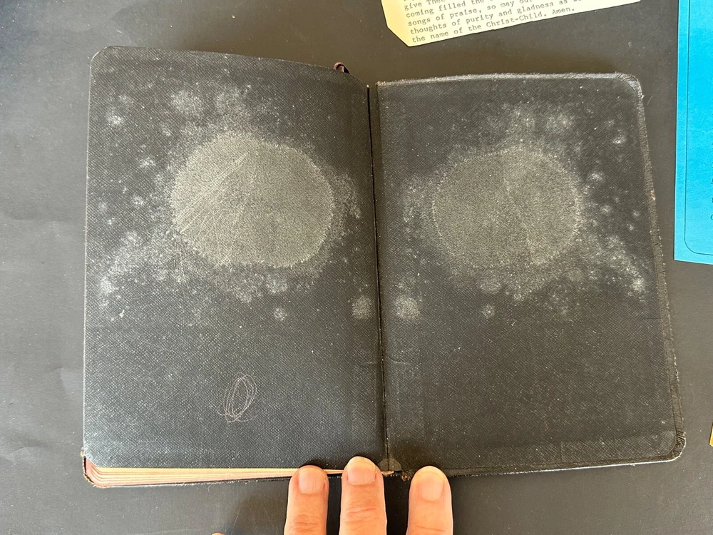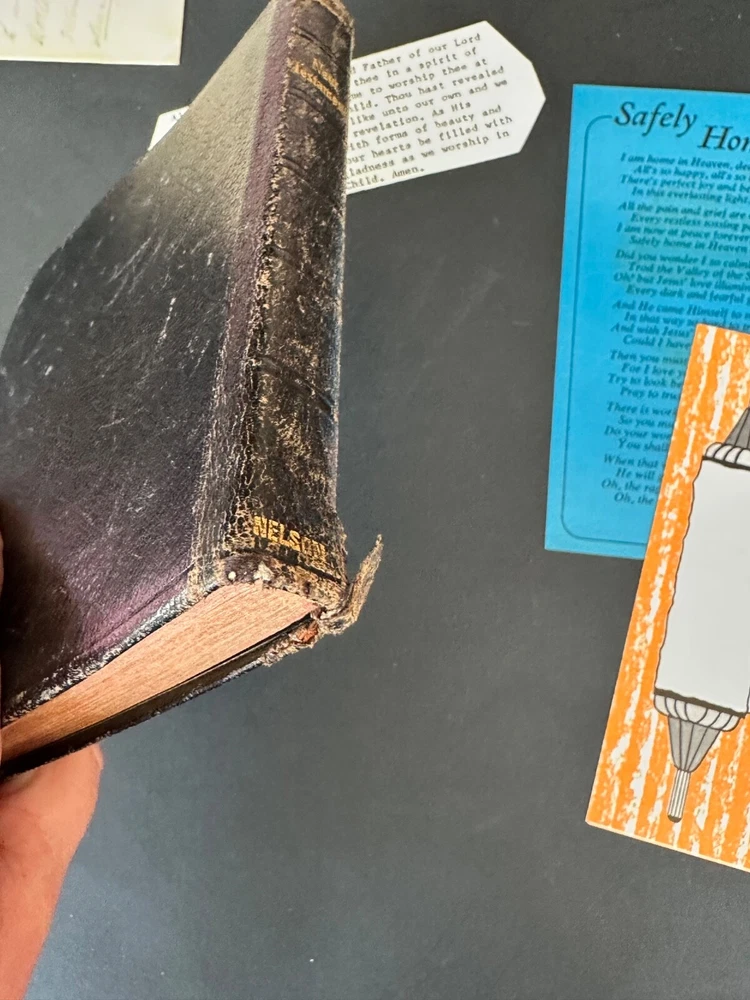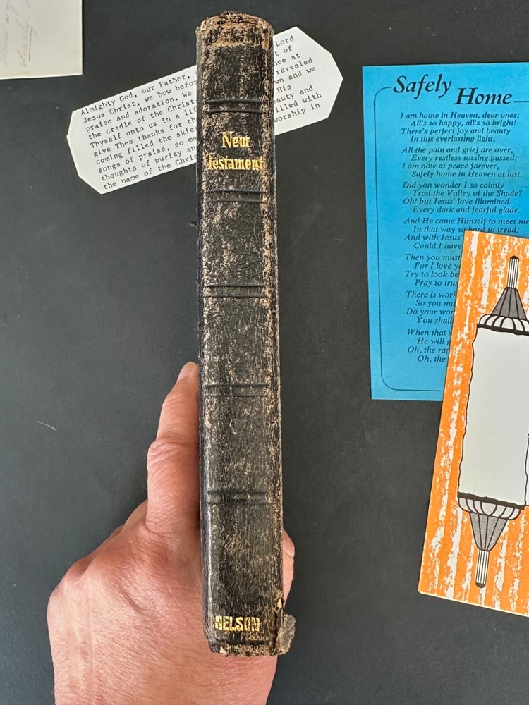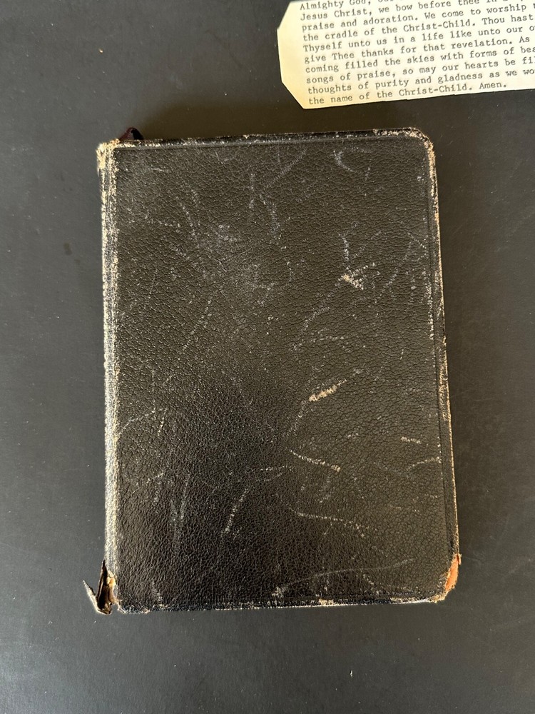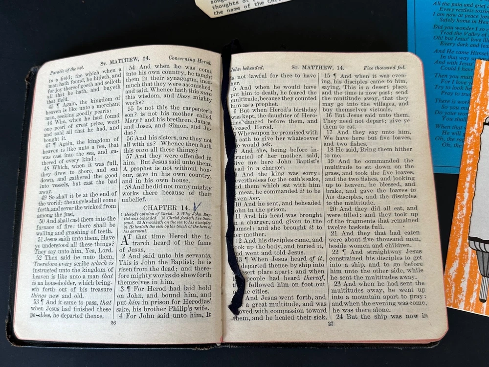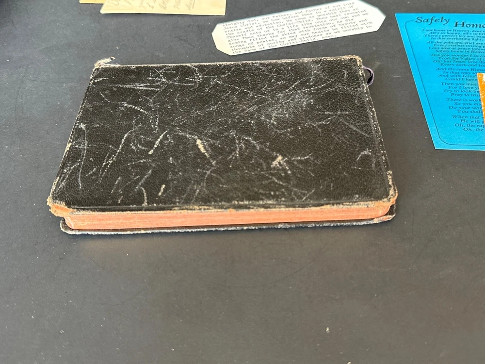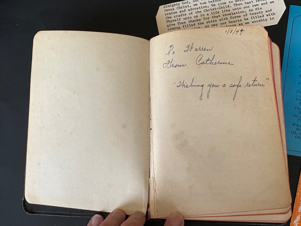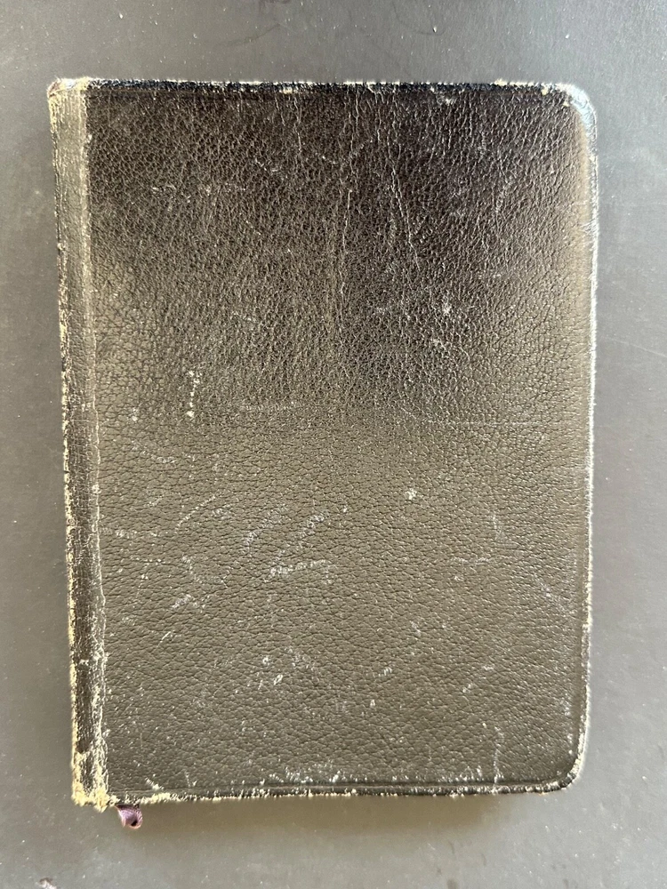 This circa 1940s New Testament Bible has an inscription dated 1/3/44 at the front: "To Warren from Catherine 'Wishing you a safe return'" Included with the ephemera found in the book is one page of a handwritten letter addressing Warren and referring to "a brother in the navy." There is also a handwritten note on an envelope addressed to "Dear Mom" and signed "Son Warren." The vintage New Testament also comes with several other pieces of religious ephemera found in the book including a mass card for Evelyn Ripley dated January 12, 1975 from the Tuttle Funeal Home in Dover, NJ. Warren obviously read and used this bible as it shows obvious wear. There is some damage at the top and bottom of the spine. Warren circled and made check marks at chapter headings through out the book. The New Testament of Our Lord and Savior Jesus Christ Appointed to be Read in Churches Thomas Nelson & Sons, New York 6 1/4" x 4 1/2" No Publication Date Printed in the U.S.A.