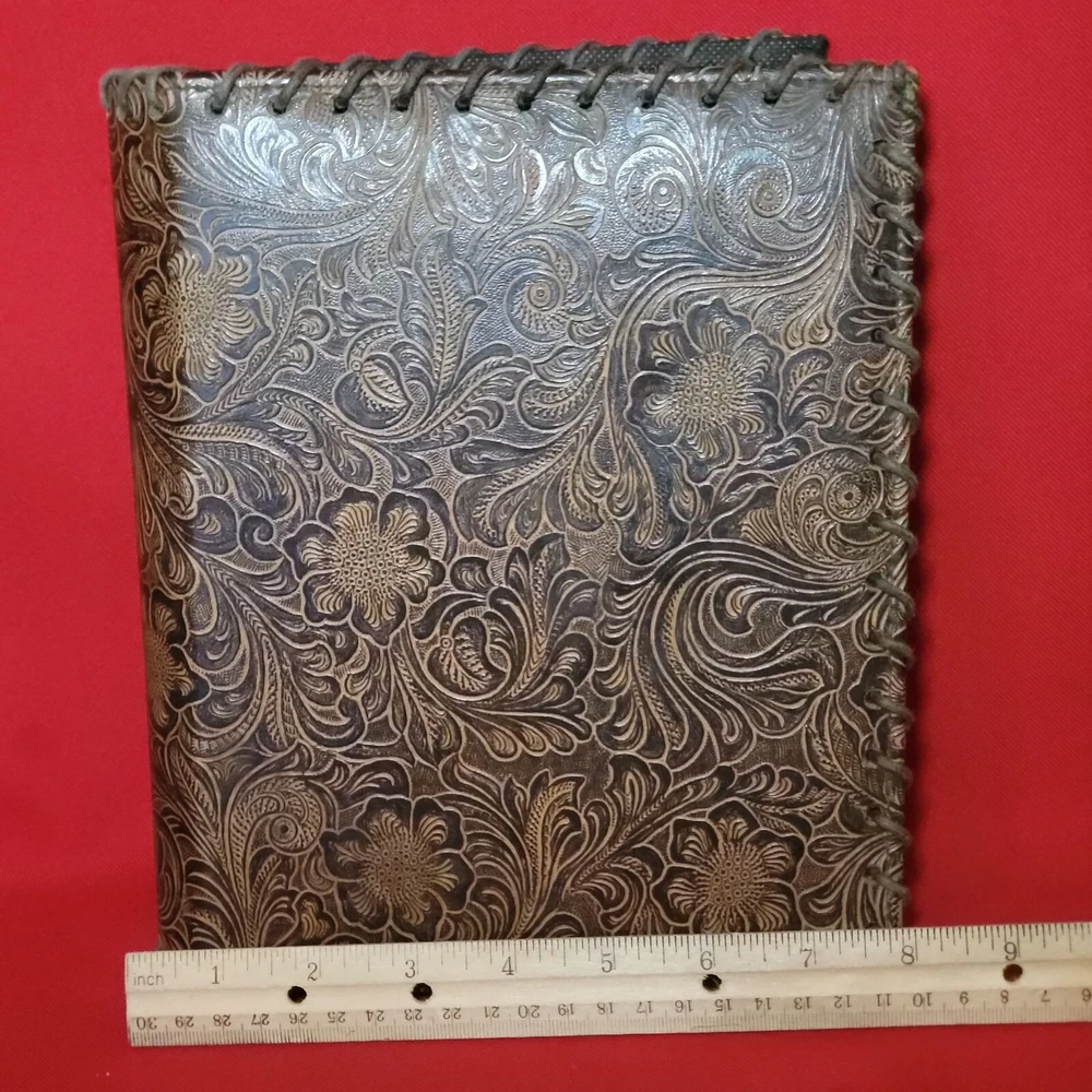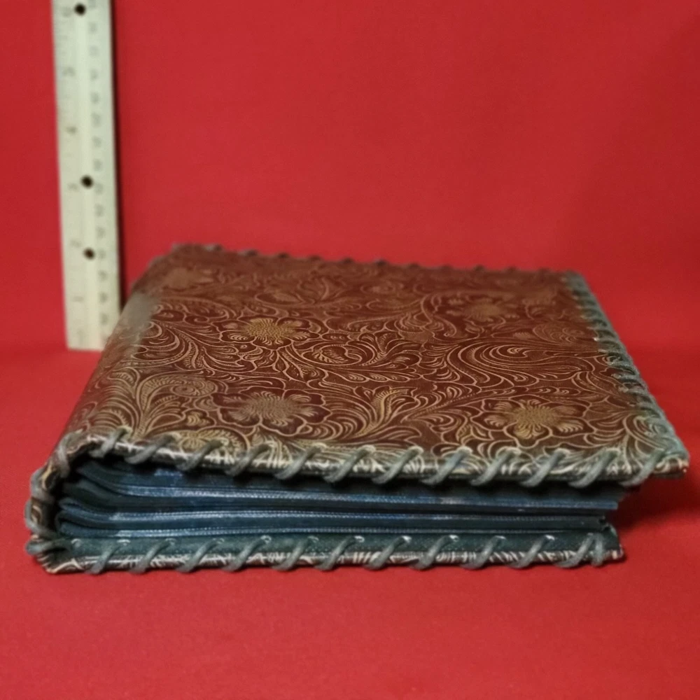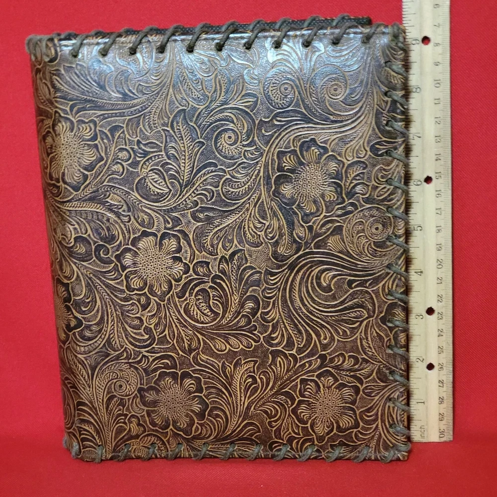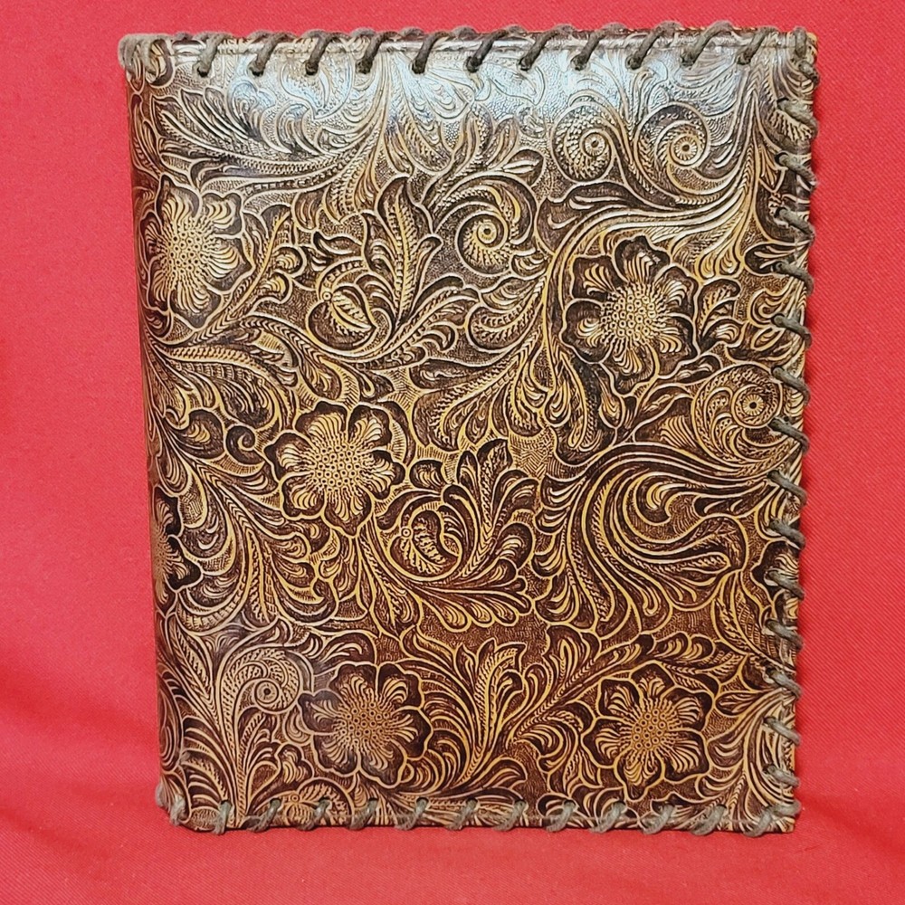 Vintage Leather Bound Photo Album Book Embossed Leather Floral Saddle Design Embossed Leather Floral Saddle Holds 208 4x 6 inch Prints 52 pages x 4 slot pictures = 208 Measurements: 7.75 x 2 x 9.25 in Weight: 1 lb 5.4 oz Features: • Photo Album Condition: Pre-Owned Good