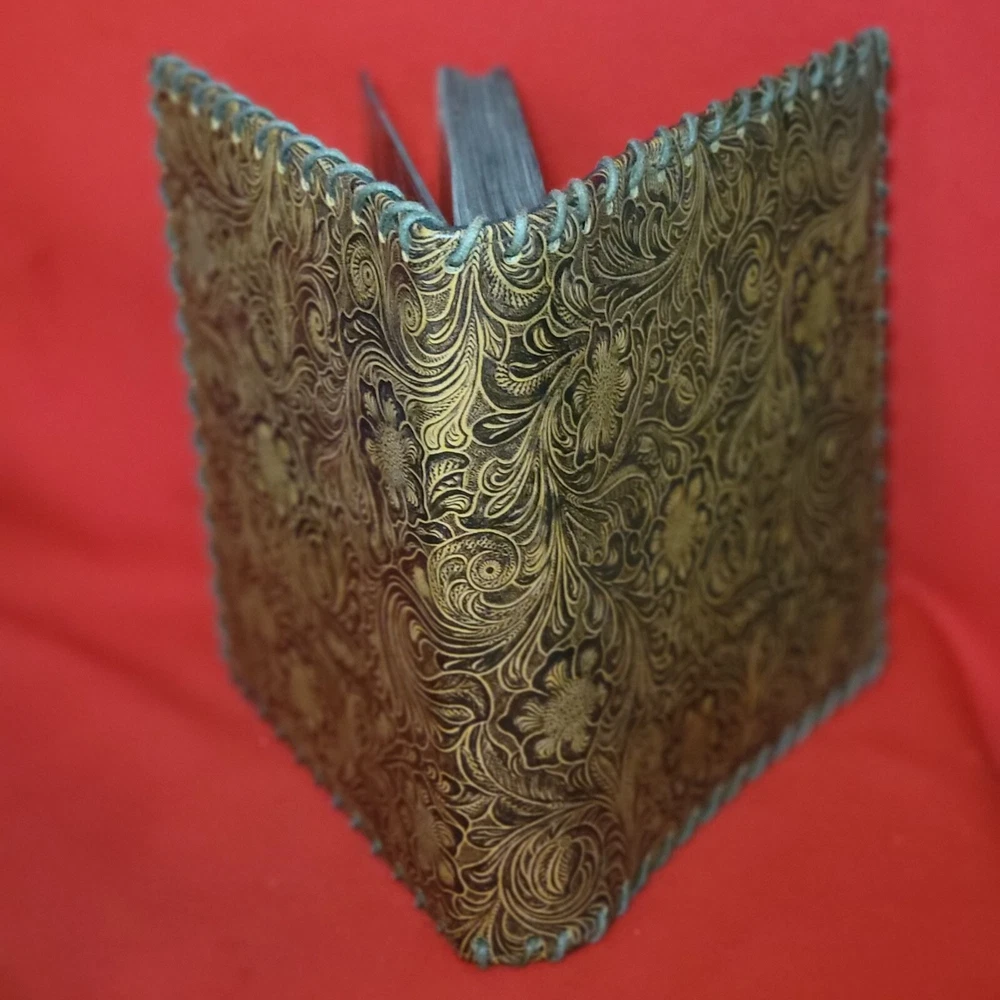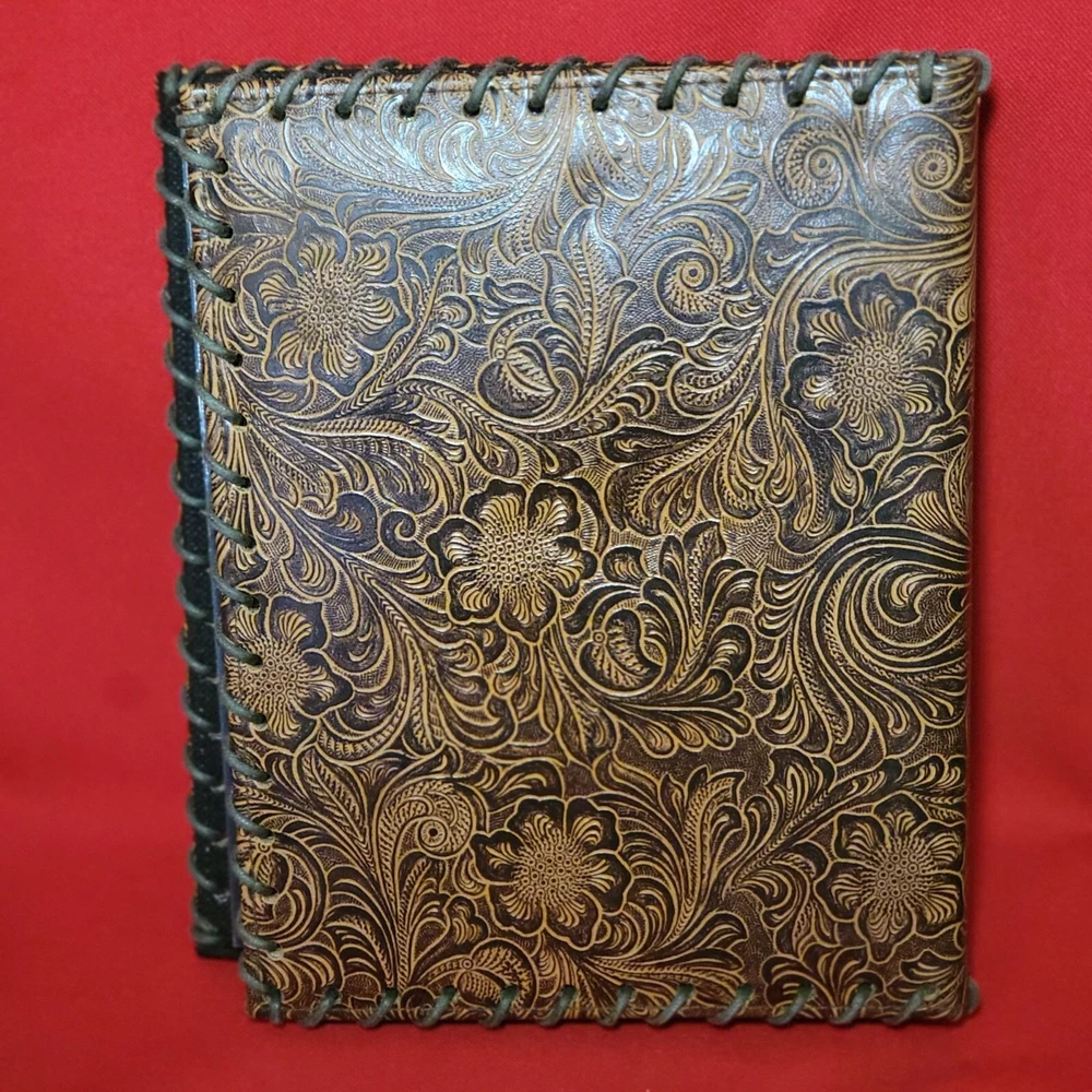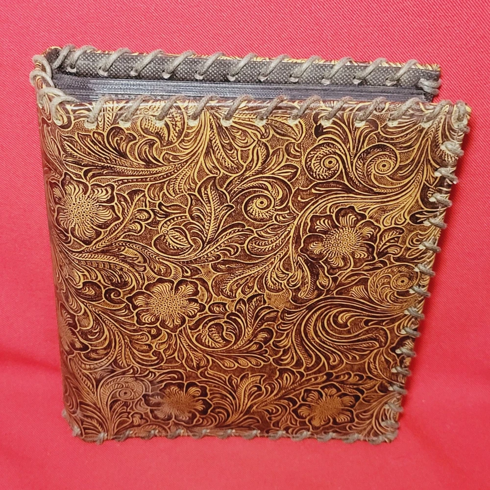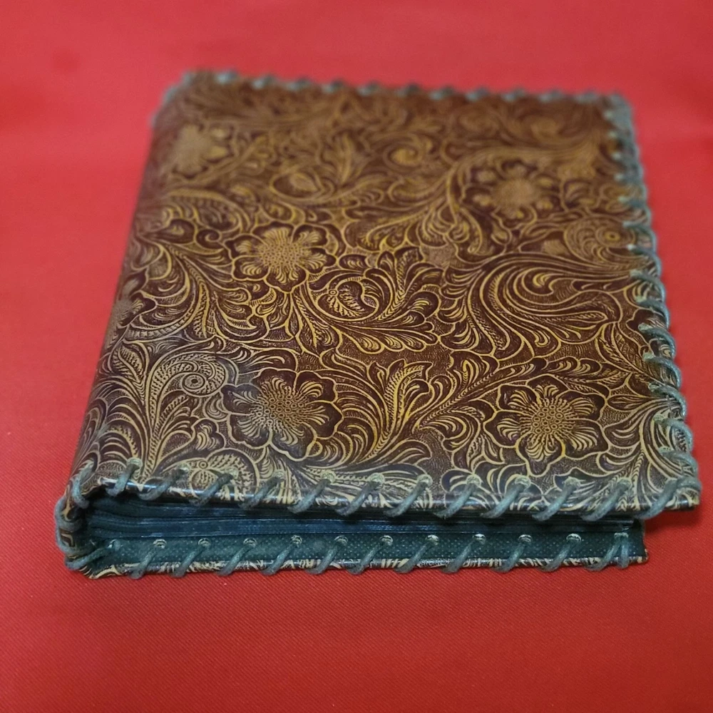 Vintage Leather Bound Photo Album Book Embossed Leather Floral Saddle Design Embossed Leather Floral Saddle Holds 208 4x 6 inch Prints 52 pages x 4 slot pictures = 208 Measurements: 7.75 x 2 x 9.25 in Weight: 1 lb 5.4 oz Features: • Photo Album Condition: Pre-Owned Good