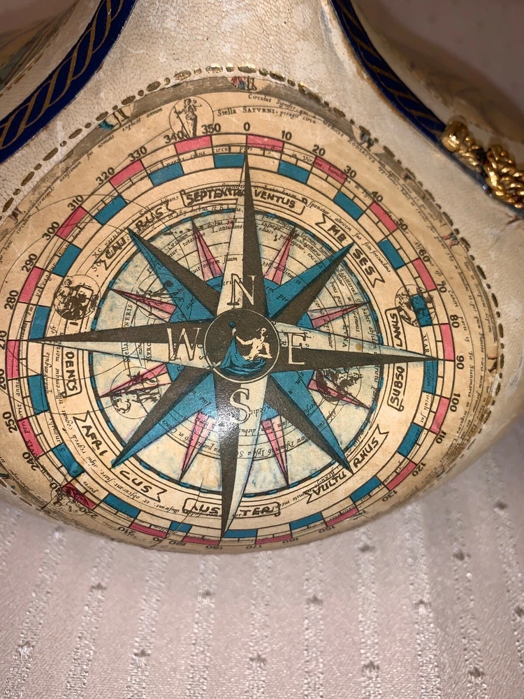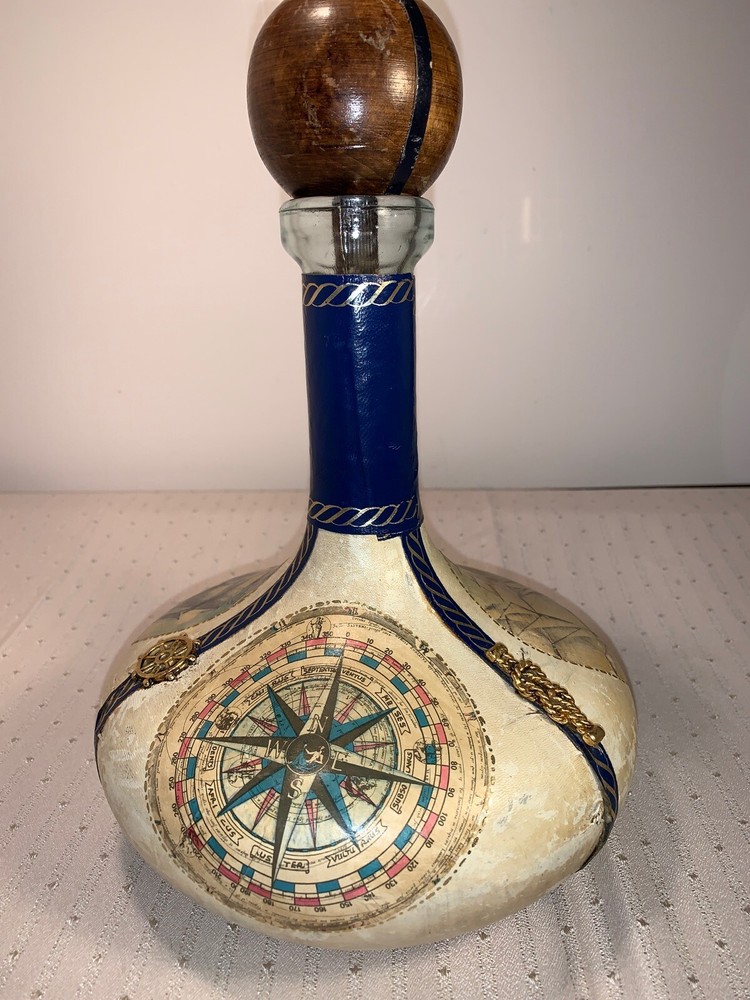 Great aesthetics!! No chips or cracks. Cork fits tight. I believe it’s missing a piece of decorative gold toned accent as shown in pictures. Very cool piece here! Vintage Leather Bound Wine Decanter Italy Nautical. Condition is Used. Shipped with USPS Priority Mail.