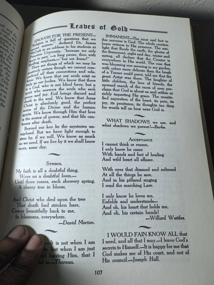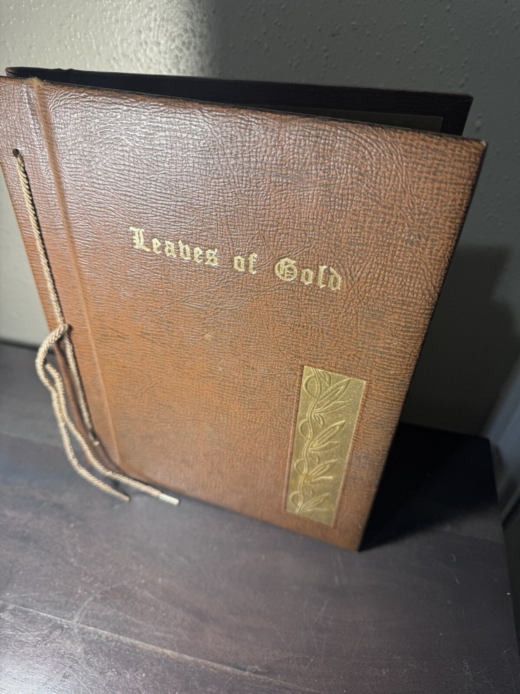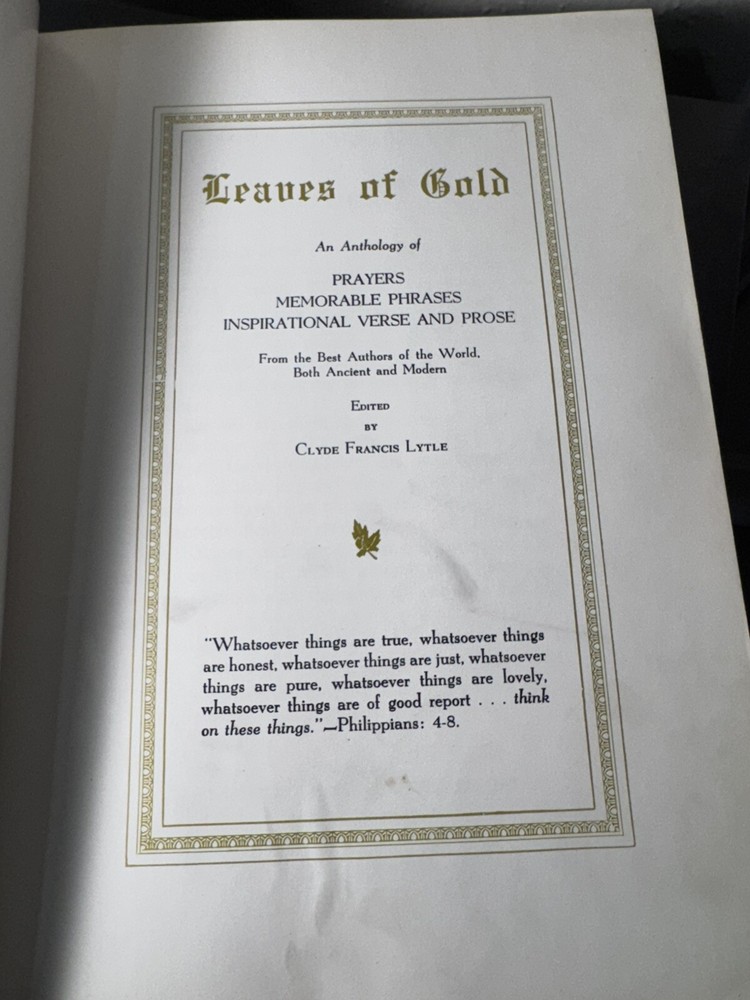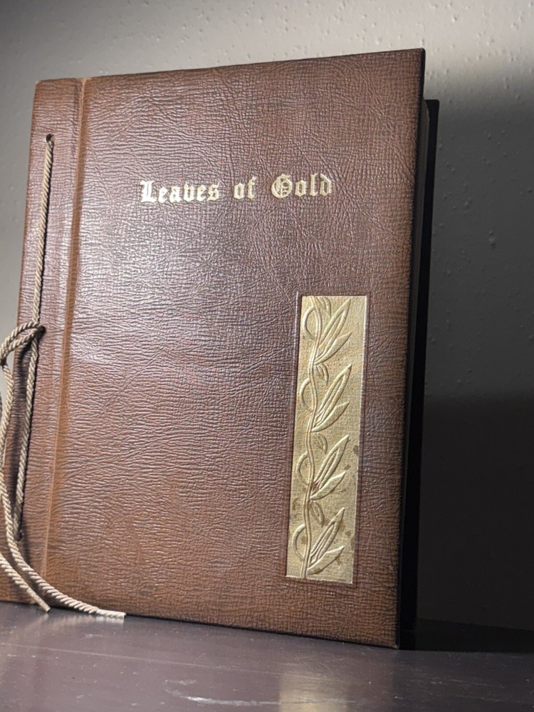 This vintage book, titled "Leaves of Gold", is a beautiful collection of memorable phrases and prayers from various authors. It was published in 1948 by The Coslett Publishing Company and is a revised edition. The book is a hardcover with faux leather binding and features large print. The book is written in English and has a length of 11.25 inches, a width of 8.60 inches, and a height of 0.75 inches. It weighs 2 lb 3 oz. The book is intended for young adults and adults, and it is a great addition to any collection of religious and spiritual books. The book is not inscribed and was printed in the United States.