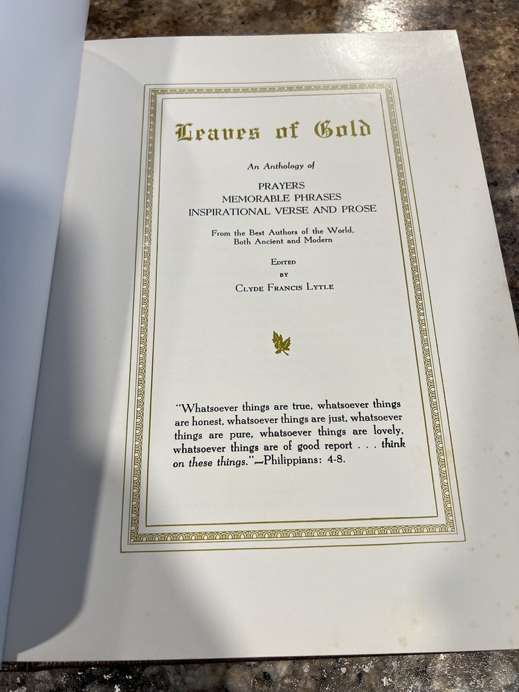 This vintage book titled "Leaves of Gold" is a beautiful collection of memorable phrases and prayers from various authors. Published by The Coslett Publishing Company in 1956, this is a perfect addition to any collection. The hardcover format is faux leather bound and features large print, making it easy to read and carry. The book measures 11.25 inches in length, 8.60 inches in width, and 0.75 inches in height, with a weight of 2 lb 3 oz. It is suitable for young adults and adults, and is written in English. The book is a short story genre with a religious and spiritual theme, and is perfect for those who are looking for an anthology of prayers. Book is in very good condition for its age