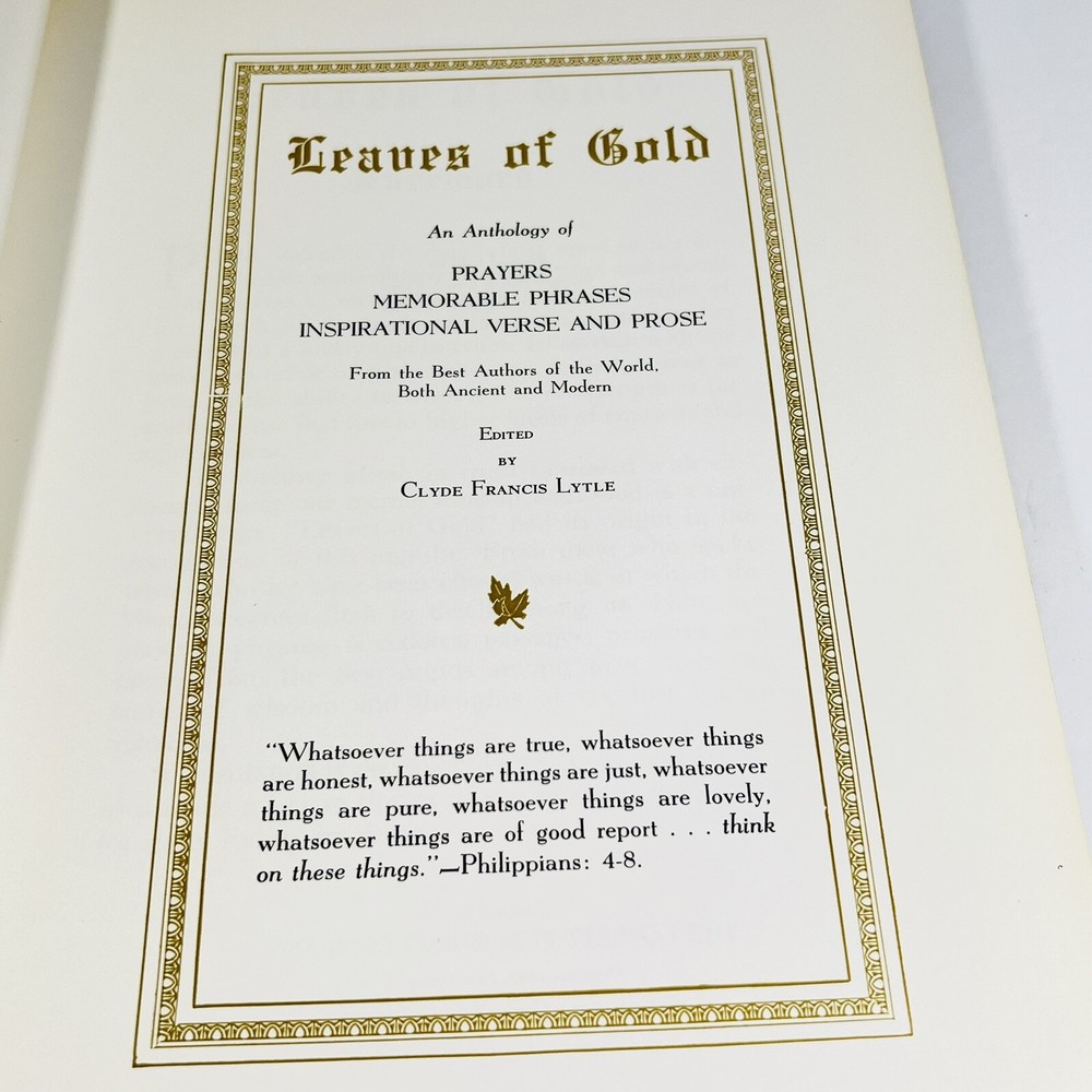 Neat Book! Vintage & Rare - LEAVES OF GOLD Anthology of Prayers, Memorable Phrases, Inspirational Verse and Prose. From the Best Author of the World, Both Ancient and Modern. Edited by Clyde Francis Lytle Published by The Coslett Publishing Company, Williamsport, Pennsylvania, Printed in the USA Damaged Shipments: Miss Priss Bliss takes pride in our listings and shipping. Orders are thoroughly inspected and securely packed. Upon receiving your package, please inspect for any noticeable or concealed damage to the package(envelope or box). If there is significant damage to the package, please refuse delivery. Any concealed damage must be reported within 24 hours so that a claim may be filed with the shipping carrier. Thank you for shopping and supporting our small family business!