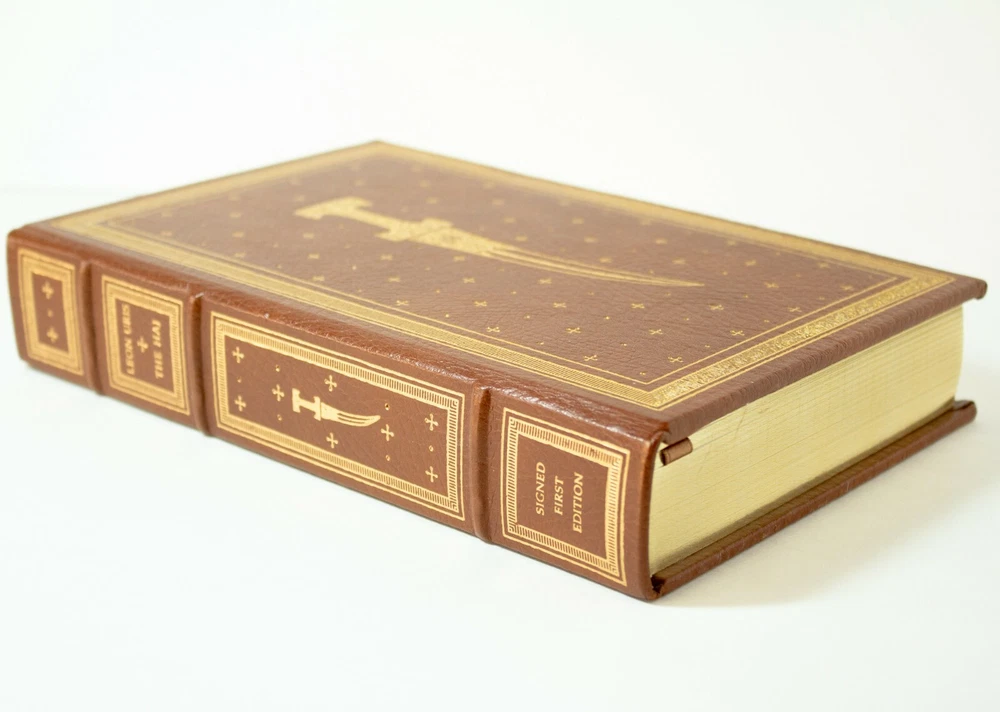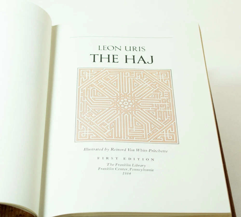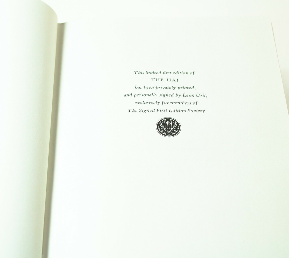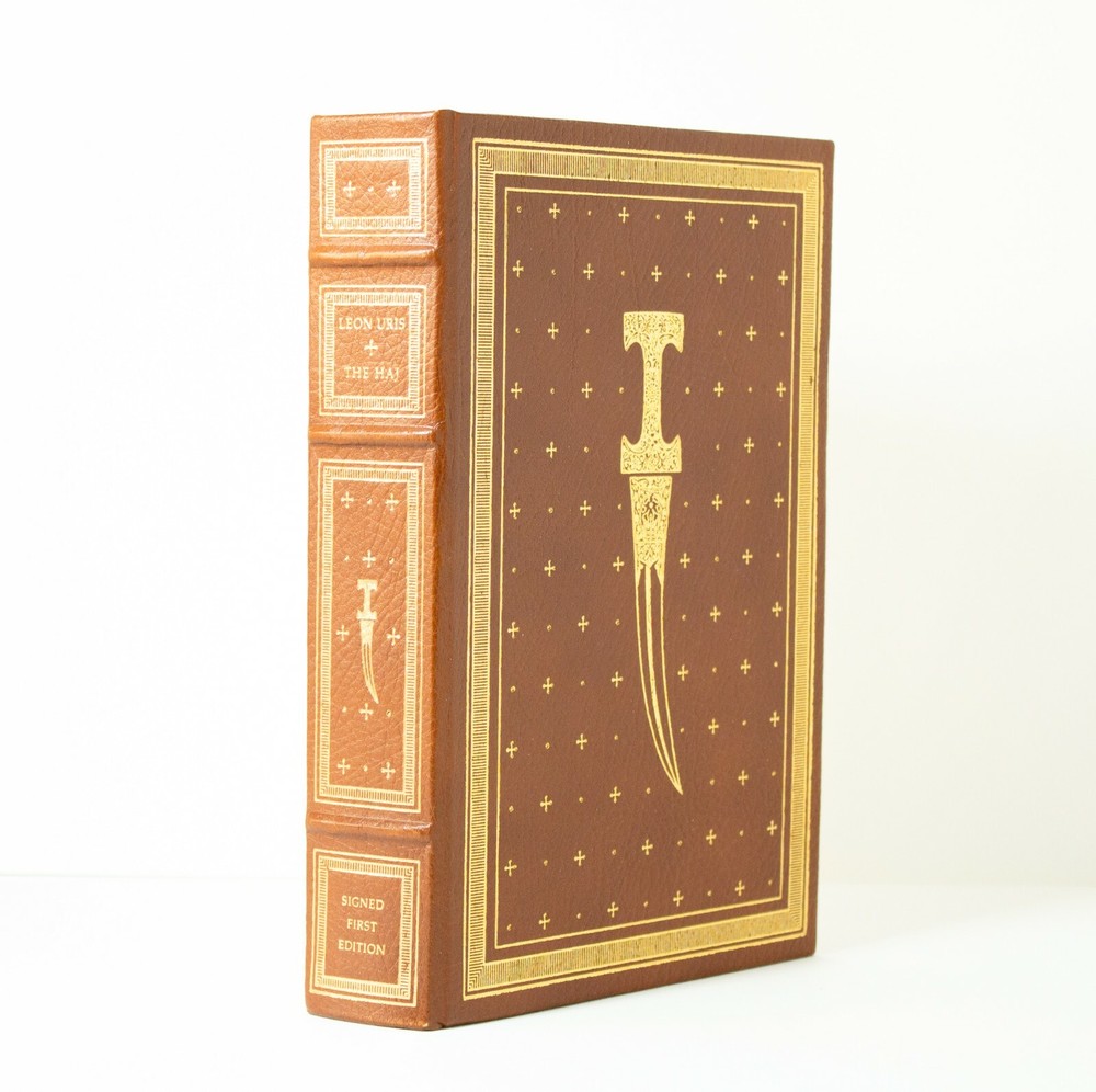 Vintage The Haj Signed First Edition Leather Book Franklin Library 1984. This Limited First Edition of The Haj Has Been Privately Printed And Personally Signed By Leon Uris Exclusively For Members Of The Signed First Edition Society. The Signed First Editions Collection Is Among The Most Collectible Franklin Library Collections. Full Leather-Bound Book Features 22k Gold Accents, 22k Gold Gilt Edges, Silk Endpapers, And A Sewn-In Bookmark. Good Clean Condition With Minor Signs Of Wear And Use. Slight Gold Loss on Front Of Book; One Paged Slightly Creased, See Photo. Priced Accordingly.