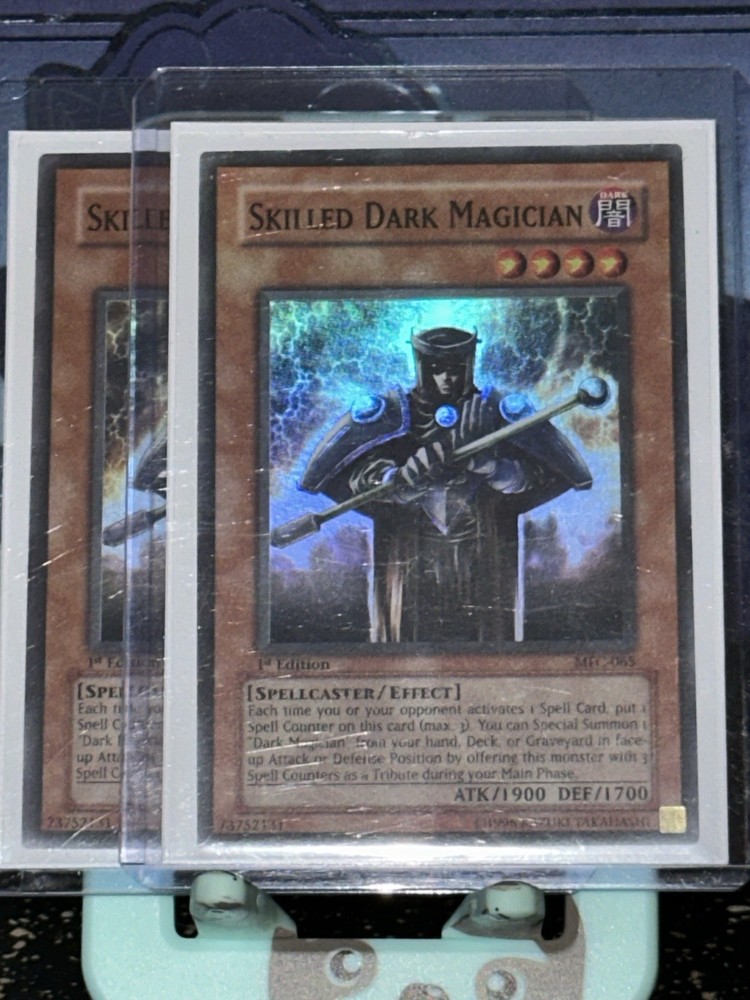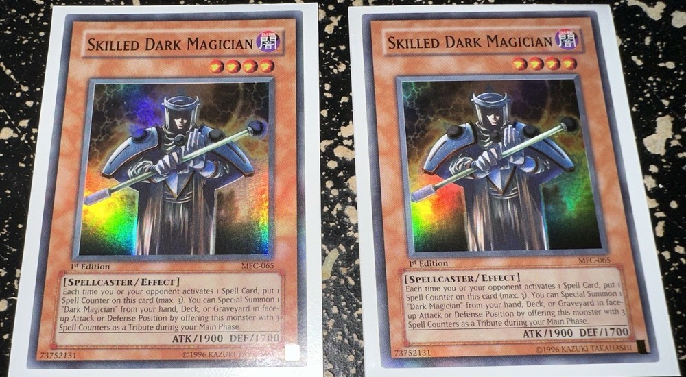Step into the realm of magic with the Vintage Yu-Gi-Oh! TCG Skilled Dark Magician card, a must-have for collectors and duelists alike. Featuring the enigmatic spellcaster in stunning detail, this card is a true gem from the Magic Force series, bearing the sought-after MFC-065 card number. This listing is for two cards, not just one. As a 1st Edition Super Rare, it stands out with its unique foil and texture that captures the essence of the beloved Yu-Gi-Oh! franchise. Produced by Konami, this card is a vintage piece that exudes nostalgia and is an essential addition to any serious collection.