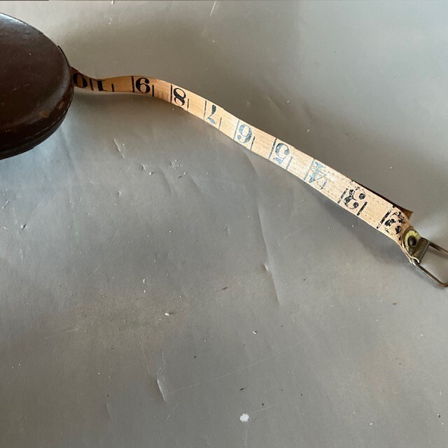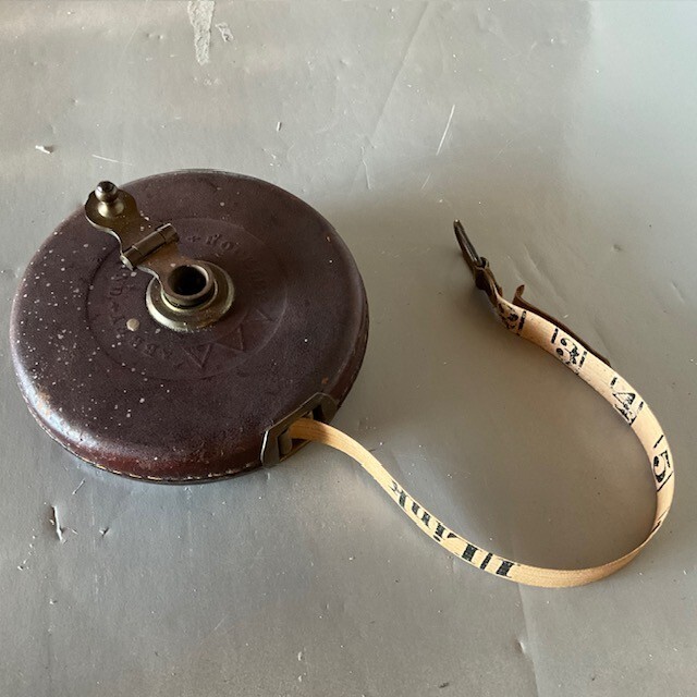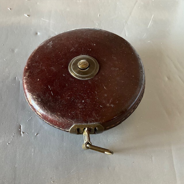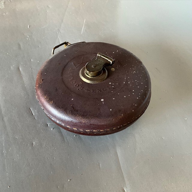 A fine example of a leather-bound, 66" cloth tape measure made by Hockley in England. The cloth tape has large numerals in 1/2" increments. The leather has been embossed with "Hockley England, Abbey with a 3-triangle logo. The leather is reasonable shape.
