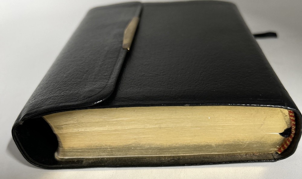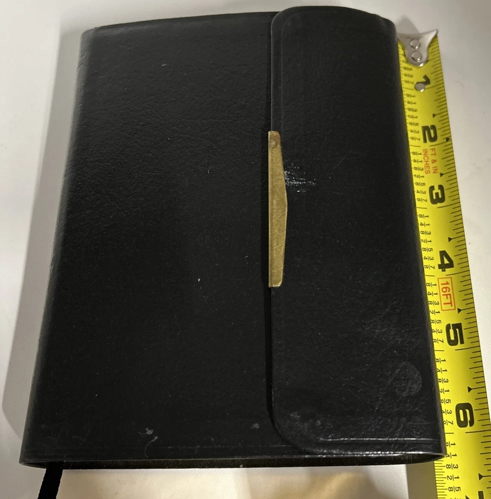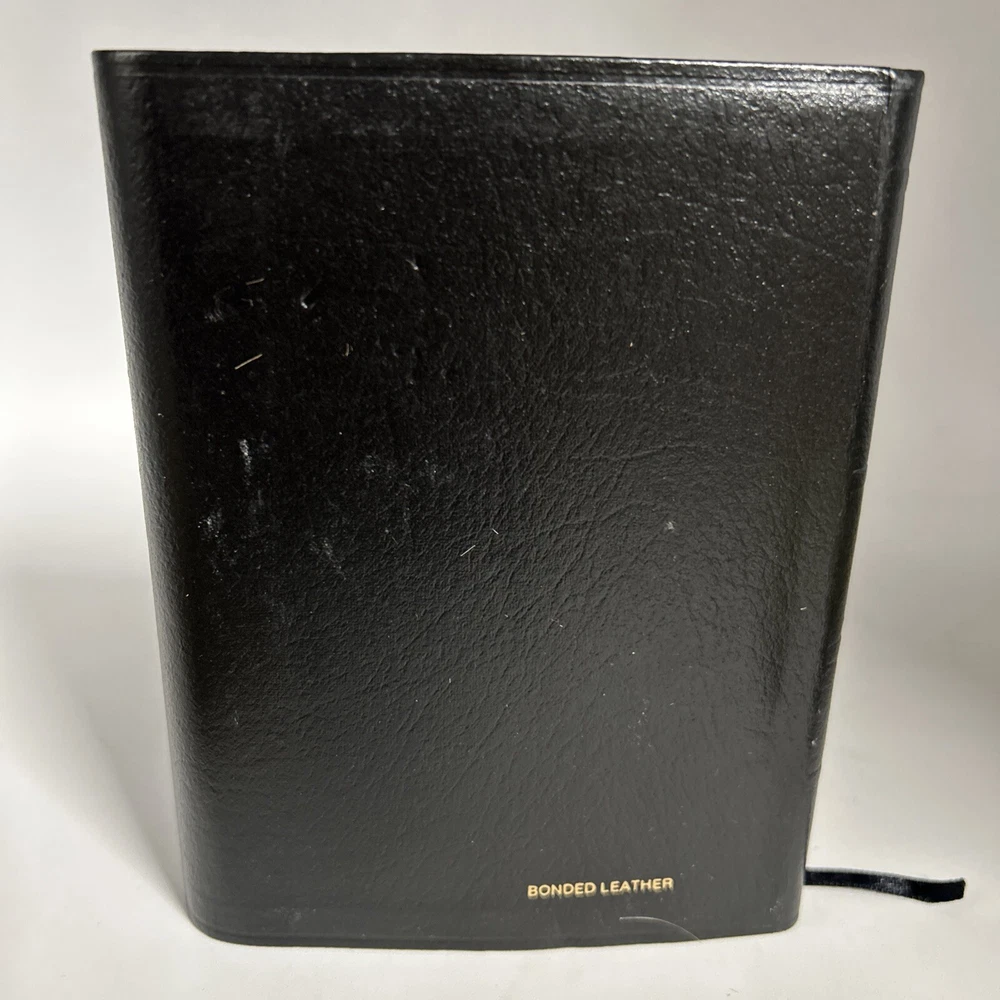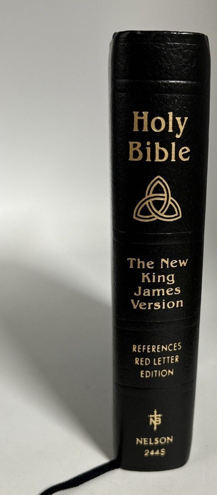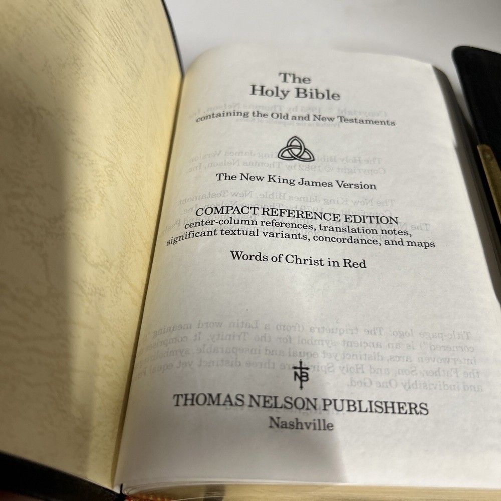 A vintage Holy Bible, The New King James Version, Compact Reference Edition with red letter text, published by Nelson Incorporated, Thomas in 1985. The book is bound in black bonded leather with a snap cover, measuring 6" in length, 4.5" in width, and 1.25" in height. Written by Nelson, it falls under the genre of Religious & Spiritual and Antiquarian & Collectible, focusing on the topic of Religion.