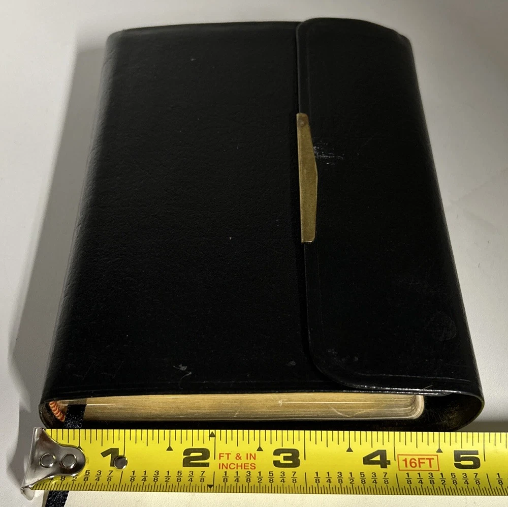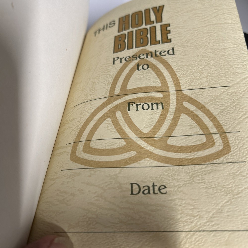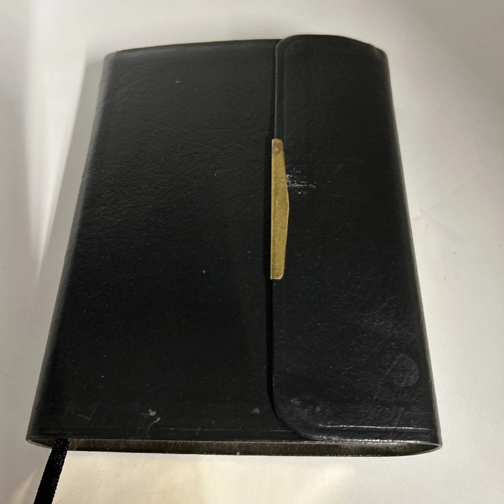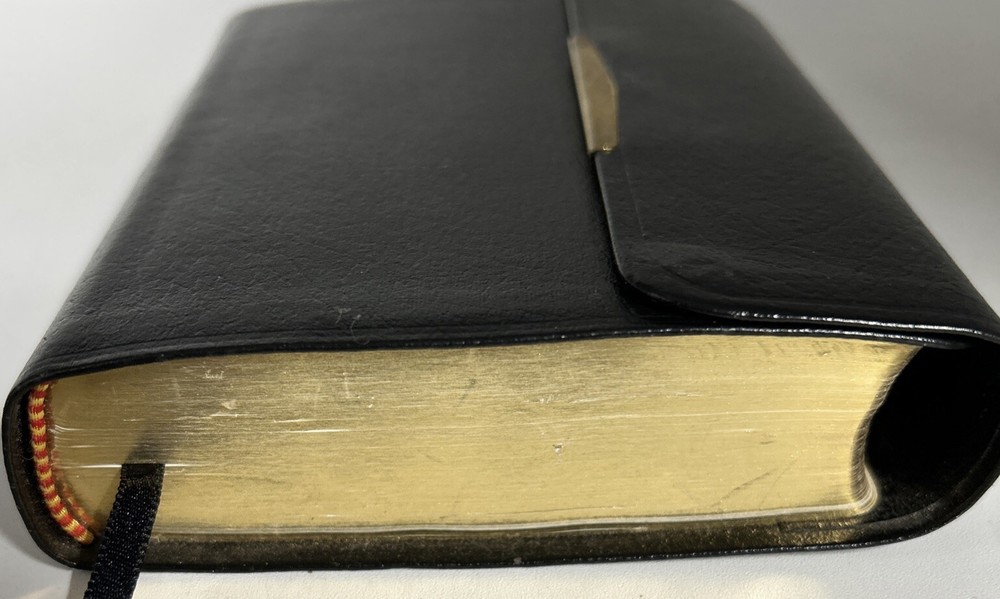 A vintage Holy Bible, The New King James Version, Compact Reference Edition with red letter text, published by Nelson Incorporated, Thomas in 1985. The book is bound in black bonded leather with a snap cover, measuring 6" in length, 4.5" in width, and 1.25" in height. Written by Nelson, it falls under the genre of Religious & Spiritual and Antiquarian & Collectible, focusing on the topic of Religion.