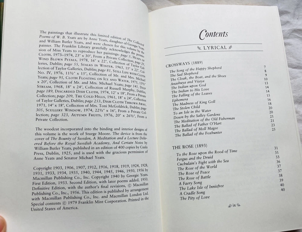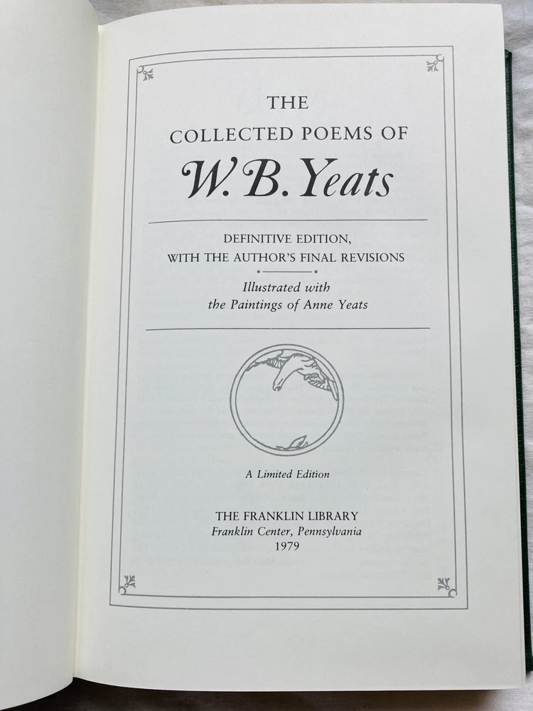 W.B. Yeats Collected Poems Franklin Library. Definitive Edition with the Author's Final Revisions . Illustrated with the paintings of Anne Yeats. 1979. Green leather with gilt decorations. Gilt page edges. Like new condition. See pictures for more details.