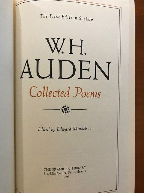 W.H. Auden. Collected Poems. Franklin Center, PA: The Franklin Library/The First Edition Society, 1976. Introduction by Stephen Spender. Handsomely bound in full leather with gilt decoration. A.e.g. Book is in better than very good condition.