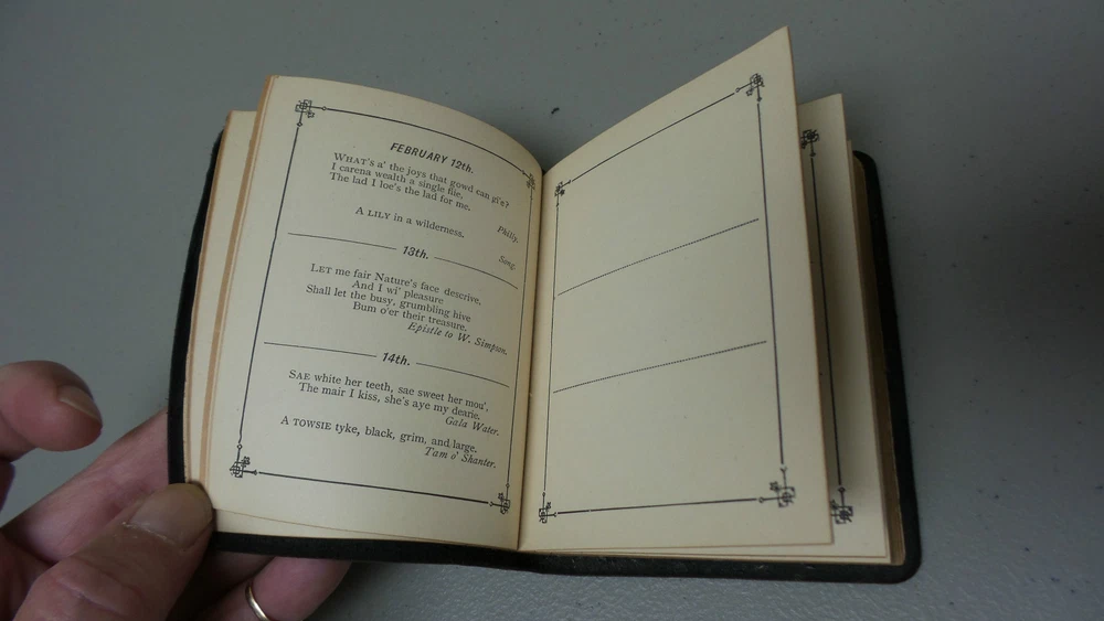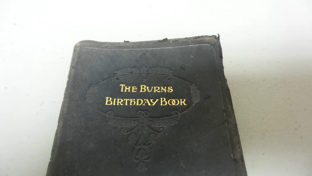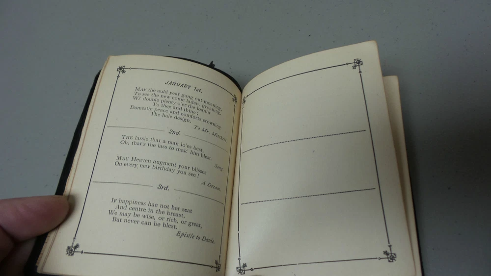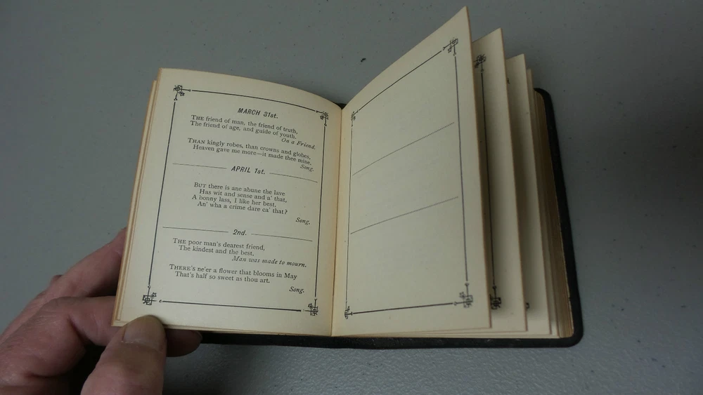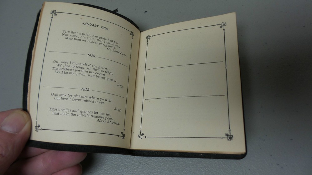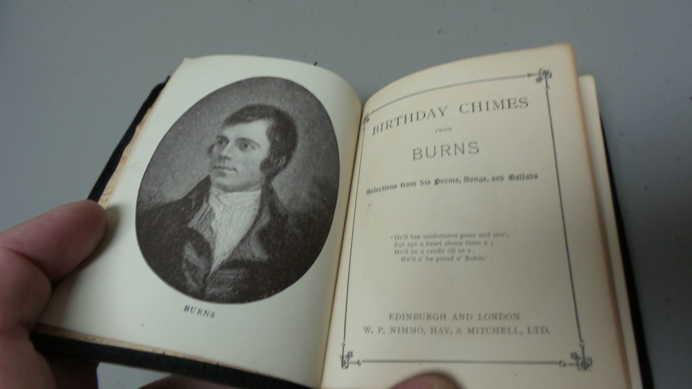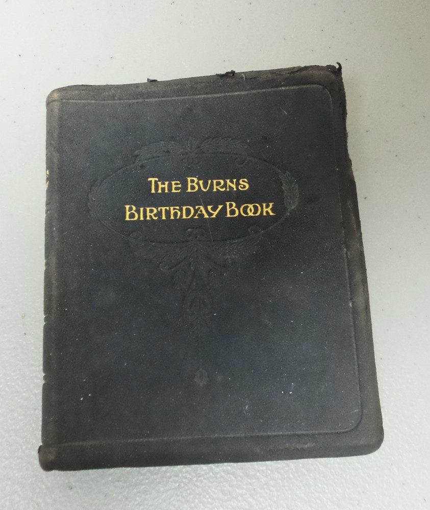 Welcome to Antiques & Moore! This listing is for a very nice antique miniature leather bound book "The Burns Birthday Book", c. 1887. Selections from the poems and ballads of Robert Burns for each day of the year (unused). Leather bound, dated 1887 with embossed leather cover with gilded page edges, all intact. The book is in very good condition with tight bindings and clean pages. The leather cover does has wear commensurate with age (see photos). Measures 4 1/4" long, 3 1/2" wide and 1/2" high. If you have any specific concerns or any questions regarding this nice book, please email and I will respond. I am not a book dealer and am selling the book in "as found" Estate condition. We at Antiques & Moore have been in the Antiques business for over 30 years and try to describe our items as accurately as possible. Although all sales are considered final, if there is an error in our description or a problem with our item, we will issue a full refund of the purchase price if contacted within 3 days after receipt of item, however, please note that we can not refund shipping charges. We are happy to answer any questions and always appreciate your business!