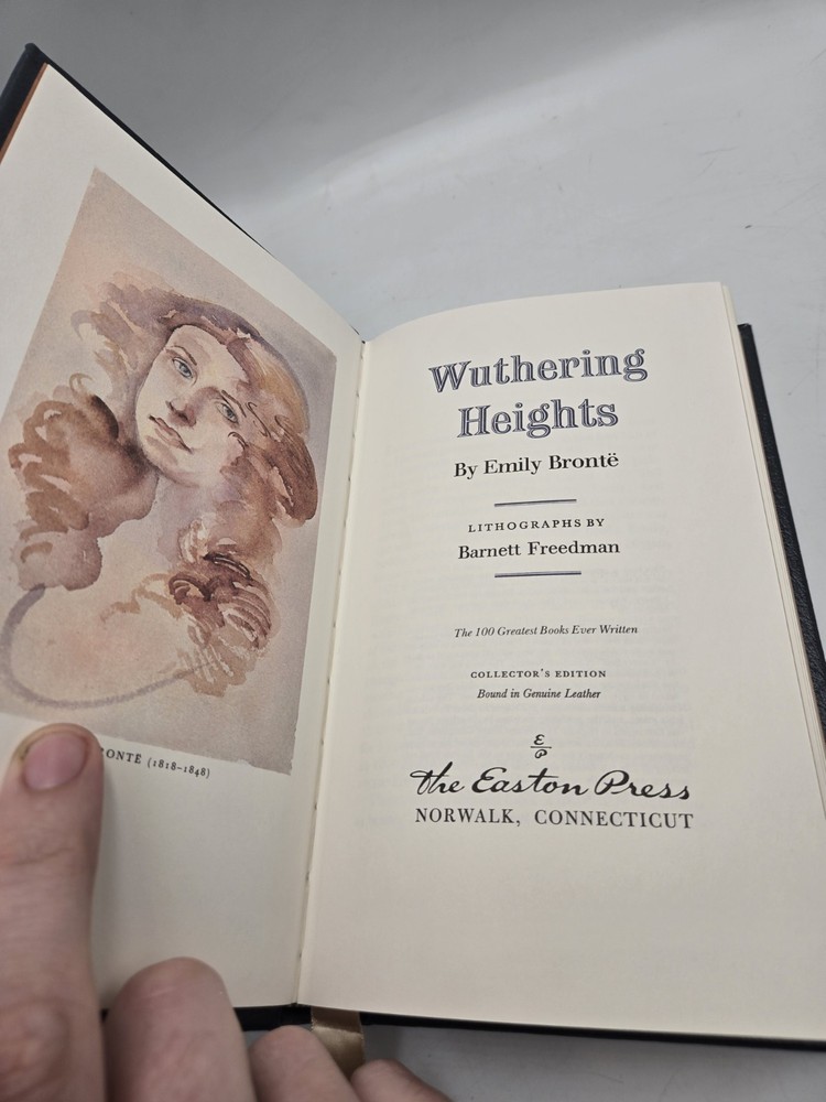 This is a collector's edition hardcover book titled "WUTHERING HEIGHTS" written by Emily Brontë and published by EASTON PRESS in 1980. The book is leather bound and contains the classic fiction narrative of the same name. It is part of the WUTHERING HEIGHTS book series and belongs to the genres of drama, romance, mystery, and world literature & classics. The book features antiquarian and collectible aspects and is written in English.