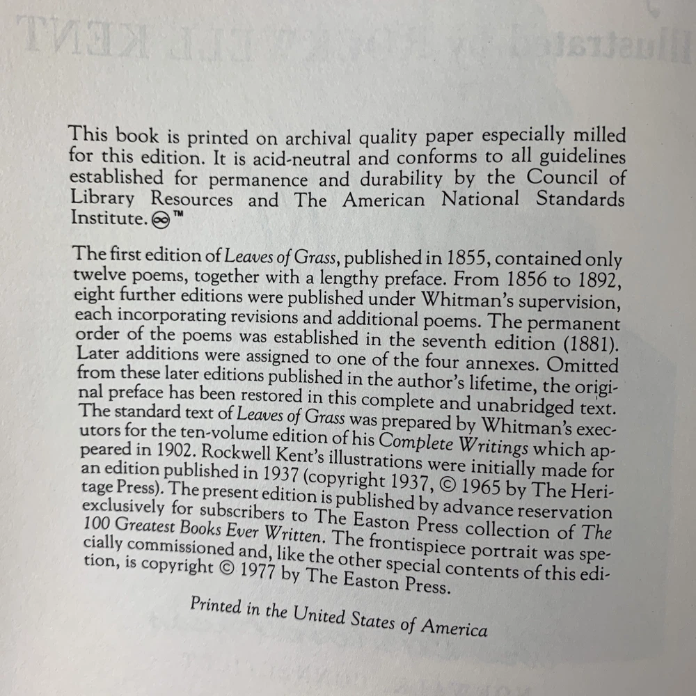 Walt Whitman Leaves of Grass 1977 Easton Press Collector’s Edition Leather No previous owner's markings. Book is in excellent condition with very little signs of wear.