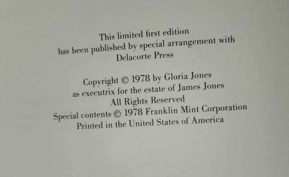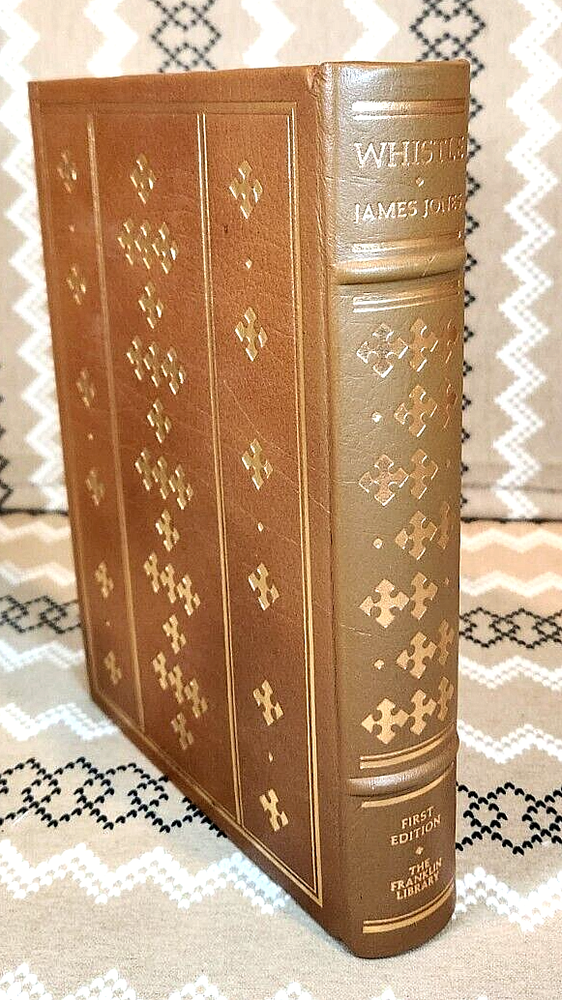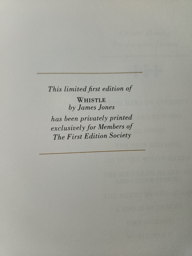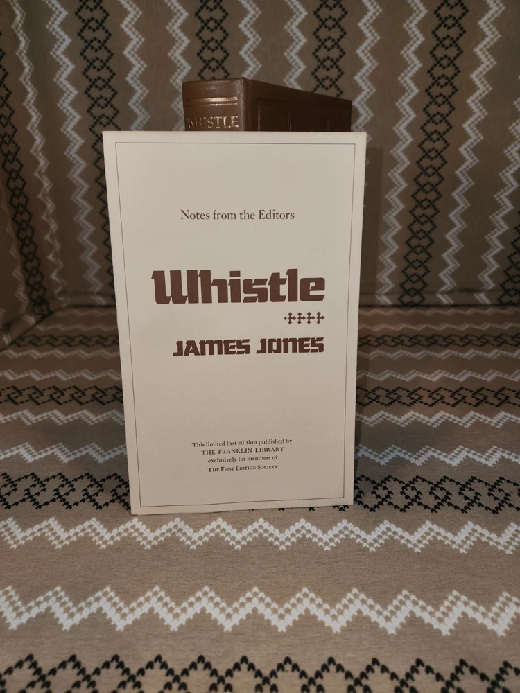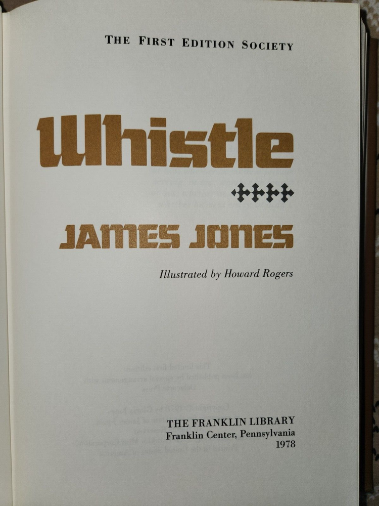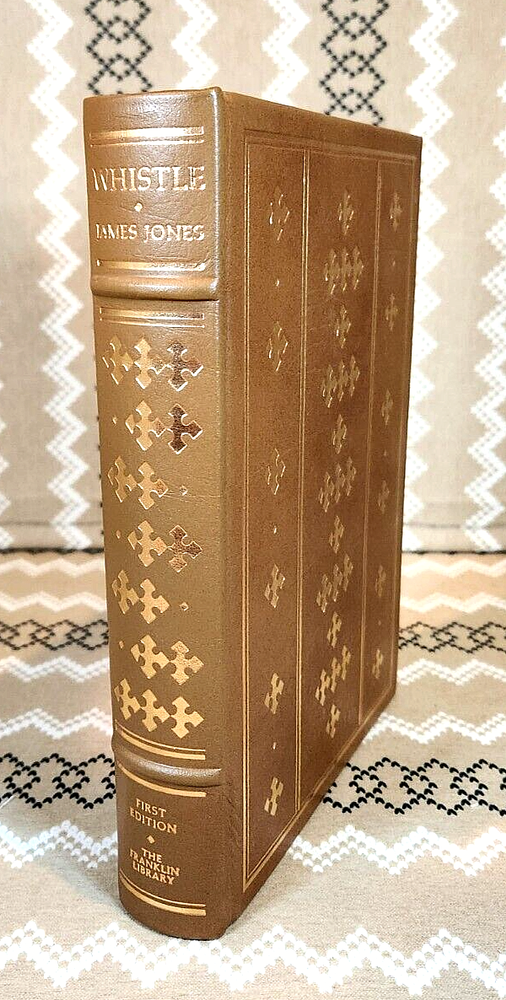 From the Franklin Library Collection. CONDITION Like New, Silk endpapers shows slight color fade at edges, see pic. All else new. Whistle: by, James Jones. Franklin Library Collection Delacorte Press, Publisher Limited First Edition. Howard Rogers, Illustrator Full Leather 197499 Pages Four World War II infantrymen recover at an army hospital, and struggle to readjust to the home front. At the end of a long journey across the Pacific, a ship catches sight of California. On board are hundreds of injured soldiers, survivors of the American infantry’s battle to wrest the South Seas from the Japanese Empire. As the men on deck cheer their imminent return to their families, wives, and favorite girls, four stay below, unable to join in the celebration. These men are broken by war and haunted by what they learned there of the savagery of mankind. As they convalesce in a hospital in Memphis, the pain of that knowledge will torment them far worse than any wound. The third of James Jones’s epics based on his life in the army, this posthumously published novel draws on his own experiences to depict the horrors of war and their persistence even after the jungle is left behind. Gilt page edges Raised Bands Accented in 22kt gold Full Leather-bound Satin Bookmark Ribbon still in original position Silk Moire Endsheets The First Edition Society Comes with "Editors Notes" booklet Smyth sewing and concealed muslin joints Terminology that may be used in this description: Bookplate: Highly sought after by some collectors, a book plate is an inscribed or decorative device that identifies the owner, or former owner, of a book. Most often bookplates are affixed to the endpaper of a book. Bump: Indicates that the affected part of the book has been impacted in such a way so as to cause a flattening, indention, or light bending. Deckle Edge: Deckle edge is the feathered edge of a page. Traditionally and historically, this was a side effect of the process of making paper. Dust Jacket: Sometimes used as another term for dust jacket, a protective and often decorative wrapper, usually made of paper which wraps around the binding of a book Ex-library: A former library book, generally containing library acquisition and ownership stamped Markings, and other typical indications of the library's use. Foxing: Or, Foxed is the age related browning, or brown-yellowish spots, that can occur to book paper over time. When this aging process happens to the paper in a book it is referred to as "foxed". Remainder Mark: A remainder marked book is just that - a mark to the page edges of a book. This mark is placed on the page edges by a publisher as books are returned from bookstores or sold to discounters. Rubbing: Abrasion or wear to the surface. Usually used in reference to a book's boards or dust-jacket. Shelf Wear: (shelving wear) describes damage caused over time to a book by placing and removing a book from a shelf. Soiled: Generally, refers to minor discoloration or staining.