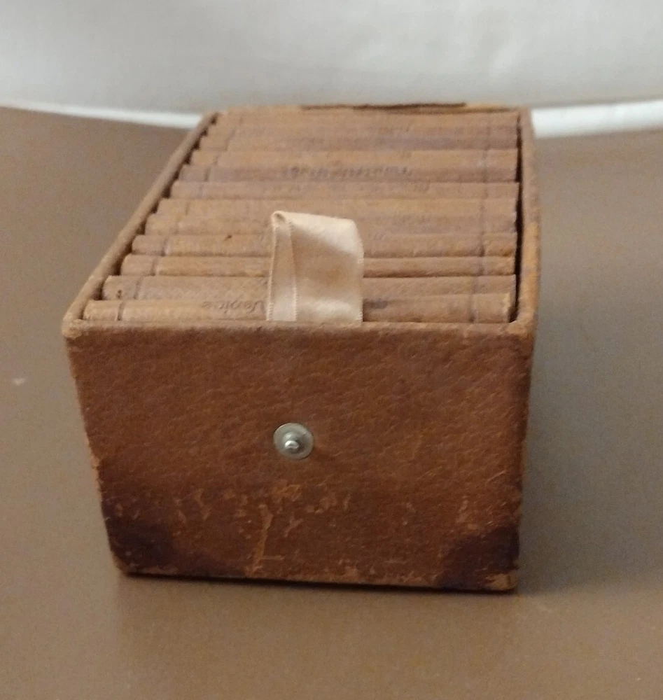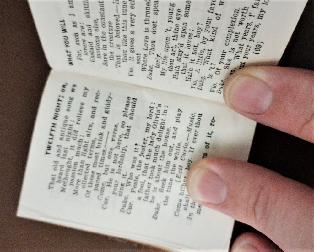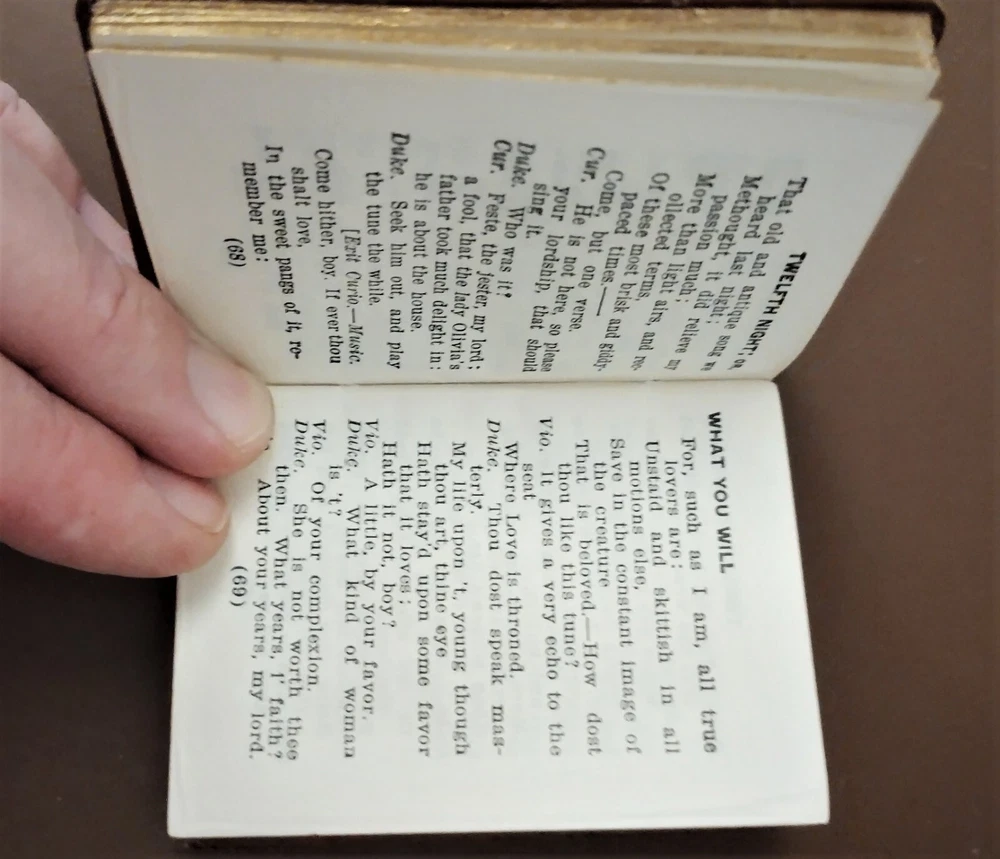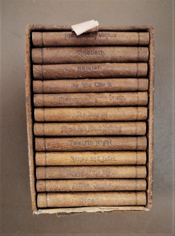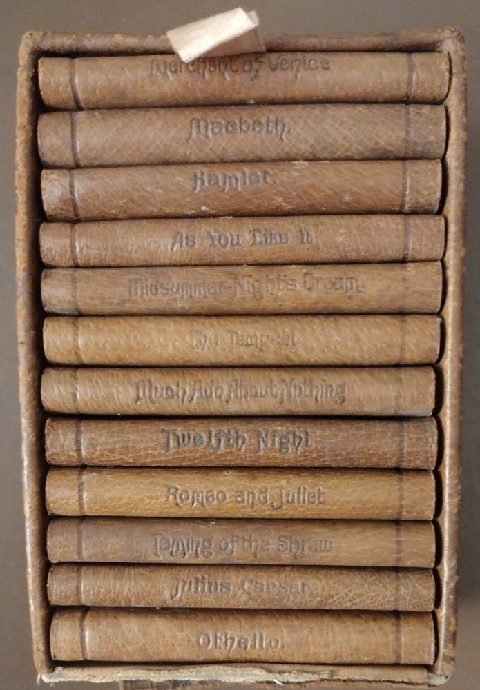 William Shakespeare 12 Miniature Gold Gilt Leather Bound Books Knickerbocker Co. Top flap for box is missing but the box is in good condition and the books themselves are essentially pristine. Includes:The Merchant of Venice, Macbeth, Hamlet, As You Like It, A Midsummer Night's Dream, The Tempest, Much Ado About Nothing, Romeo and Juliet, Twelfth Night, Taking of the Shrew, Julius Caesar, & Othello.