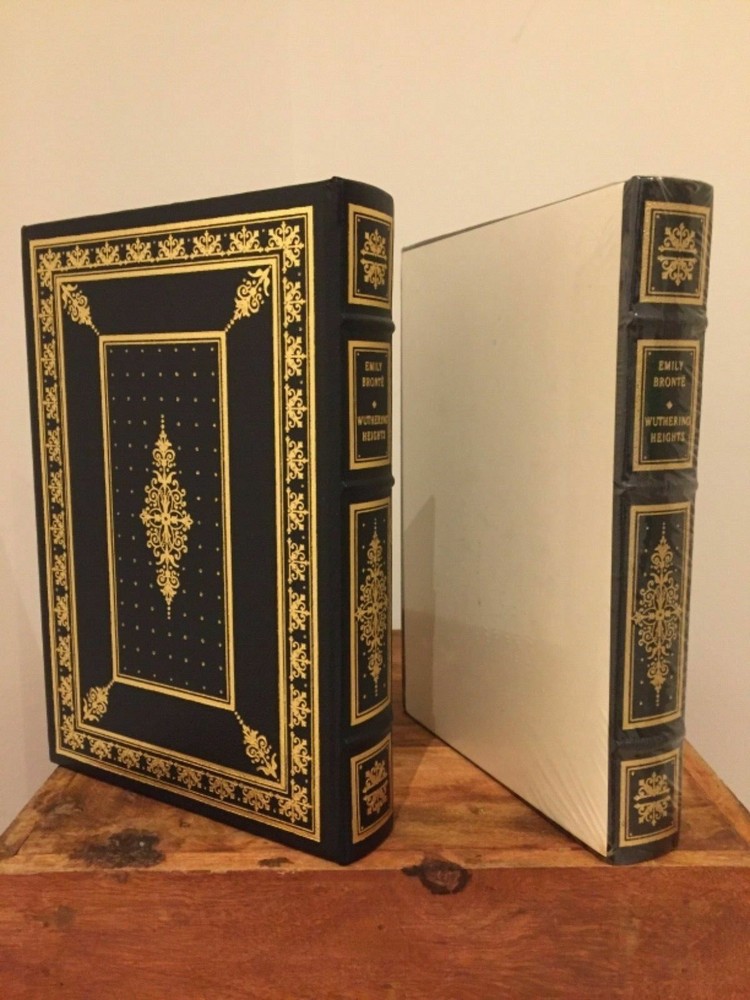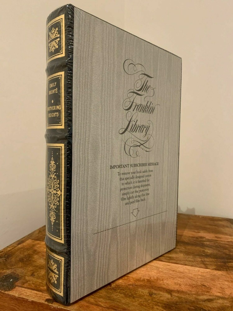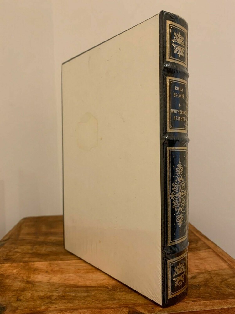 This is full genuine leather bound in new and sealed condition, never opened or read. The first photo includes my own copy shown here for exemplification only. This book is the perfect find, perhaps the last one to be found in plastic wrap. It laid in waiting for nearly 40 years to find its unique loving owner. 'Wuthering Heights' by Emily Bronte is one of Franklin Library's "Oxford Library of The World's Great Books" series produced together with Oxford University Press, with wonderful attributes: •Fully and tightly bound in genuine leather. •22kt gold accents deeply inlaid on the "hubbed" spine and covers. •Heavy duty binding boards enhance the book’s durability. •Superbly printed on acid-neutral paper that lasts for generations. •Sewn pages – not just glued like ordinary books. •Handsome marbled end pages and a satin-ribbon page marker. •Gold gilded page ends. •Rigorous inspection at every stage ensured adherence to exacting standards and the highest quality. •Superb craftsmanship and commitment to quality. The appeal for collecting Franklin Library comes from having these attributes taken way further into the exquisite quality, durability and craftmanship, than Easton Press and Folio Society managed with their productions. This book will be shipped in a wooden box for perfect protection. It is of the rarest kind and needs to enjoy the best care. This book is the perfect companion out on a park bench with a hot cup of coffee or snuggled up in front of the fireplace. Despite its all-inclusive nature it still feels very light and compact at a size of 4 x 16 x 25cm. Wonderful to hold and excellent reading experience.