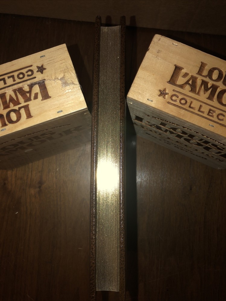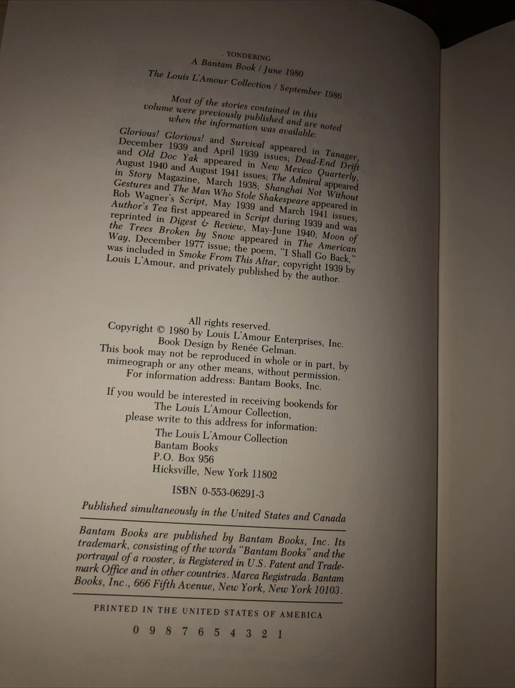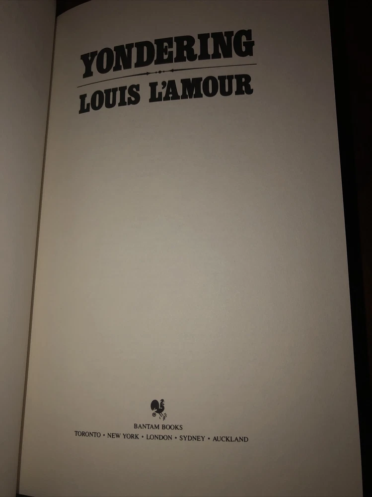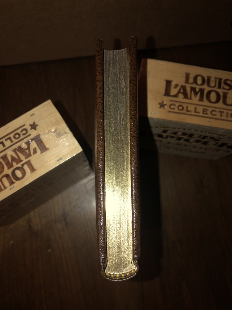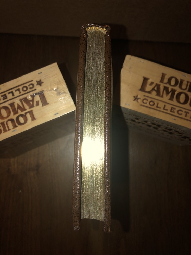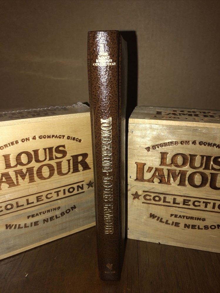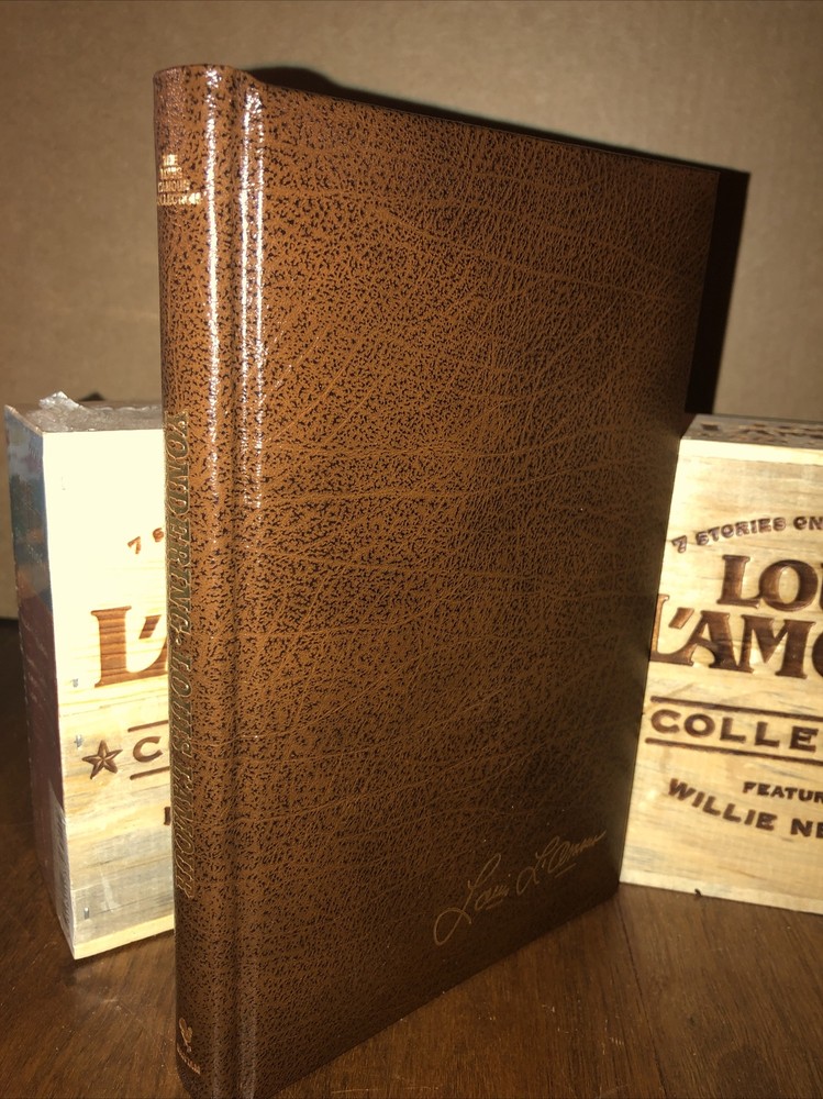 YONDERING Louis L’Amour GENUINE LEATHER Edition novel. Deluxe edition with gold gilt page edges. “Smell the leather, experience the West” A wonderful collection of stories from L'Amour's knockabout years. The war stories""Glorious,"" ""A Friend of the General,"" and ""Where there is Fighting"" are worth the price of the book. Far East stories ""The Man who Stole Shakespeare,"" and ""The Admiral"" demonstrate the softer side of tough, hardened men. See photos for table of contents. Features Introduction and Author’s Note with each story. The Louis L’Amour Collection is a subscription books series that contains 122 books of fiction, non-fiction, poetry, biography and more. Shipped securely wrapped and in a box. This volume will not be damaged in the mail. Shipping is $3.27 for first book. Media Mail rates.