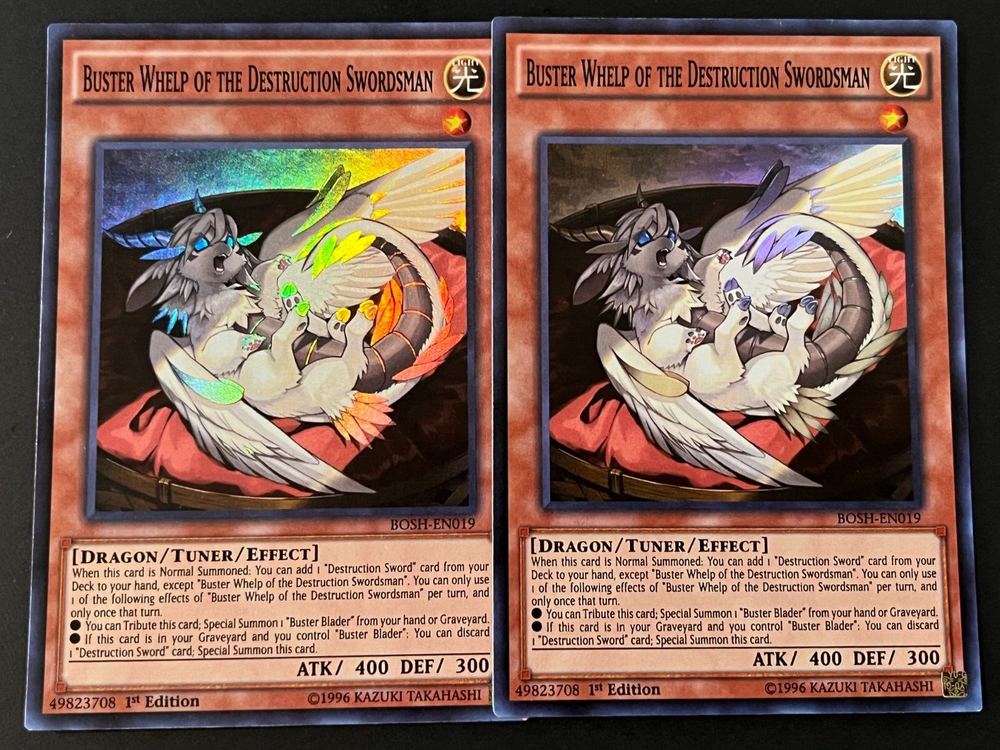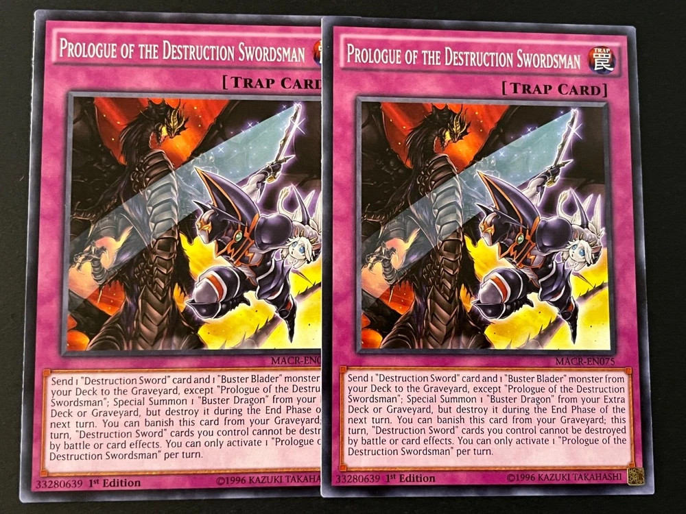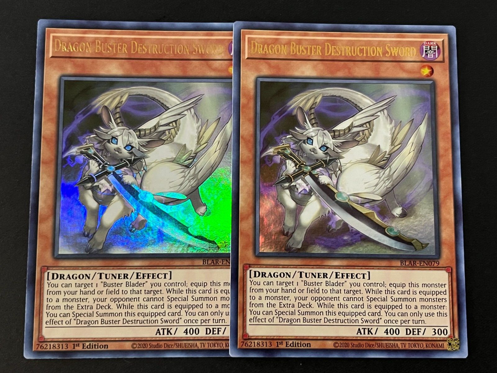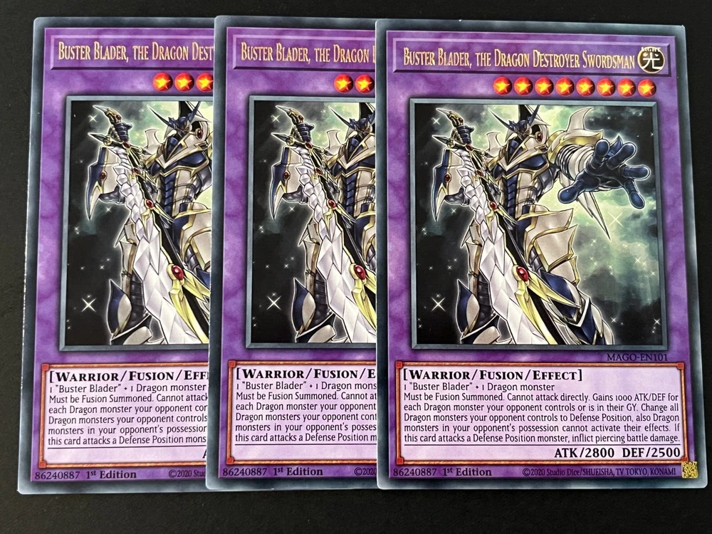 MONSTERS: 2X BUSTER BLADER, THE DESTRUCTION SWORDSMAN (ULTRA RARE) 2X BUSTER WHELP OF THE DESTRUCTION SWORDSMAN (SUPER RARE) 1X BUSTER BLADER (COMMON) 2X DRAGON BUSTER DESTRUCTION SWORD (ULTRA RARE) 2X ROBOT BUSTER DESTRUCTION SWORD (COMMON) 2X WIZARD BUSTER DESTRUCTION SWORD (COMMON) 1X DARK ARMED DRAGON (ULTRA RARE) 2X SKILLED WHITE MAGICIAN (COMMON) 1X ECLIPSE WYVERM (SUPER RARE) 1X DARKFLARE DRAGON (ULTRA RARE) 1X LIGHTPULSAR DRAGON (GOLD RARE) 1X DARK ARMED DRAGON (ULTRA RARE) 1X KAISER GLIDER GOLDEN BURST (SECRET RARE) 1X SELEGLARE THE LUMINOUS LUNAR DRAGON (PRISMATIC SECRET RARE) 1X DIVINE DRAGON LORD FELGRAND (ULTRA RARE) 1X ARKBRAVE DRAGON (ULTRA RARE) 1X EXPLODER DRAGON (GOLD RARE) 1X DARK MAGICIAN (ULTRA RARE) SPELLS: 1X EMBLEM OF DRAGON DESTROYER (COMMON) 2X DESTRUCTION SWORDSMAN FUSION (COMMON) 2X KARMA OF THE DESTRUCTION SWORDSMAN (COMMON) 1X POLYMERIZATION (ULTRA RARE) 1X RED-EYES FUSION (ULTRA RARE) TRAPS: 2X PROLOGUE OF THE DESTRUCTION SWORDSMAN (COMMON) 2X DESTRUCTION SWORD FLASH (COMMON) 3X DESTRUCTION SWORD MEMORIES (COMMON) 3X DNA SURGERY (COMMON) 2X TYRANT WING (COMMON) 1X ICE DRAGON'S PRISON (SUPER RARE) EXTRA DECK: 3X BUSTER BLADER, THE DRAGON DESTROYER SWORDSMAN (GOLD RARE) 3X BUSTER DRAGON (ULTRA RARE) 1X STARDUST DRAGON (RARE) 1X BRIONAC, DRAGON OF THE ICE BARRIER (ULTRA RARE) 1X VERMILLION DRAGON MECH (ULTRA RARE) 1X RED-EYES DARK DRAGOON (ULTRA RARE) 1X DARK PALADIN (DUAL TERMINAL ULTRA RARE) 1X RED-EYES FLARE METAL DRAGON 2X PROTECTOR WHELP OF THE DESTRUCTION SWORDSMAN (ULTRA RARE) 1X SARYUJA SKULL DREAD (ULTRA RARE)
