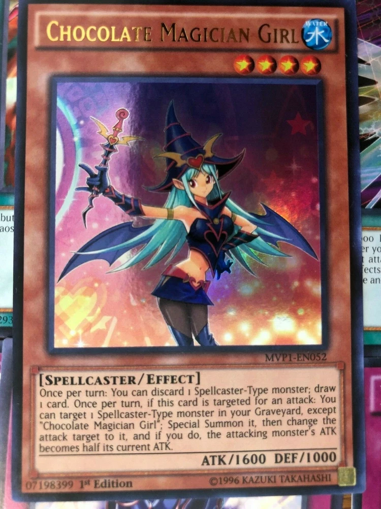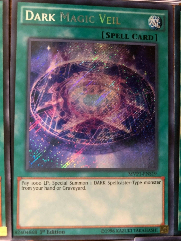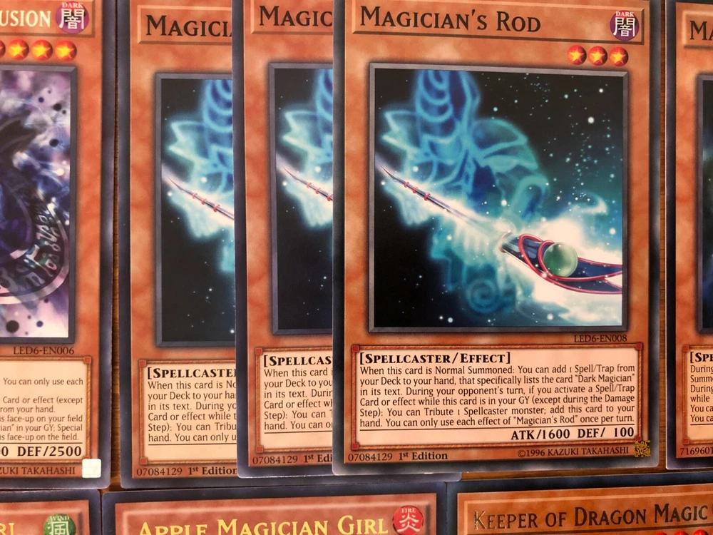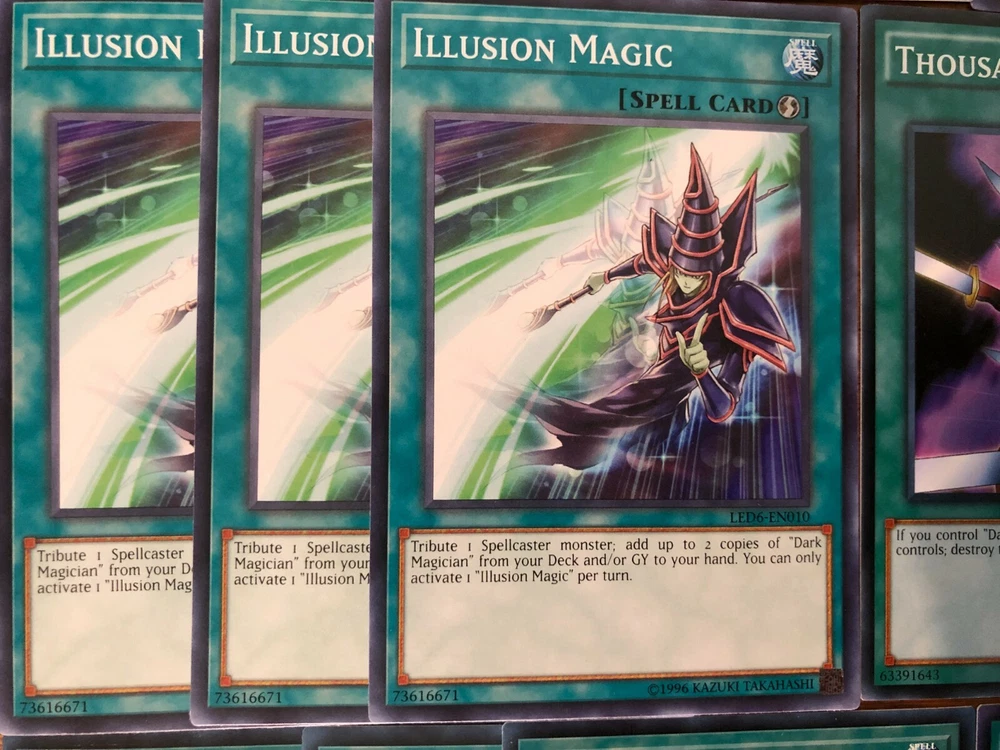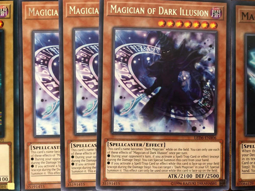 MONSTERS: 3X DARK MAGICIAN (COMMON) 3X MAGICIAN OF DARK ILLUSION (RARE) 3X MAGICIAN'S ROD (COMMON) 3X MAGICIAN'S ROBE (COMMON) 1X DARK MAGICIAN OF CHAOS (RARE) 1X DARK MAGICIAN GIRL (COMMON) 1X CHOCOLATE MAGICIAN GIRL (ULTRA RARE) 1X BERRY MAGICIAN GIRL (ULTRA RARE) 1X KIWI MAGICIAN GIRL (ULTRA RARE) 1X LEMON MAGICIAN GIRL (ULTRA RARE) 1X APPLE MAGICIAN GIRL (ULTRA RARE) 1X KEEPER OF DRAGON MAGIC (RARE) SPELLS: 3X DARK MAGICAL CIRCLE (COMMON) 3X DARK MAGIC ATTACK (COMMON) 1X THE EYE OF TIMAEUS (COMMON) 3X ILLUSION MAGIC (COMMON) 3X THOUSAND KNIVES (COMMON) 2X DARK MAGIC EXPANDED (COMMON) 1X DARK MAGIC VEIL (SECRET RARE) 1X DARK MAGIC CURTAIN (COMMON) 2X SPELLBOOK OF KNOWLEDGE (COMMON) 3X SECRET VILLAGE OF THE SPELLCASTERS (COMMON) 1X DEDICATION THROUGH LIGHT AND DARKNESS (COMMON) 1X DIFFUSION WAVE-MOTION (COMMON) 1X SPELLBOOK OF WISDOM (COMMON) 2X WONDER WAND (COMMON) 1X ONE-SHOT WAND (COMMON) 1X SPELLBOOK OF POWER (COMMON) TRAPS: 1X MAGIC DRAIN (COMMON) 3X MAGICIAN NAVIGATION (RARE) 1X ETERNAL SOUL (ULTRA RARE) 1X DARK RENEWAL (COMMON) EXTRA DECK: 1X EBON HIGH MAGICIAN (ULTRA RARE) 1X NUMBER 74 MASTER OF BLADES (RARE) 1X DARK PALADIN (COMMON) 1X AMULET DRAGON (COMMON) V1