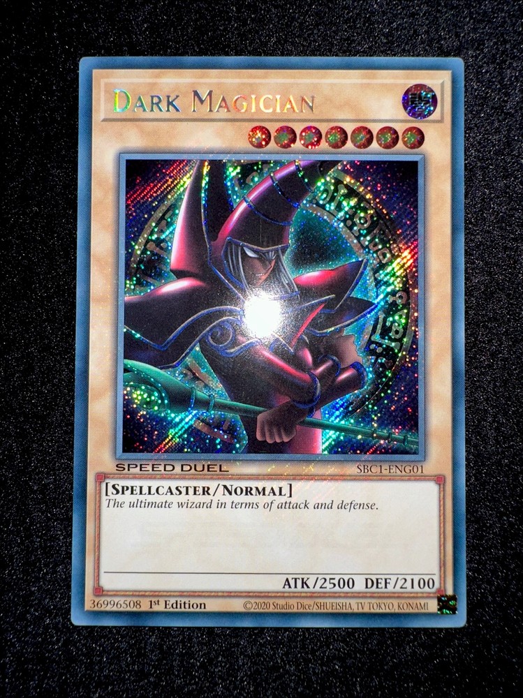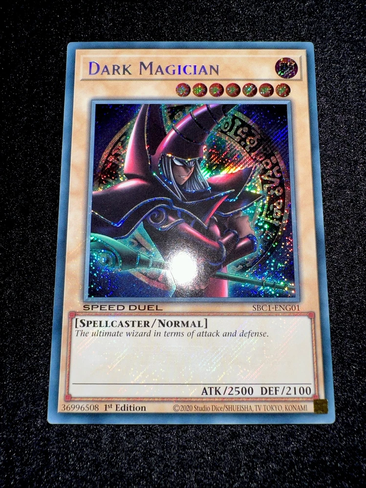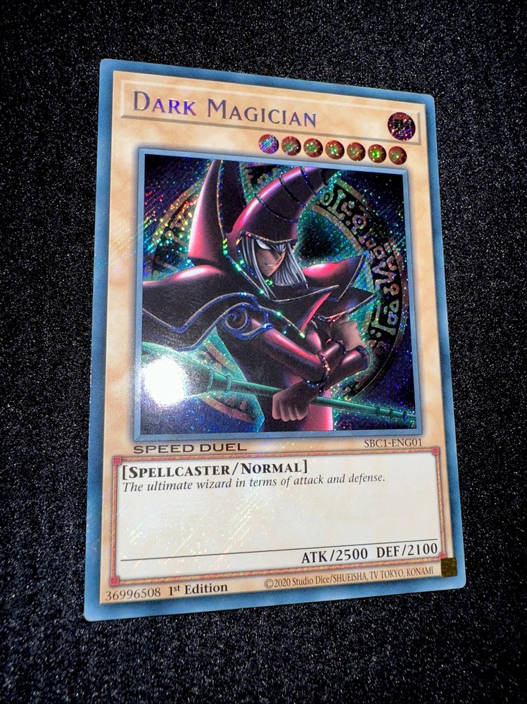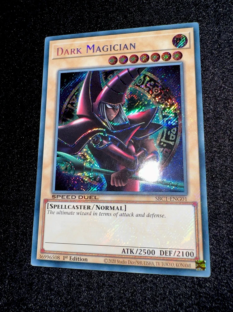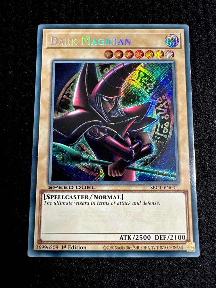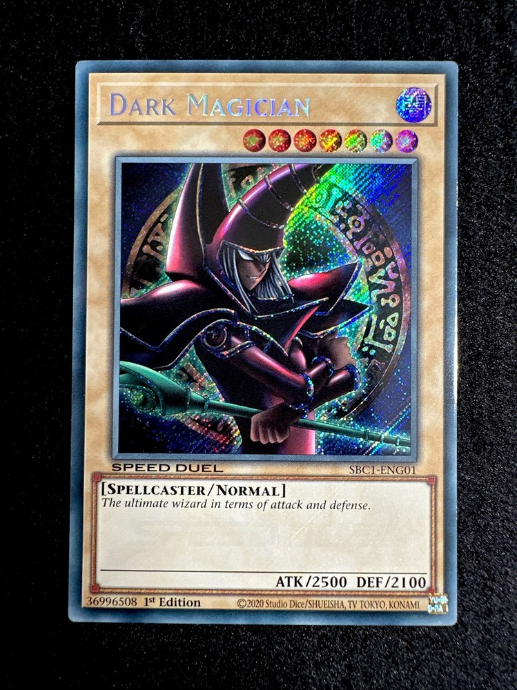 🔥YUGIOH • DARK MAGICIAN • SECRET RARE • SBC1-ENG01 • 1st EDITION • VLP🔥 Card Sleeve Included + Top Loader • VERY LIGHTLY PLAY CARD • Authentic Konami USA Version YOU ARE GUARANTEED TO GET THE CARD NAMED IN THE TITLE. Thank you.