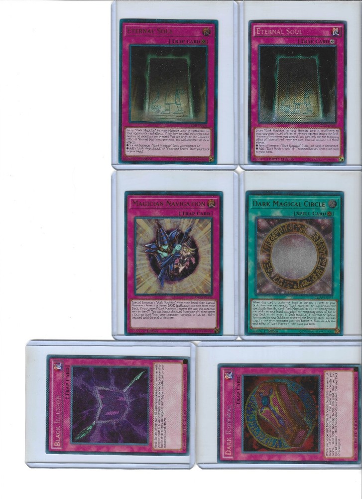 Featured here are 3 secret rare and 3 ultra rare support cards needed for any Dark Magician deck. Included Are: Eternal Soul (SeR) Eternal Soul (UR) Magician Navigation (UR) Dark Magical Circle (UR) Black Illusion (SeR) Dark Renewal (SeR)