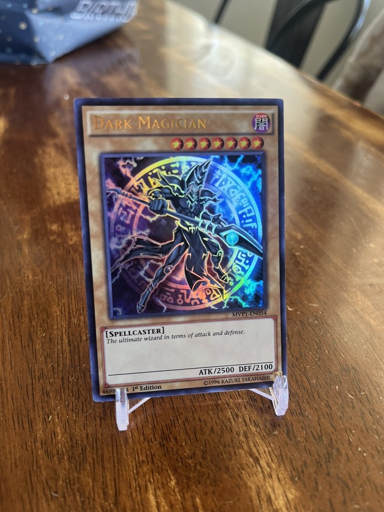 This Yu-Gi-Oh! TCG card features the powerful Spellcaster creature Dark Magician in Ultra Rare rarity with a stunning Holo finish. It is a must-have for any collector or player looking to bolster their deck. The card's name is prominently displayed and its Attribute is Darkness. This Dark Magician card is ungraded but is in near mint condition, making it a valuable addition to any collection. It belongs to the category of Toys & Hobbies and Collectible Card Games, specifically CCG Individual Cards. Add this MVP1-ENSV3 card to your collection today!