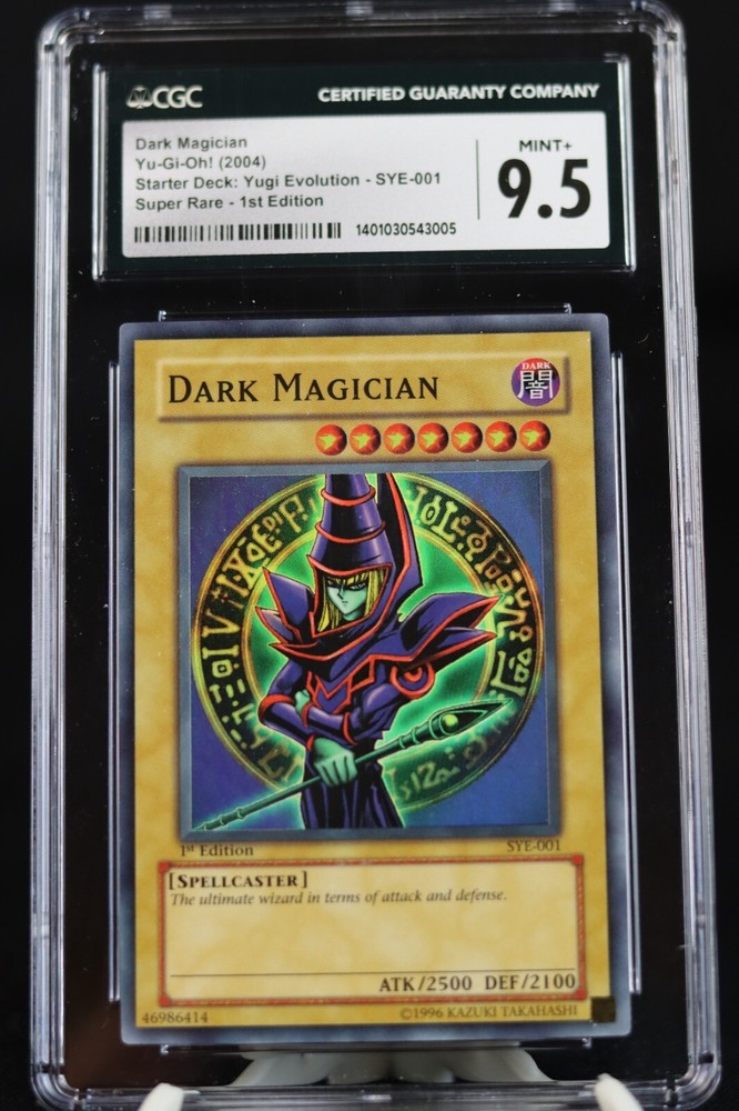 The iconic 1st Edition, Dark Magician from the Yu-Gi-Oh deck, Starter Deck Yugi Evolution (SYE-001), is one of the most sought-after cards in the game's history. This vintage card has been professionally graded in MINT condition! This card is an absolute gem for collectors and Yu-Gi-Oh enthusiasts alike. Key Details: Card Name: Dark Magician Set: Starter Deck Yugi Evolution (SYE) Version: English Card Number: SYE-001 Edition: 1st Edition Rarity: Super Rare Grading: CGC 9.5 (Certification Number: 1401030543005) Condition: This Dark Magician is in MINT condition, earning a CGC grade of 9.5. I began watching the show and collecting the cards 20 years ago. These cards were a staple part of my childhood and have been carefully handled, preserved, and archived all of these years. Shipping: The card will be securely packaged to ensure its safe arrival to its new home using USPS Priority Mail . We offer fast and reliable shipping with tracking to keep you informed throughout the process. *If you have any questions or need additional photos, feel free to contact me.*