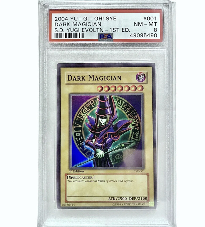 YU-GI-OH! Dark Magician SYE-001 1st Edition Yugi Evolution Deck PSA 8 Yugioh RARE You will be getting exact card shown in picture. Sealed in an exact fit poly bag with tamper proof seal. Selling as is as pictured, please see all pictures for condition. Please ask any questions before buying. Thanks.