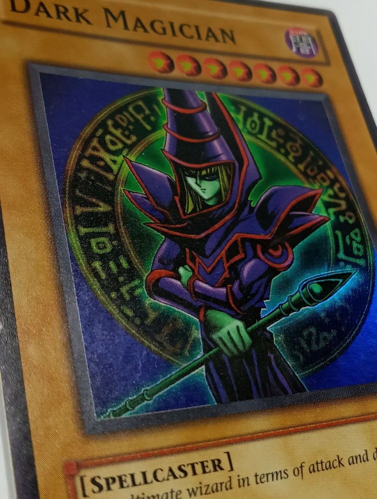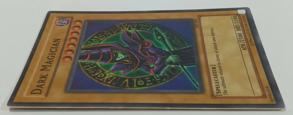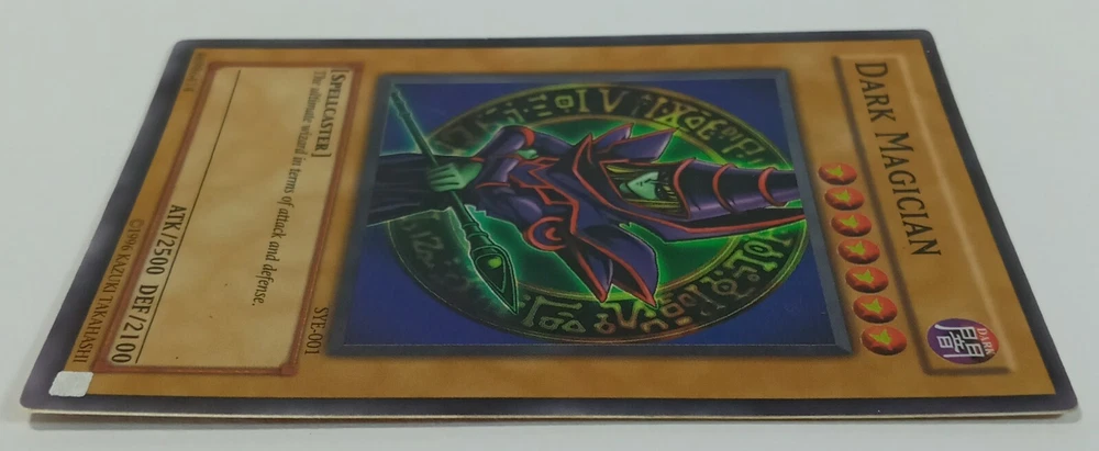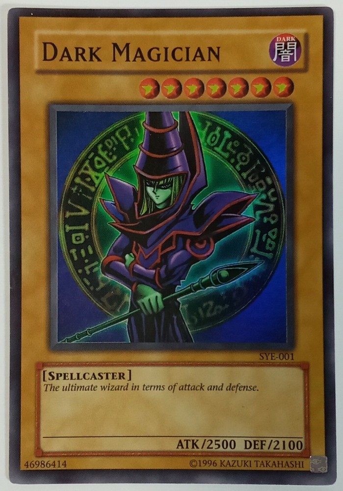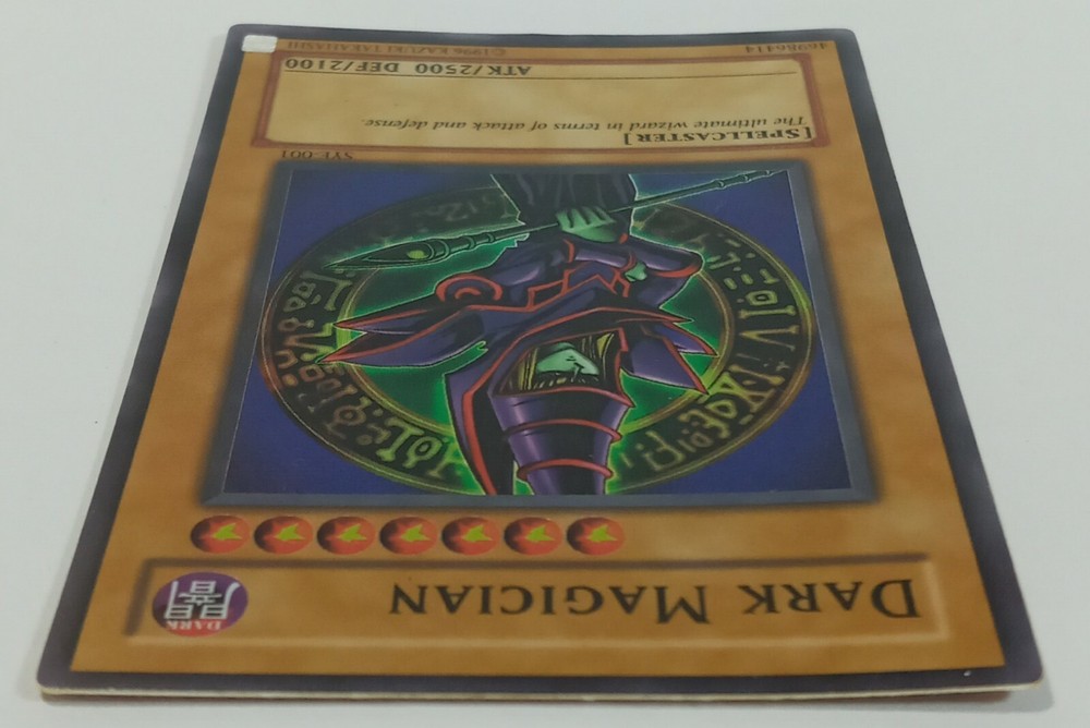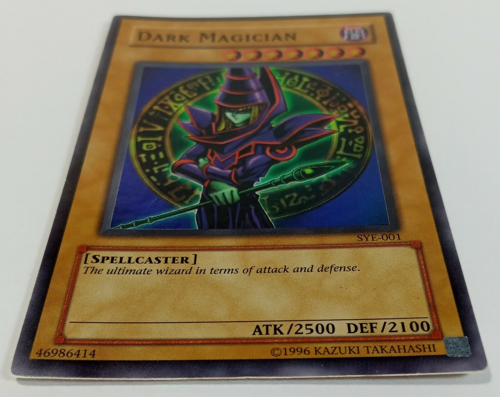 This is a rare vintage 1996 Yu-Gi-Oh! Dark Magician card, featuring a holographic finish and English language. The card number is SYE-001, and it belongs to the Yugi set. It is a Normal creature/monster type card, and its attribute is Darkness. The card has been lightly played, but it is still a valuable addition to any collection. It was manufactured by T C G, and is part of the Yu-Gi-Oh! TCG game. This card is a must-have for any serious collector or Yu-Gi-Oh! player.