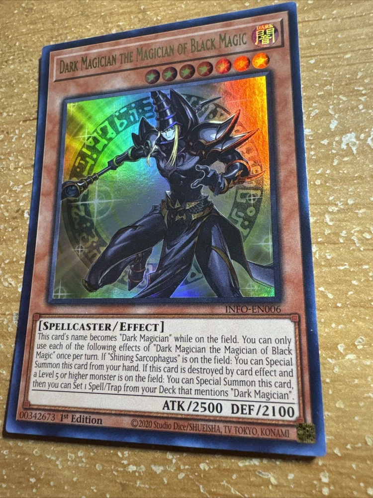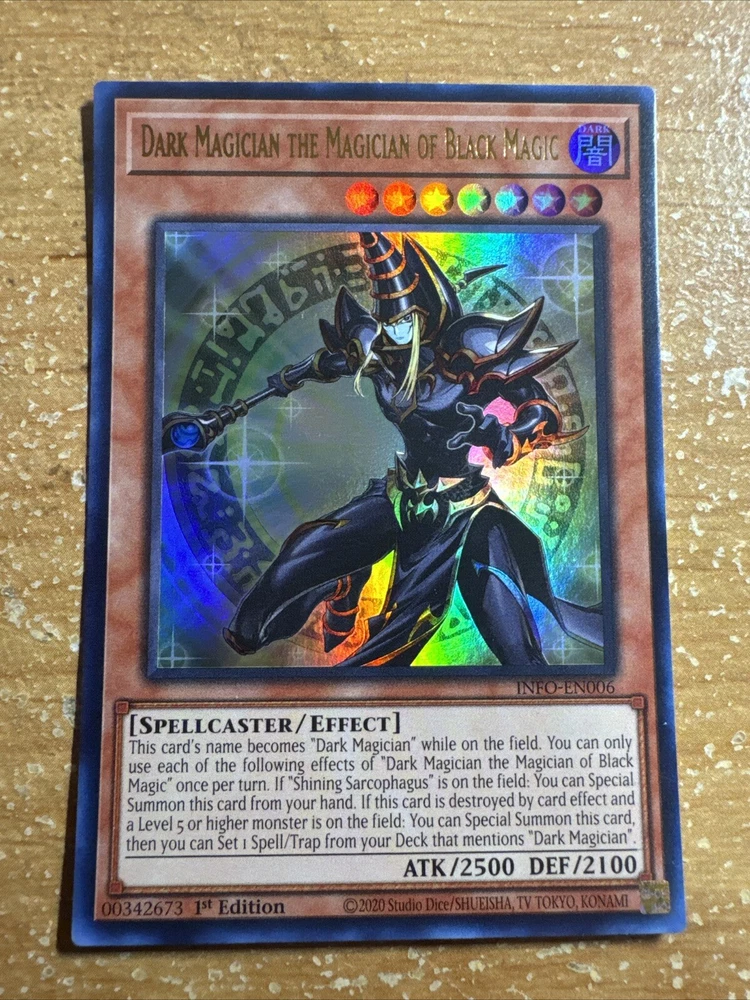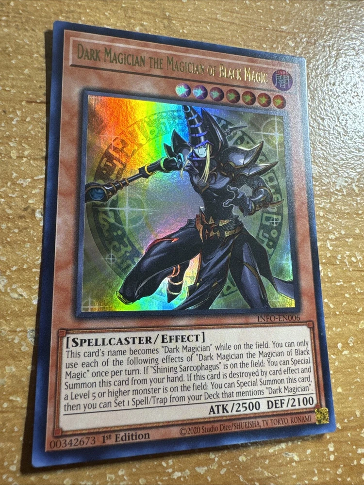 🔥 YUGIOH Dark Magician The Magician of Black Magic ULTRA RARE INFO-EN006 1ST ED This ultra rare Dark Magician card from the Yu-Gi-Oh! TCG game is a must-have for any collector. With its black color and magical design, it's sure to impress. The card name, Dark Magician, speaks for itself as a powerful and sought-after addition to any deck. This card is in its original 1st edition and is a valuable addition to any collection. Don't miss out on the opportunity to own this rare and coveted card. This item will be sent in a plastic sleeve/deck protector sleeve and in a toploader for maximum protection. Shipping is FREE! Payment is due immediately. The faster the payment the faster i'll ship out. Questions or comments?? Feel free to contact me. I'll get back to you within 24 hours. Check out my eBay store for more Yugioh items!