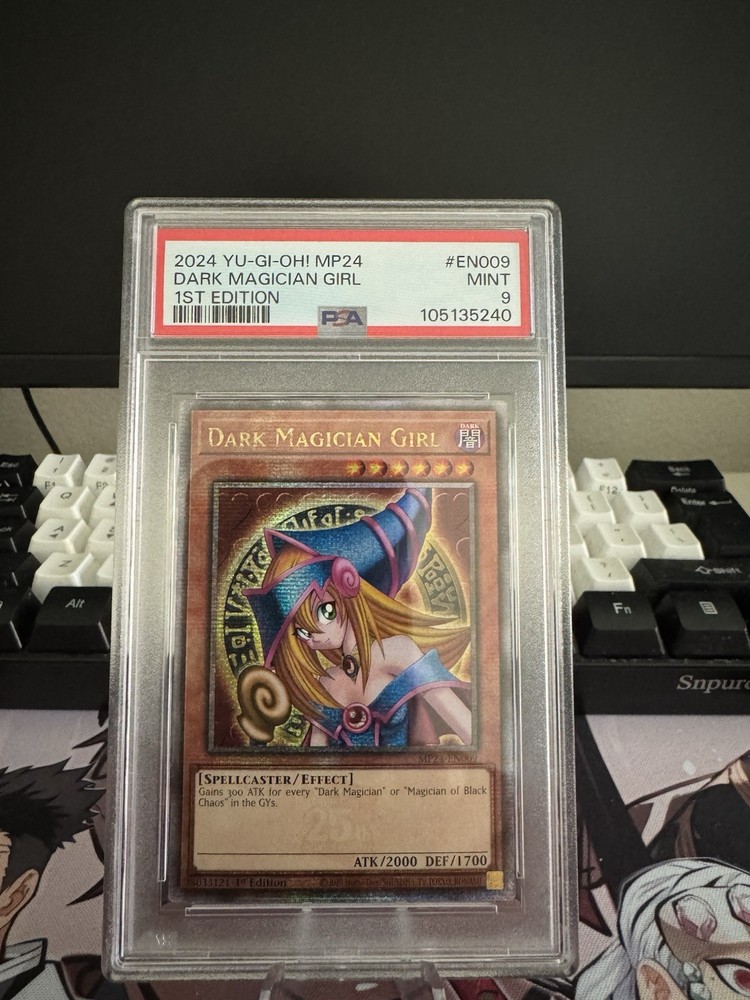 Elevate your Yu-Gi-Oh! TCG collection with the enchanting Dark Magician Girl card, a must-have for spellcaster enthusiasts and serious collectors alike. This Secret Rare card, numbered MP24-EN009, features a holographic finish that captures the essence of its dark magic, rendered in exquisite detail by Konami. Graded a PSA 9, this card is a testament to superior card stock quality and preservation, ensuring its value and longevity. The card is presented in English, adhering to the Japanese card size standard, and is suitable for those aged 6 and up. Cherish the mystical allure of this 1st Edition Dark Magician Girl, a shining gem from the Professional Sports Authenticator's grade list.