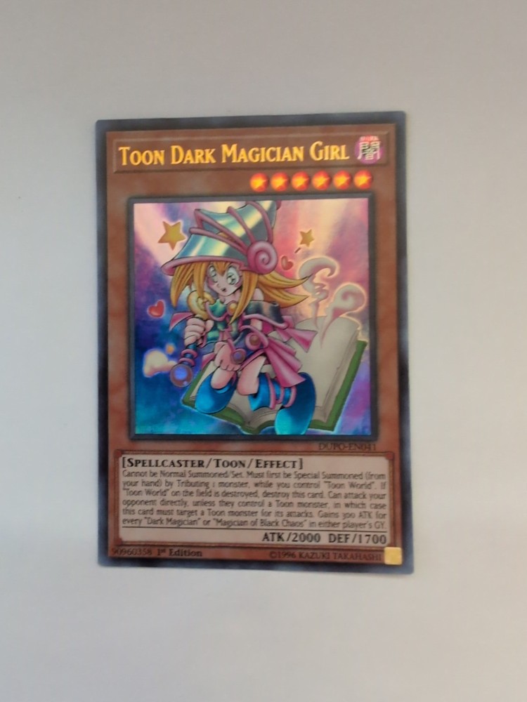 The YUGIOH! Toon Dark Magician Girl DUPO-EN041 Ultra Rare 1st Edition NM card is a sought-after collectible within the Yu-Gi-Oh! TCG community. This Japanese-sized card features the iconic characters Yami Yugi, Seto Kaiba, and Yugi Muto, making it a must-have for fans of the game. With its dark attribute, spellcaster creature type, and holo finish, this English-language card from Konami is a powerful addition to any collection. Its rarity as an ultra rare 1st edition card adds to its value and appeal among collectors and players alike.