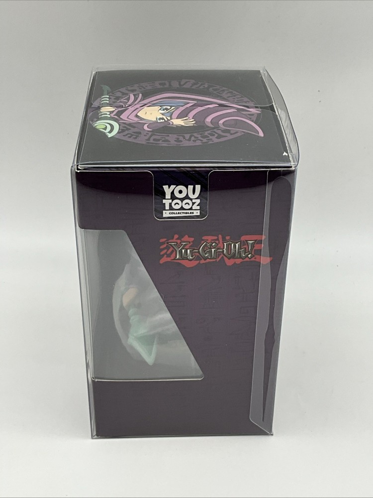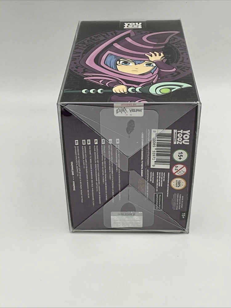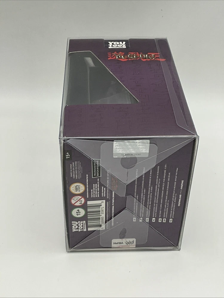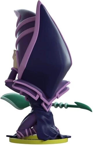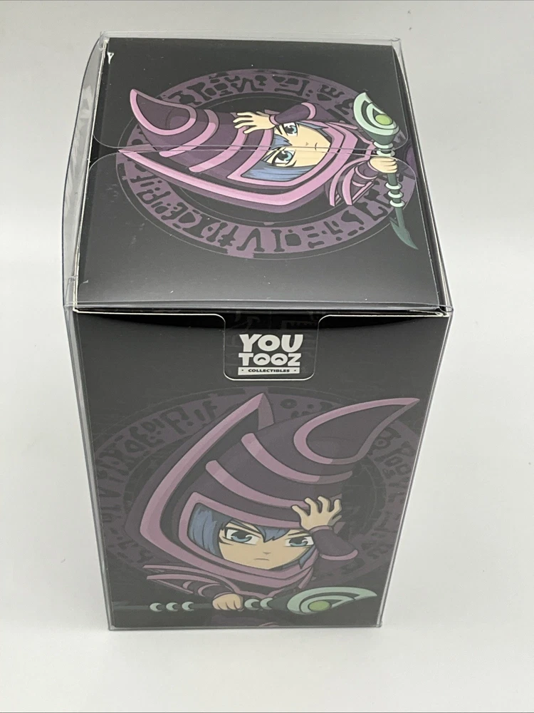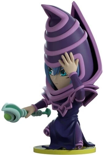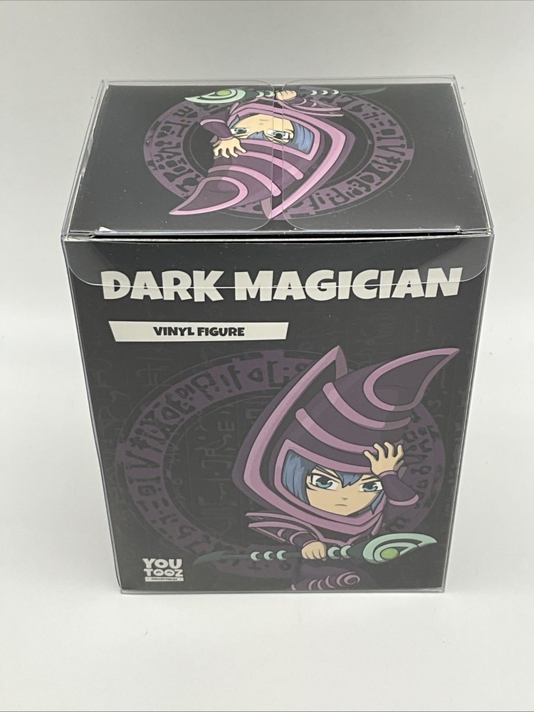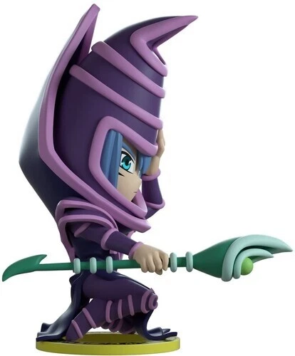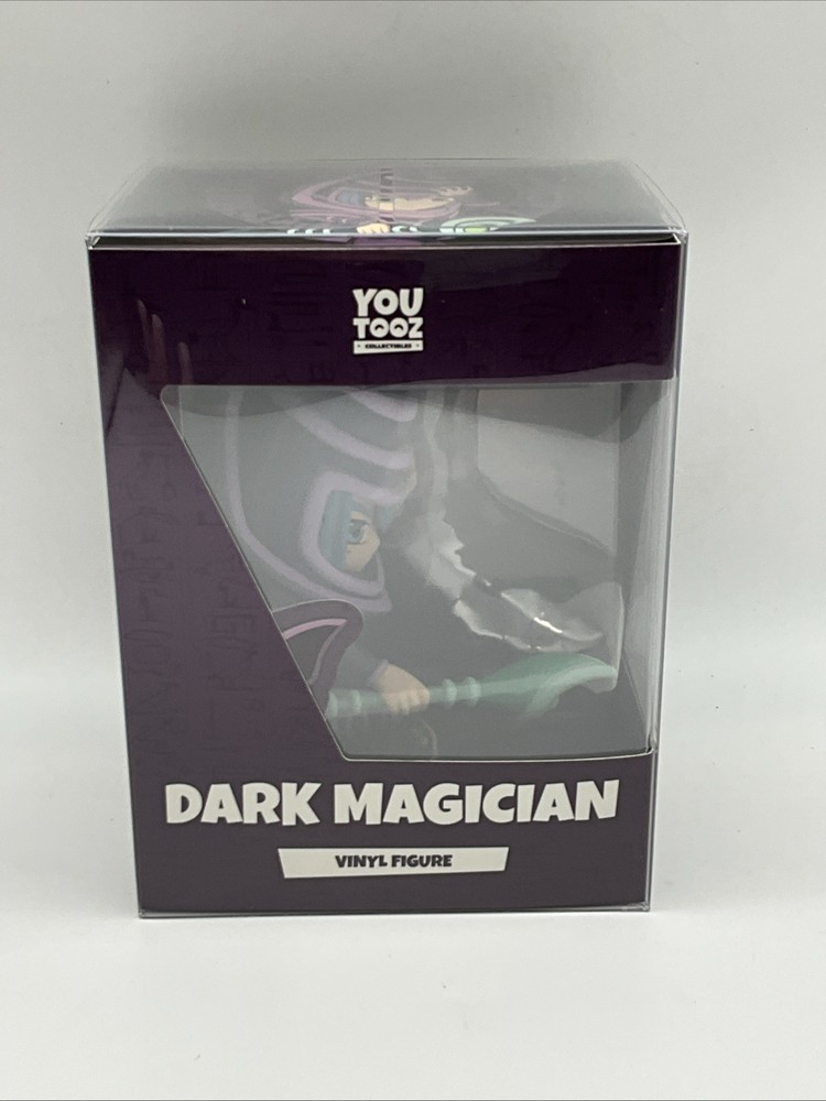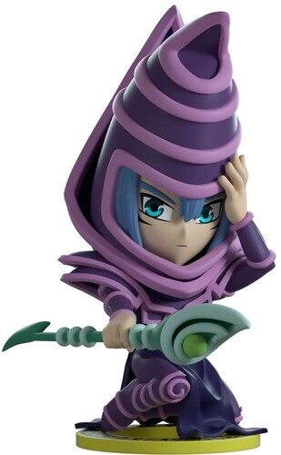 Dark Magician enters Youtooz in the attack mode! Kneeling at 5 inches tall with his long green staff pointed forward readying a masterful spell, he holds onto the hood of his purple robe that raises up into a point. With a look of determination crossing his face, blue hair pokes through the opening of his hood, while his pointed robe at chest piece sit over a flowing purple cape that pulls away from his arms and legs which are covered in a tight purple material and are adorned with intricate swirling patterns. The exterior of his packaging sees Dark Magician with his arms outstretched in front of a blast of blue light. While the interior is deep purple with strings of hieroglyphs that work their way onto the protective packaging, where he poses in front of a circular purple seal while his figure is seen through the large clear window at its front. This collectible ships in a matte, embossed, protective outer sleeve and a custom sized plastic protector for maximum protection during shipping. $7.50 Flat Rate Shipping