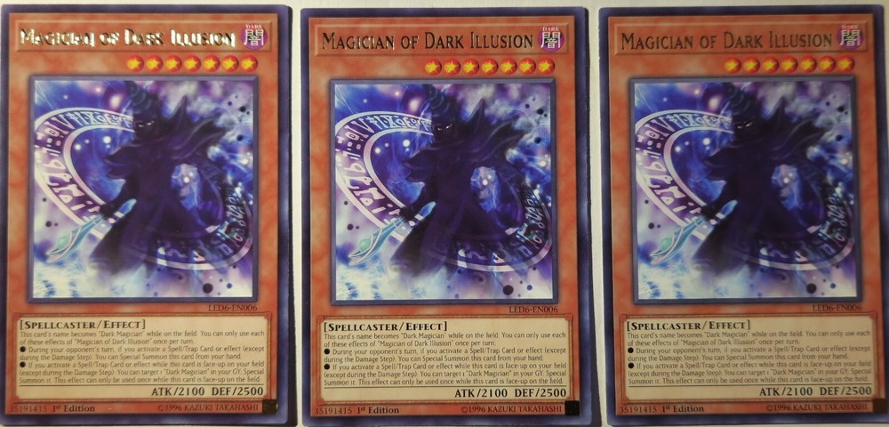 The product is a rare 1st edition Yu-Gi-Oh trading card from the set "Legendary Duelists: Magical Hero". The card is a Spellcaster type with an Attack/Power of 2100 and a Defense/Toughness of 2500. It is named "Magician of Dark Illusion" and belongs to the Dark attribute. Manufactured by Konami, this English-language card is part of the Yu-Gi-Oh TCG and features the attributes and stats listed above.