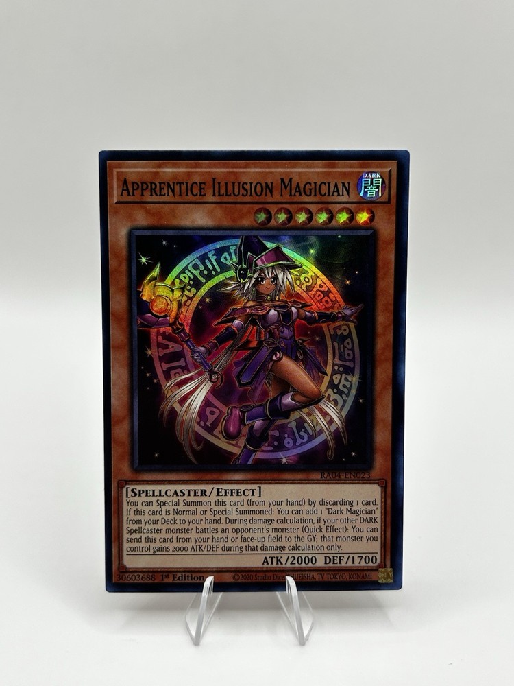 Add the powerful Apprentice Illusion Magician to your Yu-Gi-Oh! TCG collection. This Ultra Rare card from the Quarter Century Stampede set features a Spellcaster creature/monster type with an attack/power of 2000 and a defense/toughness of 1700. The card is a 1st Edition and has a foil finish, making it a great addition to any collection. The card can be used in conjuction with other Yu-Gi-Oh! TCG cards to create powerful spell effects. It is in English and has a card number of RA04-EN023. The card features popular characters Mokuba Kaiba, Yami Yugi, and Joey Wheeler. Don't miss out on the opportunity to own this rare card.