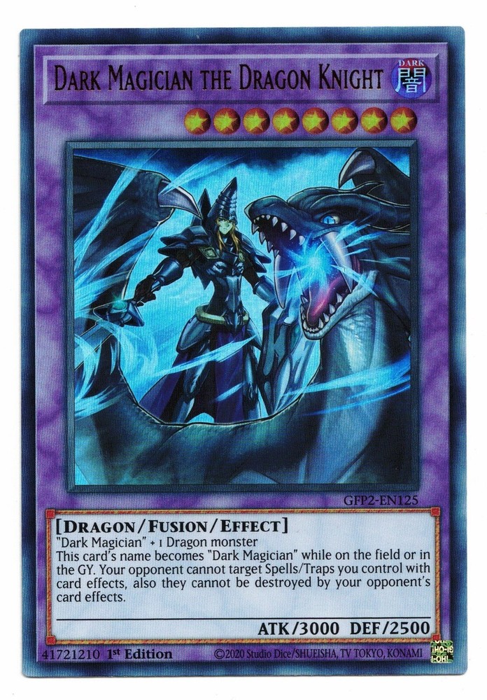 This listing is for a great Yu-Gi-Oh! Card. You get: Dark Magician the Dragon Knight GFP2-EN125 Ultra Rare 1st Edition! This card is in Near Mint Condition. Actual card pictured, please see scan for details. WE COMBINE SHIPPING! ORDER TOGETHER TO SAVE! CONDITION DEFINITIONS: Mint : A perfect or virtually perfect card. We do not sell cards as Mint in order to ensure customer satisfaction. Near Mint : May have some very light edge wear and/or scratching. Excellent : Edge wear and/or scratches becoming more noticeable. May have a few light indentations. Good : Shows signs of play. Has bends, scratches, indentations, minor creases, and/or increasing edge wear. Played : Severe bends, creases, edge wear and/or scratches. Damage is extremely noticeable. POKEMASTER.CARDS SALES INFORMATION: History/Background We specialize in high quality collectibles with great prices, accurate descriptions, and super fast shipping. With thousands of items sold, you can be confident that you will be very happy with your purchase! We add new items all the time, be sure to add us to your Favorite Sellers List. Click the "Save this seller" link above or in our store! Shipping Information Cards are safely packed in a protective plastic sleeve, wrapped in a packing slip, and then reinforced with cardboard and tape. Most cards are shipped via USPS First Class Mail, which usually arrives quickly (within 3-6 business days). WE COMBINE SHIPPING! Be sure to order items together to save big! Customer Service As you can see from our great feedback, we work very hard to ensure that EVERY customer is fully satisfied. Please contact us with ANY concerns BEFORE leaving feedback and we will promptly address any issue. We want 5 STARS in every category and will do what it takes to earn them.
