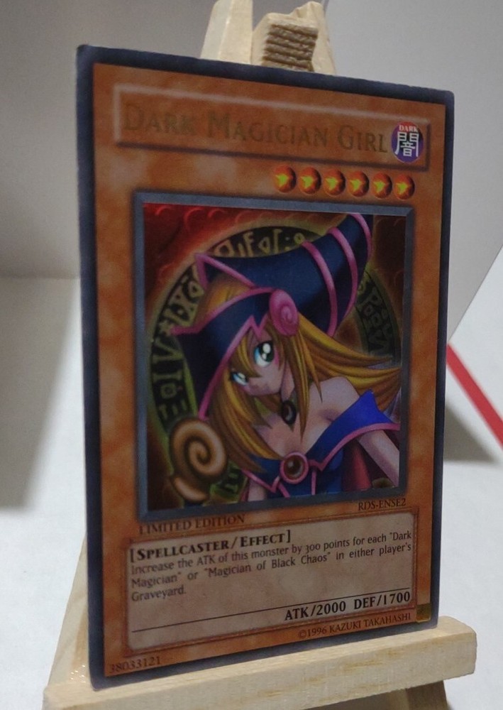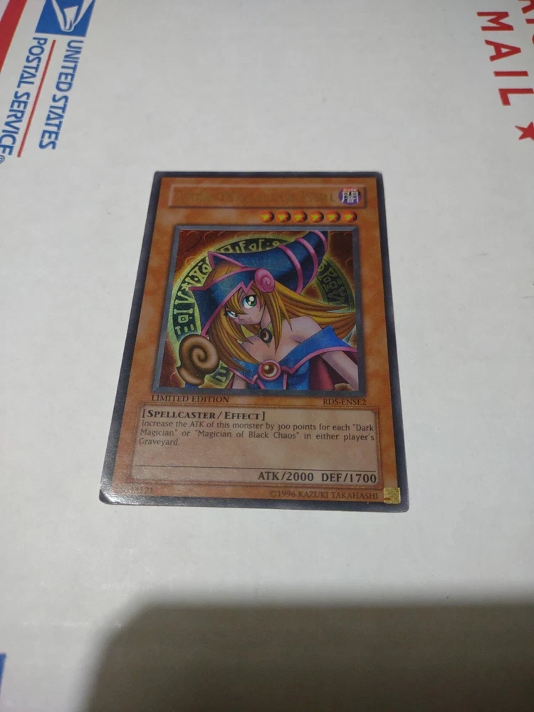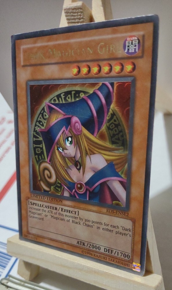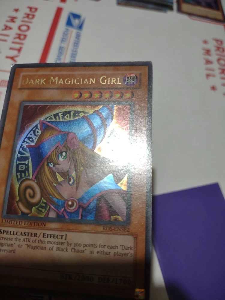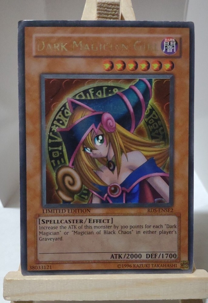 This Yu-Gi-Oh card features Yami Yugi's second favorite monster, Dark Magician Girl. It is a limited edition card from the Rise of Destiny Special Edition set. The card is in foil finish and is ultra-rare. It has a standard size and is in English language. The card's attribute is Dark and its type is a Spellcaster. The card has a power of 2000 and a defense of 1700. It is an effect card and has the card number RDS-ENSE2. This card is perfect for collectors and fans of the Yu-Gi-Oh TCG. See pictures for the condition of this item. Thank you