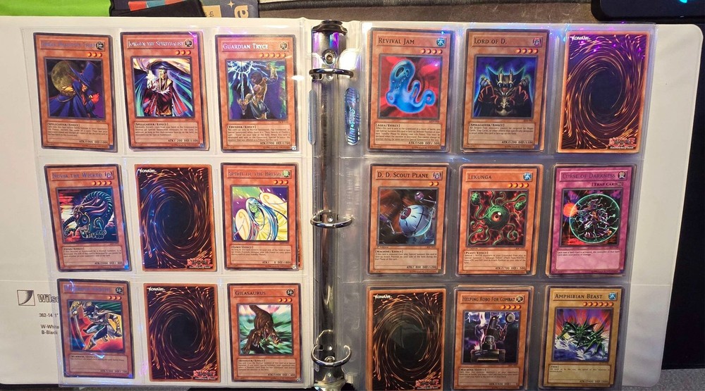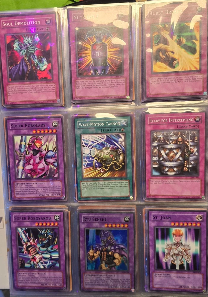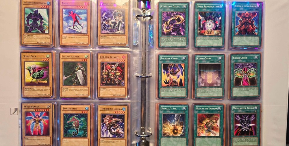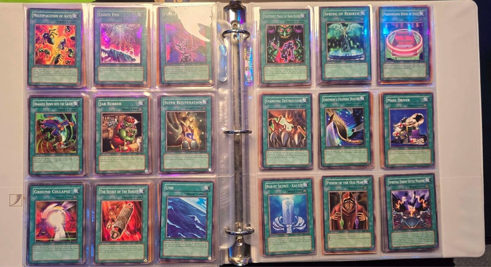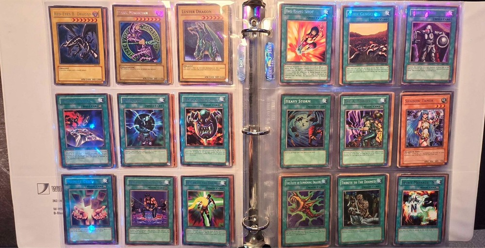 You are bidding on a binder full of Yu-Gi-Oh cards, varying from different sets. Some first editions, rares, Holos, commons. Roughly 250 cards (Some doubles). Not every slot in each page is filled, I believe those slots were for my deck I had used at the time which is why they are empty. Some slots do have multiple doubles in them though as well. Some cards of note that I notice would be: Dark Magician Red-Eyes B. Dragon Heavy Storm Mask of Restrict Destruction Ring + More! Card value varies, but lowest card value in the set is about $1 . I personally do not have the time to piece out each card individually so will list here in bulk if someone else wants to do so, or just collect for themselves. Item will ship via USPS within 3 business days of payment. All sales absolutely final with no returns.