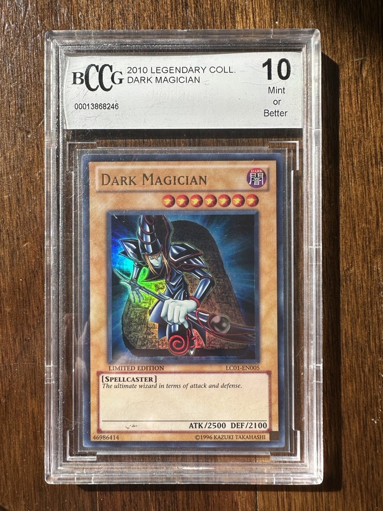 This Yu-Gi-Oh Dark Magician card from the 2010 Legendary Collection is a highly sought-after limited edition card. It features the iconic character Dark Magician in stunning detail and is graded 10 by the Beckett Collectors Club Grading (BCCG). The card is part of the Yu-Gi-Oh! TCG and is a monster card with the attribute of darkness. The card comes in its 1st edition and is a rarity in the collectible card games category. The card is in English and manufactured by Konami. It is suitable for ages 10+ and is a must-have for fans of the Yu-Gi-Oh! franchise. The card is perfect for adding to a collection or for use in gameplay.