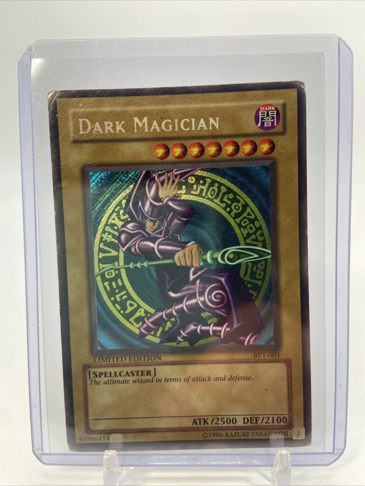 This limited edition Yu-Gi-Oh! card features the iconic Dark Magician, Yami Yugi, and Yugi Muto characters. The card is part of the - Yugi - set and was manufactured by Konami in 2002. It is a Japanese-sized, holo-finished monster card with the card number BPT-001. The card is vintage and comes in English language. The card is perfect for collectors of the Yu-Gi-Oh! Trading Card Game and features the Attribute/MTG:Color of Darkness. It is a must-have for fans of the game and the popular characters it includes. The card is secret rare and is part of the Limited Edition feature. Get your hands on this rare and valuable card today!