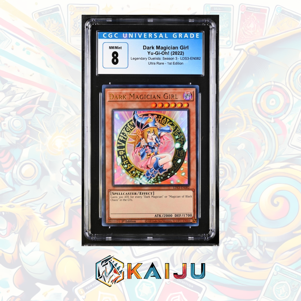 The product is a Rare 1st Edition Ultra Rare Dark Magician Girl card from the Yu-Gi-Oh! TCG, released in 2022. It features the Attribute of Darkness and is graded CGC 8....