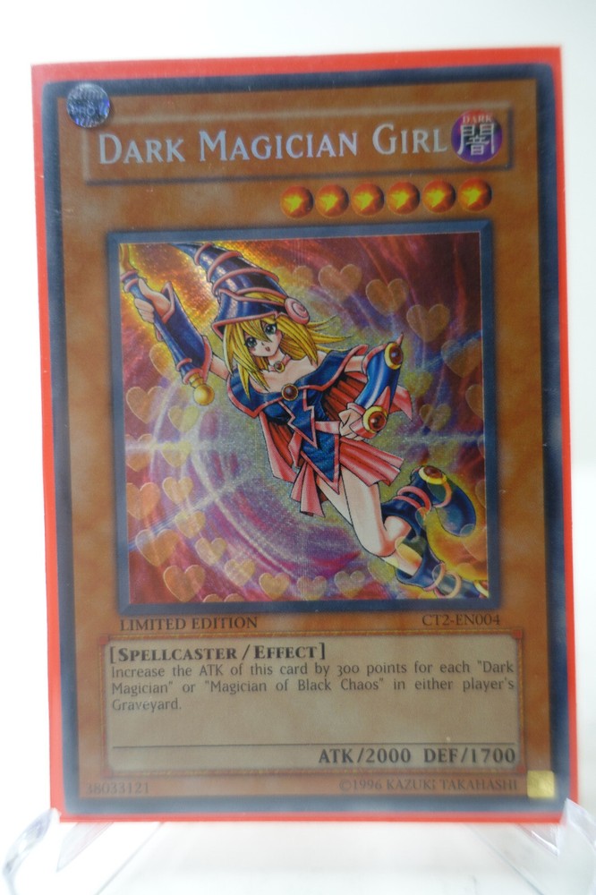 YuGiOh Dark Magician Girl - CT2-EN004 - Secret Rare - Limited Edition LP. A tin edition of the Dark Magician girl, only collected and largely unplayed. A grade worthy edition of the card that has lived in a sleeve and binder.