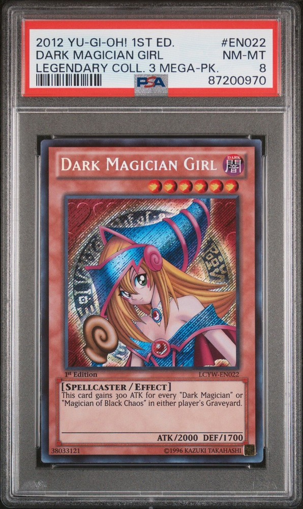 This Yu-Gi-Oh! Dark Magician Girl card is a must-have for any collector or player of the game. It features the iconic character of the same name from the popular anime series and is a Secret Rare 1st Edition card, which makes it a highly sought-after item. The card is graded by PSA with a score of 8, ensuring its authenticity and quality. The card is manufactured by Konami and is part of the Yu-Gi-Oh! TCG game. It is an Effect card with the card number LCYW-EN022 and is written in English. This card is perfect for anyone who wants to add a unique and rare card to their collection or deck.